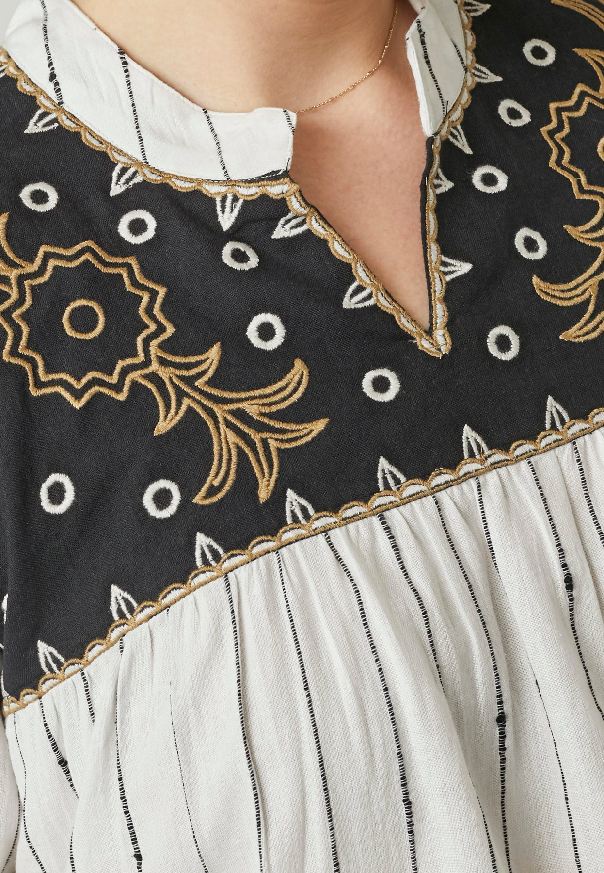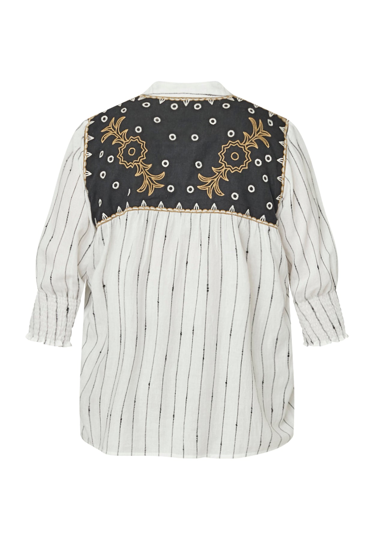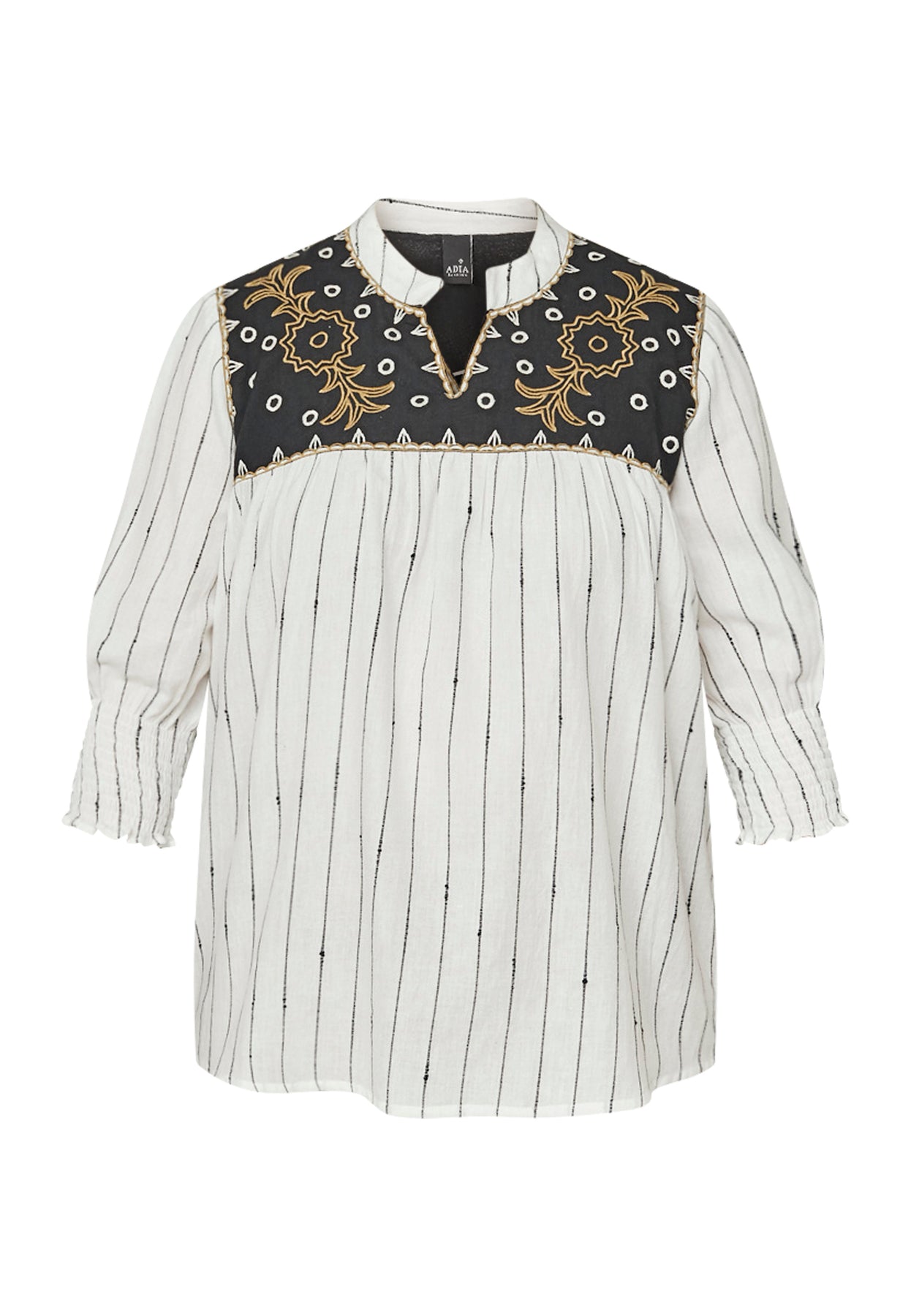 Denne skjorte fra ADIA har et feminint og moderne udtryk kombineret med en let og behagelig komfort. Den er fremstillet i 100% bomuld, som føles blød mod huden og giver et luftigt og naturligt fald. Skjorten har rund halsudskæring med en lille V-slids, 3/4-lange ærmer og en flatterende A-formet pasform, der falder let og behageligt omkring kroppen. De dekorative kontrastdetaljer ved bærestykket tilfører modellen et stilfuldt og iøjnefaldende udtryk, som gør den både anvendelig og nem at style til hverdagen.