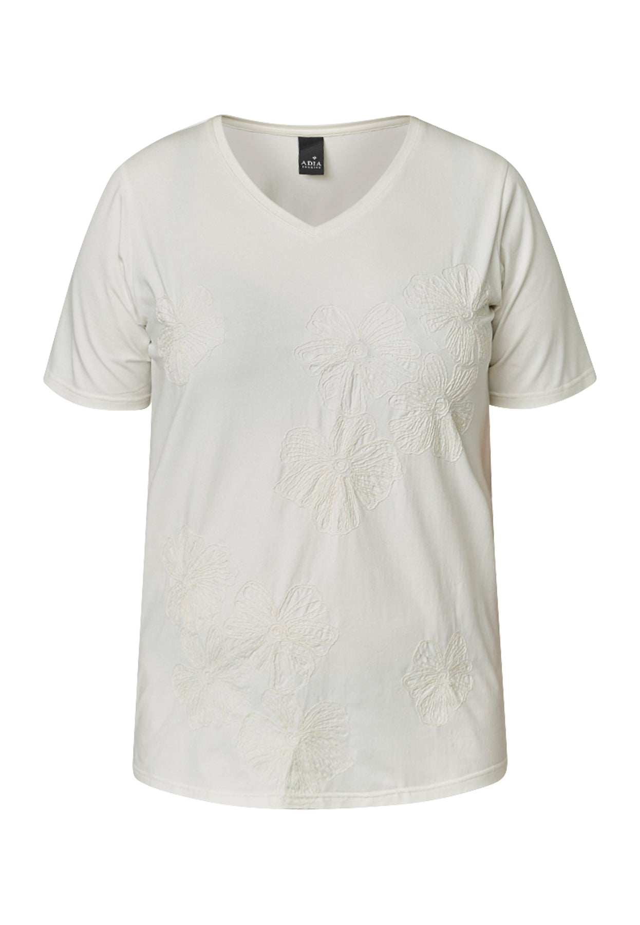 Denne T-shirt fra Adia har et enkelt og tidløst udtryk med en lige pasform, der gør den let at style til både hverdag og mere afslappede looks. Den bløde bomuldskvalitet med stretch føles behagelig mod huden og giver god bevægelsesfrihed hele dagen. Den klassiske V-udskæring tilfører et feminint touch og gør modellen nem at kombinere med både bukser, nederdele og lag-på-lag.