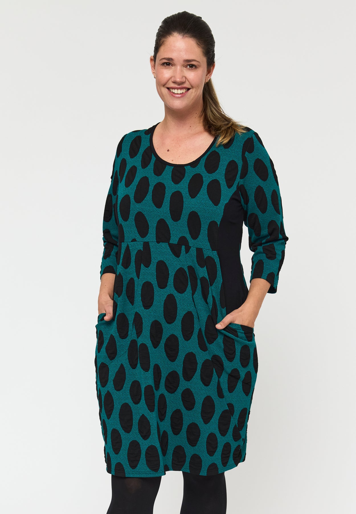 Denne kjole med ballon-effekt skaber et moderne og legende udtryk, der udstråler masser af personlighed. Materialet er blødt med en let stretch, som falder smukt og føles behageligt mod kroppen hele dagen. En kjole, der forener komfort med et unikt og raffineret design.