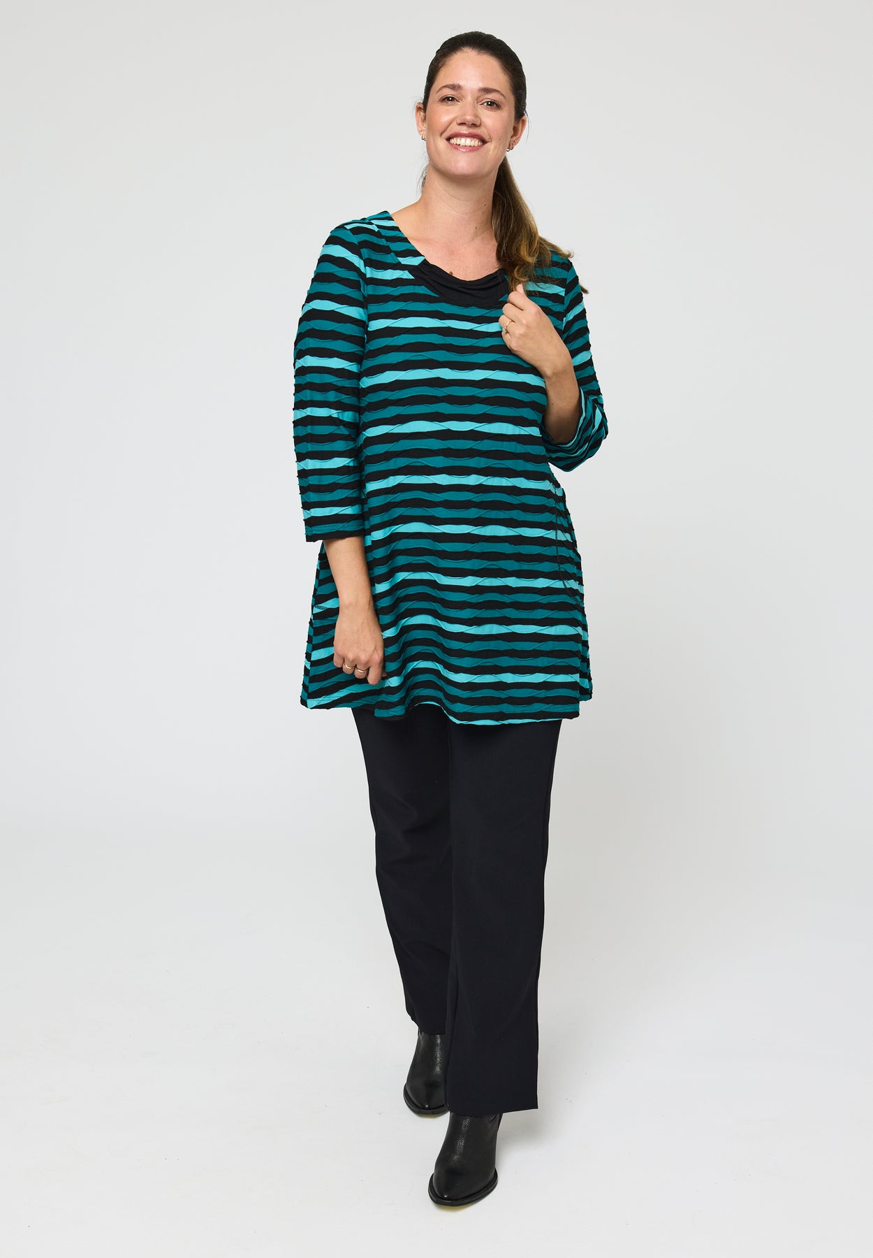 Denne tunika emmer af energi med sit stribede mønster, der giver et moderne og levende udtryk. Det A-formede snit sikrer en flatterende silhuet, mens den bløde viskosekvalitet med stretch føles behagelig og giver frihed til at bevæge sig. Afslappet og stilren – perfekt til hverdagen, men også let at opgradere til mere festlige anledninger.