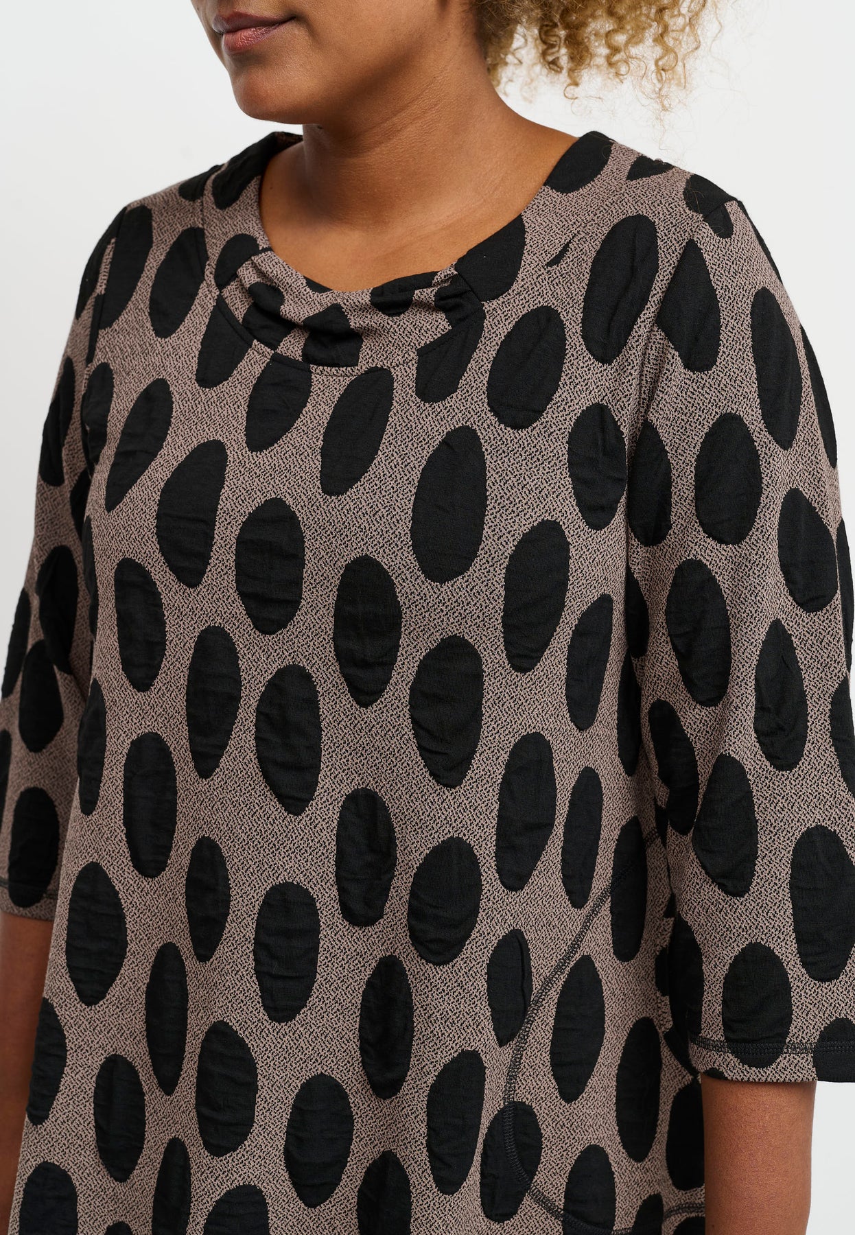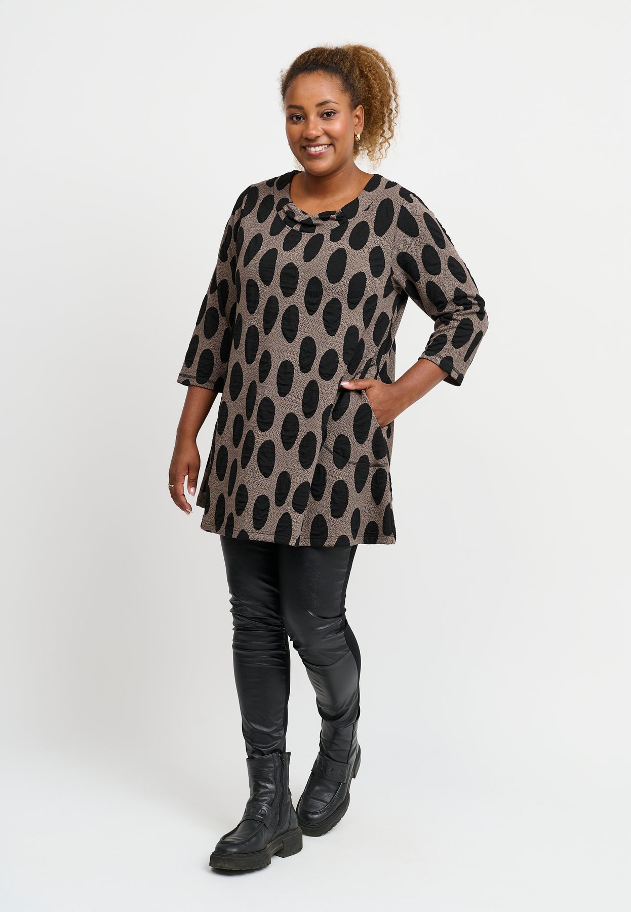 En tunika med masser af karakter og et flot, grafisk prikket print. Den feminine A-form falder let om kroppen og skaber en behagelig silhuet, mens den strækbare viskosekvalitet sikrer bevægelighed og en blød fornemmelse. Den runde hals og de trekvartlange ærmer gør modellen ideel til både hverdagsbrug og pænere lejligheder.