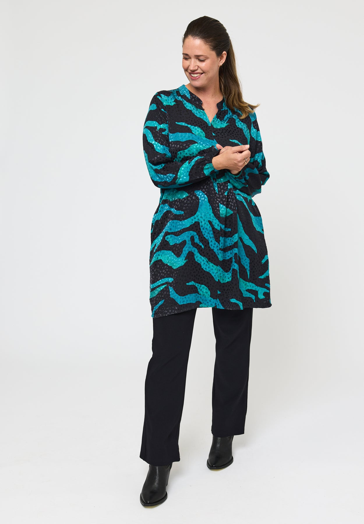 Denne tunika kombinerer et energisk turkis/sort print med en flatterende A-formet silhuet, der giver et både levende og moderne udtryk. Stoffets bløde fald gør den behagelig at have på, samtidig med at det markante mønster skaber blikfang i enhver garderobe.
