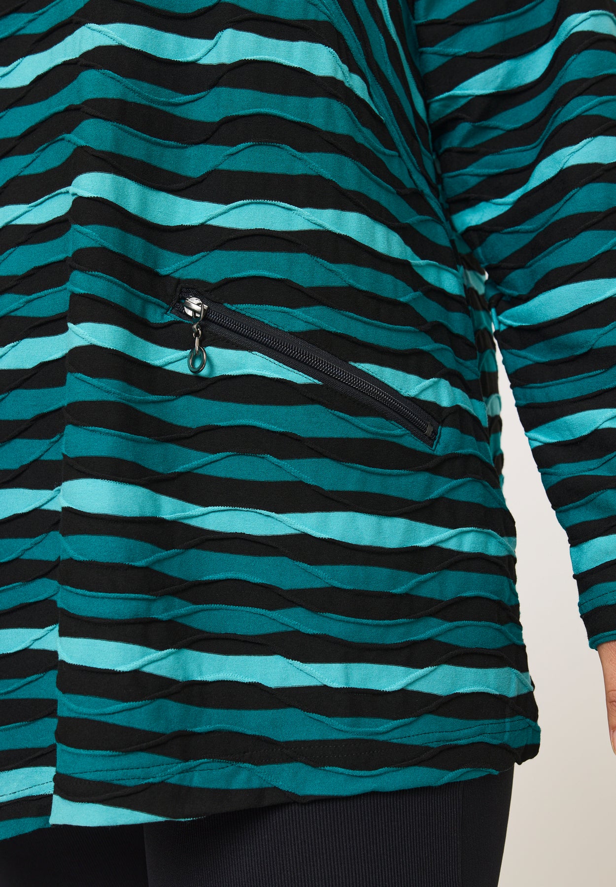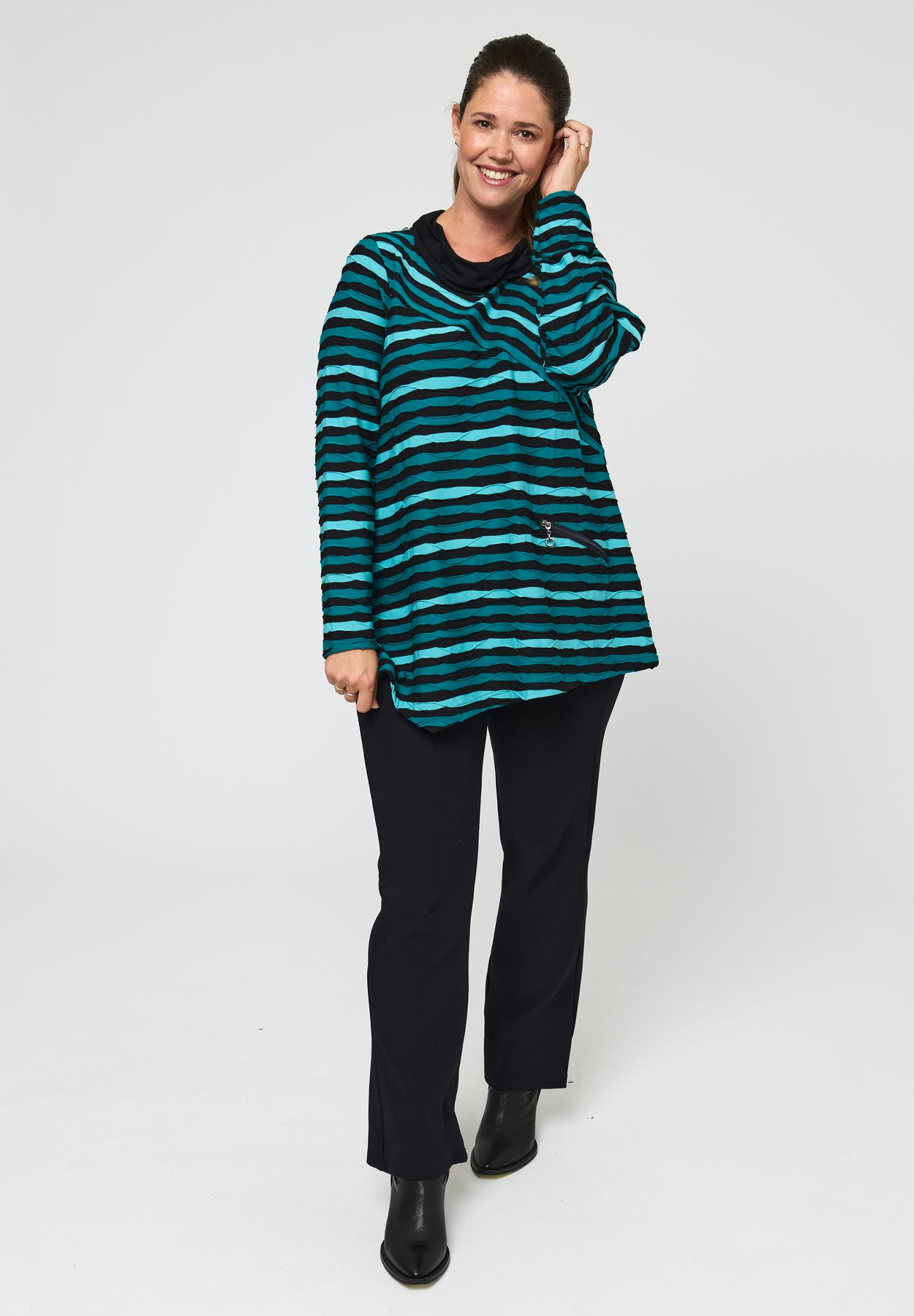 Denne bluse forener klassiske striber med en moderne A-form, der falder let og giver et flatterende udtryk. Det bløde og elastiske materiale føles behageligt mod huden og følger kroppens bevægelser naturligt, så helhedsindtrykket bliver enkelt og stilrent.