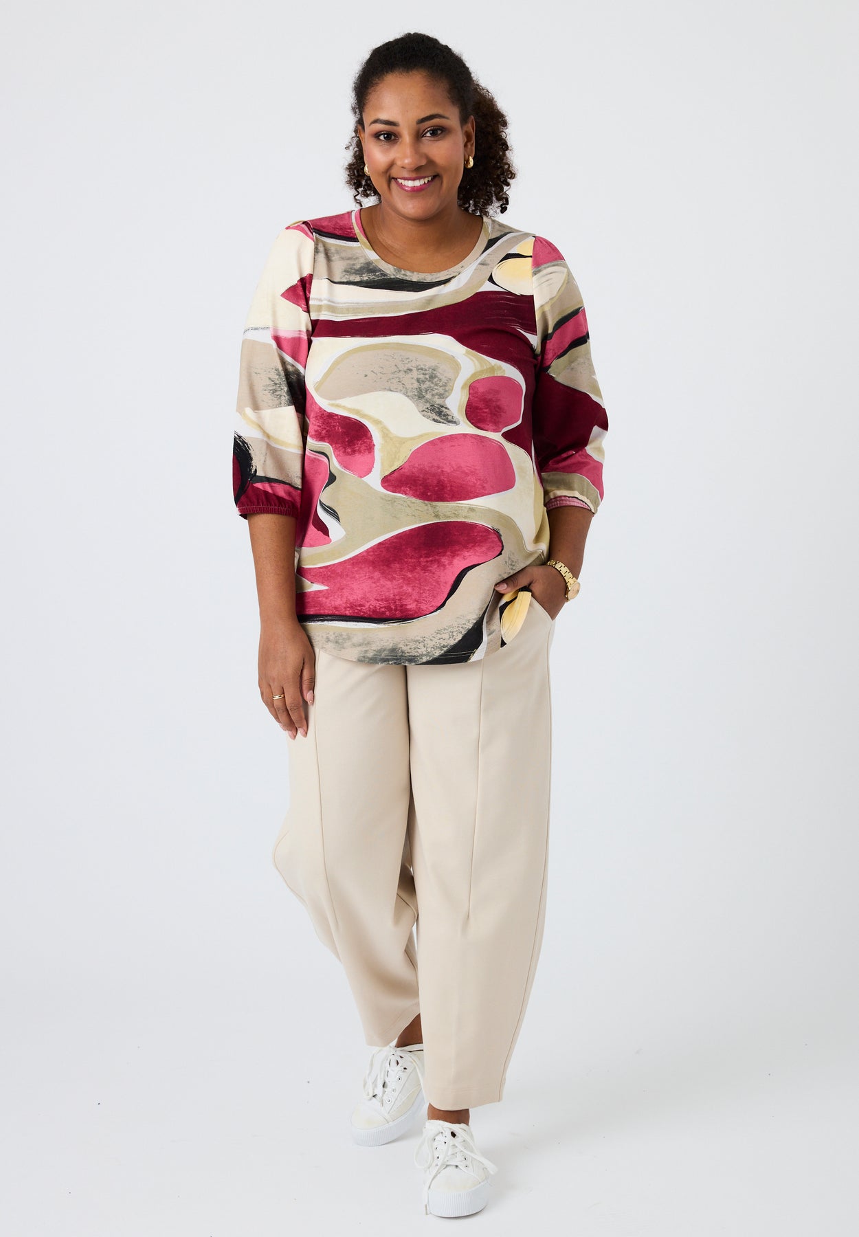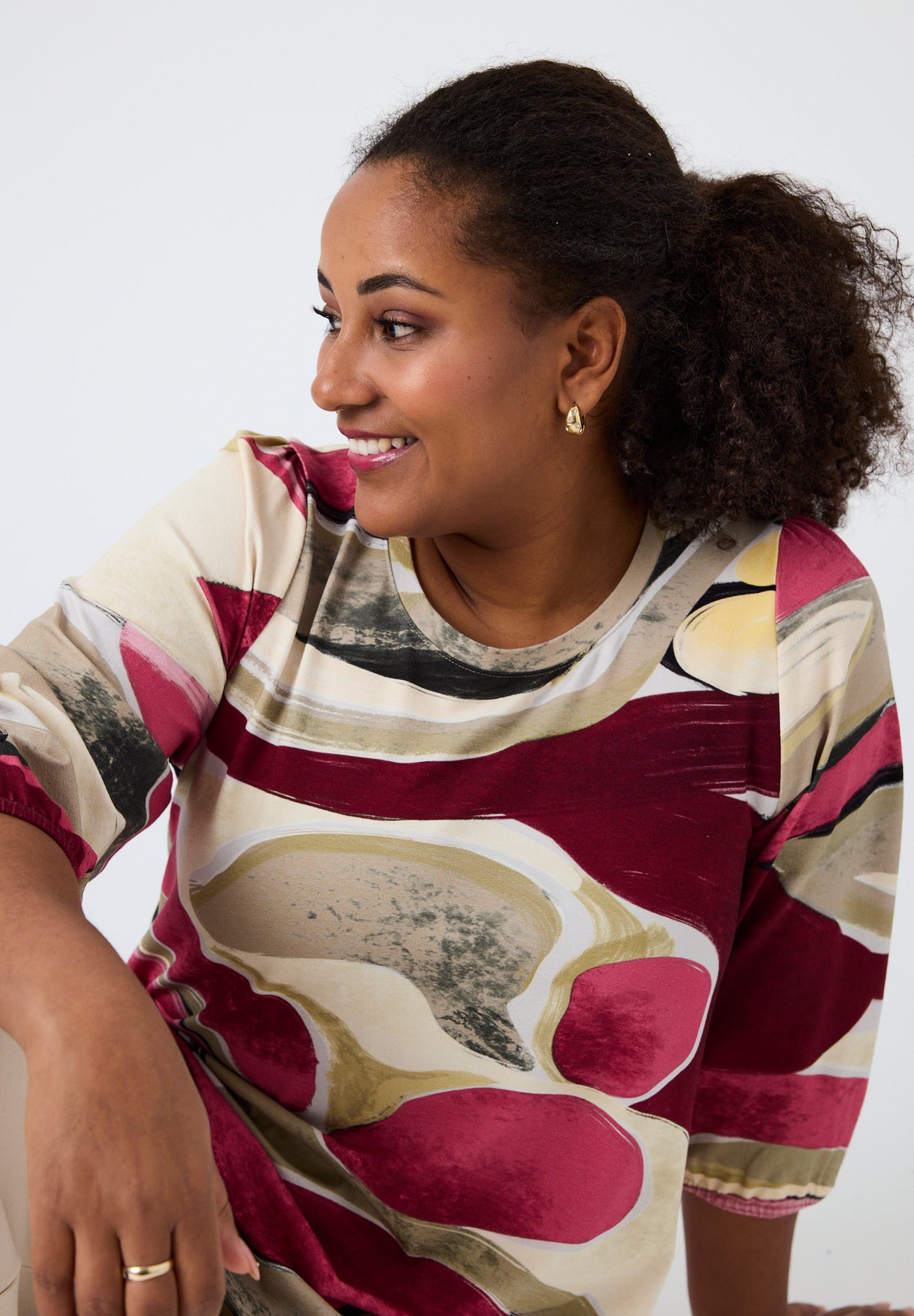 Denne bluse fra Pont Neuf har et livligt og grafisk udtryk, hvor det farverige print giver modellen et markant, men afbalanceret look. Den A-formede pasform falder let og rummeligt og skaber en behagelig silhuet, der sidder pænt uden at virke stram. Den bløde viskosekvalitet med stræk føles behagelig mod huden og gør blusen velegnet til brug hele dagen.