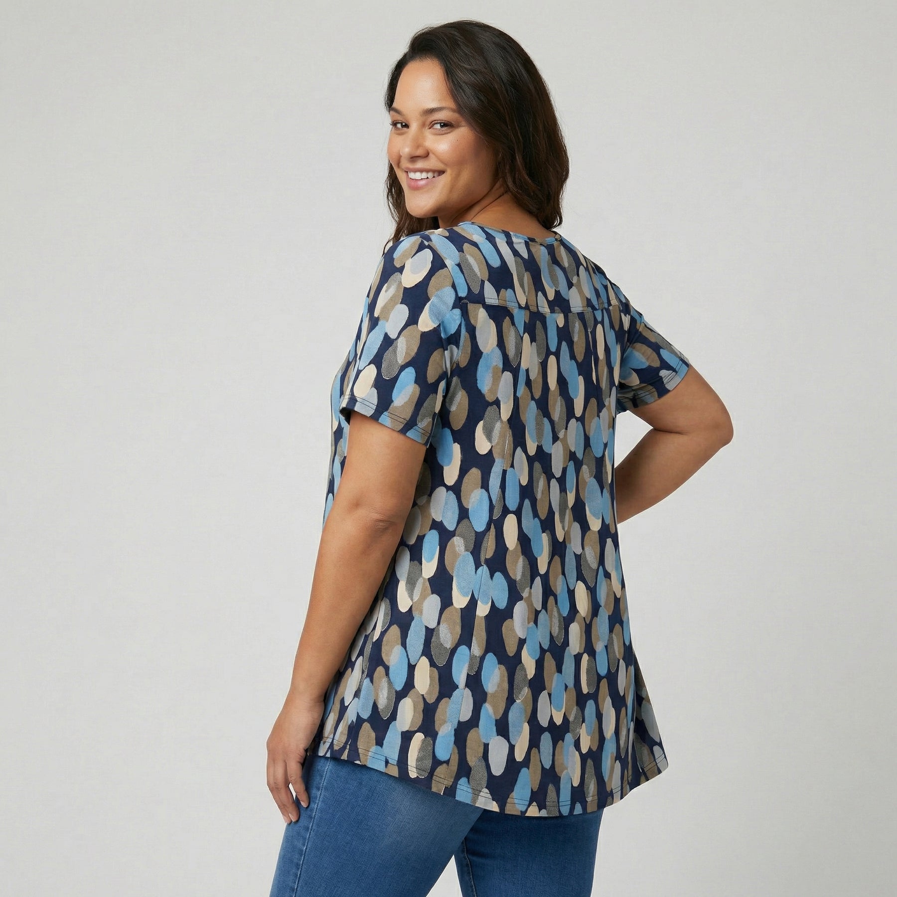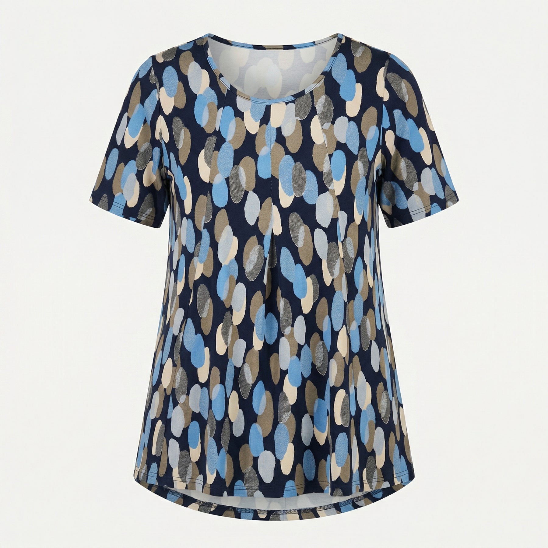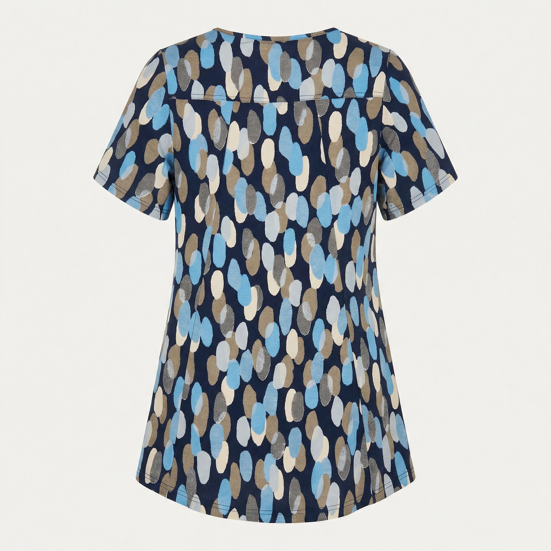 Denne bluse fra Pont Neuf har et levende, grafisk print, der tilfører modellen et dynamisk og moderne udtryk. Den A-formede pasform giver en let og rummelig silhuet, som falder pænt uden at virke tung. Den bløde viskosekvalitet med stretch sikrer en behagelig fornemmelse mod huden og gør blusen velegnet til enhver lejlighed.