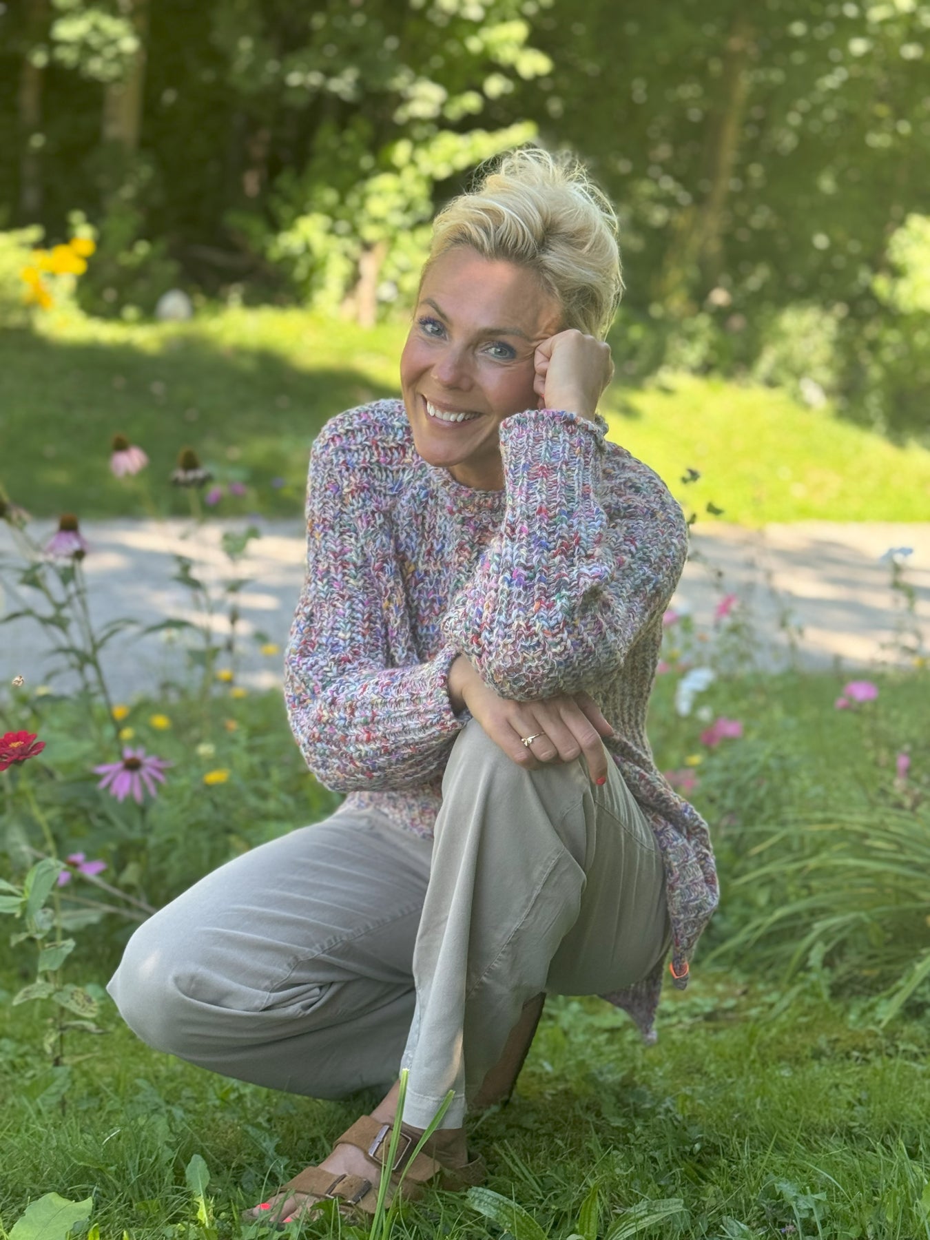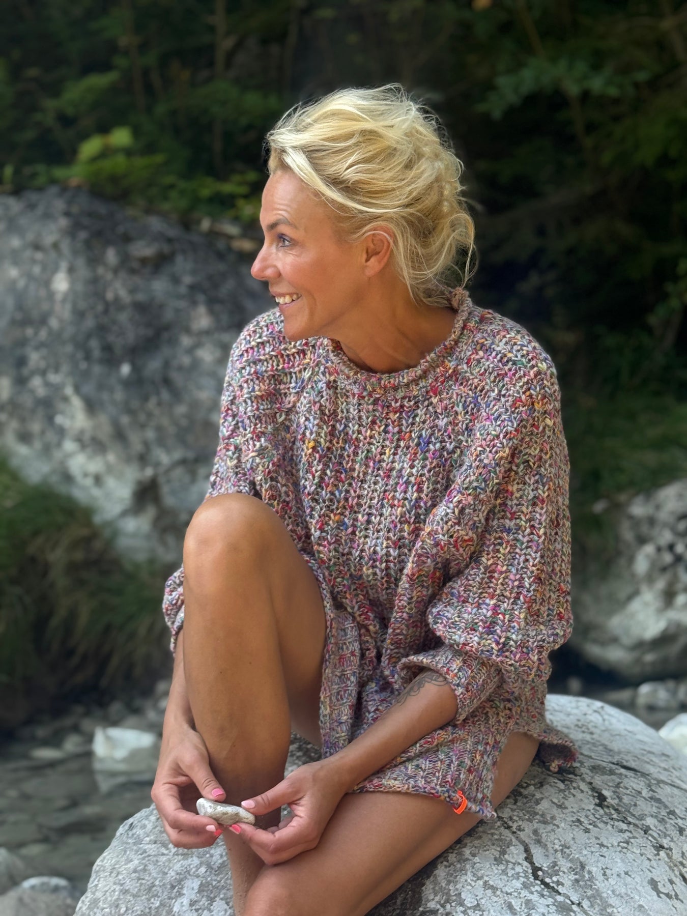 “Sommerhus”-sweateren indfanger følelsen af sommerhusstemning – duften af træ, vinden gennem de åbne vinduer og roen, der langsomt finder vej ind i kroppen. De bløde nuancer i garnet væver sig sammen som sollys på sand, en hyggestund i haven eller lyden af regn mod taget.