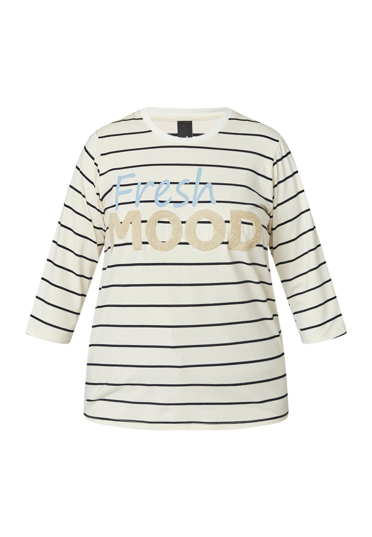 Denne T-shirt fra Adia har et afslappet og feminint udtryk med klassiske striber kombineret med et dekorativt print på fronten. Det giver modellen et moderne twist, samtidig med at den bevarer et tidløst look. Den bløde bomuldskvalitet med stretch føles behagelig mod huden og sikrer god komfort gennem hele dagen. Den lige pasform gør T-shirten let at style og behagelig at have på.