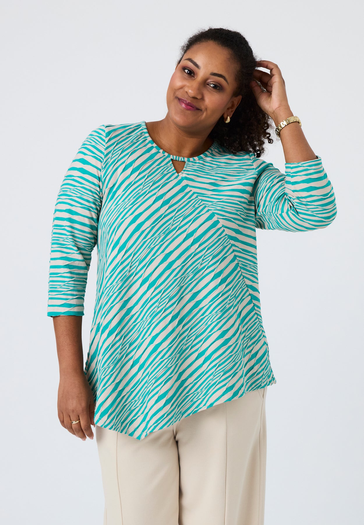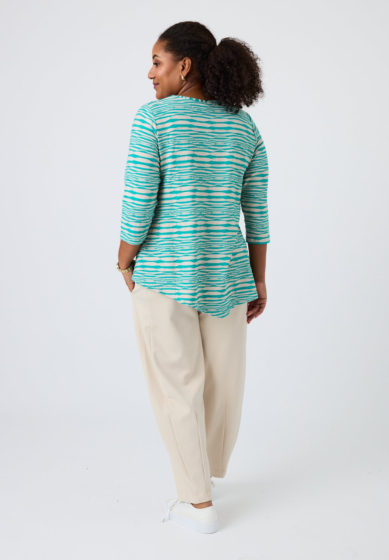 En grafisk top med et levende udtryk og en feminin A-formet silhuet. Det printede design i tofarvede kontraster fanger blikket, mens den bløde og strækbare viskosekvalitet sikrer et flot fald og god bevægelsesfrihed. Toppen har trekvartlange ærmer, rund hals og en længde, der dækker hoften – en favorit til hverdag.