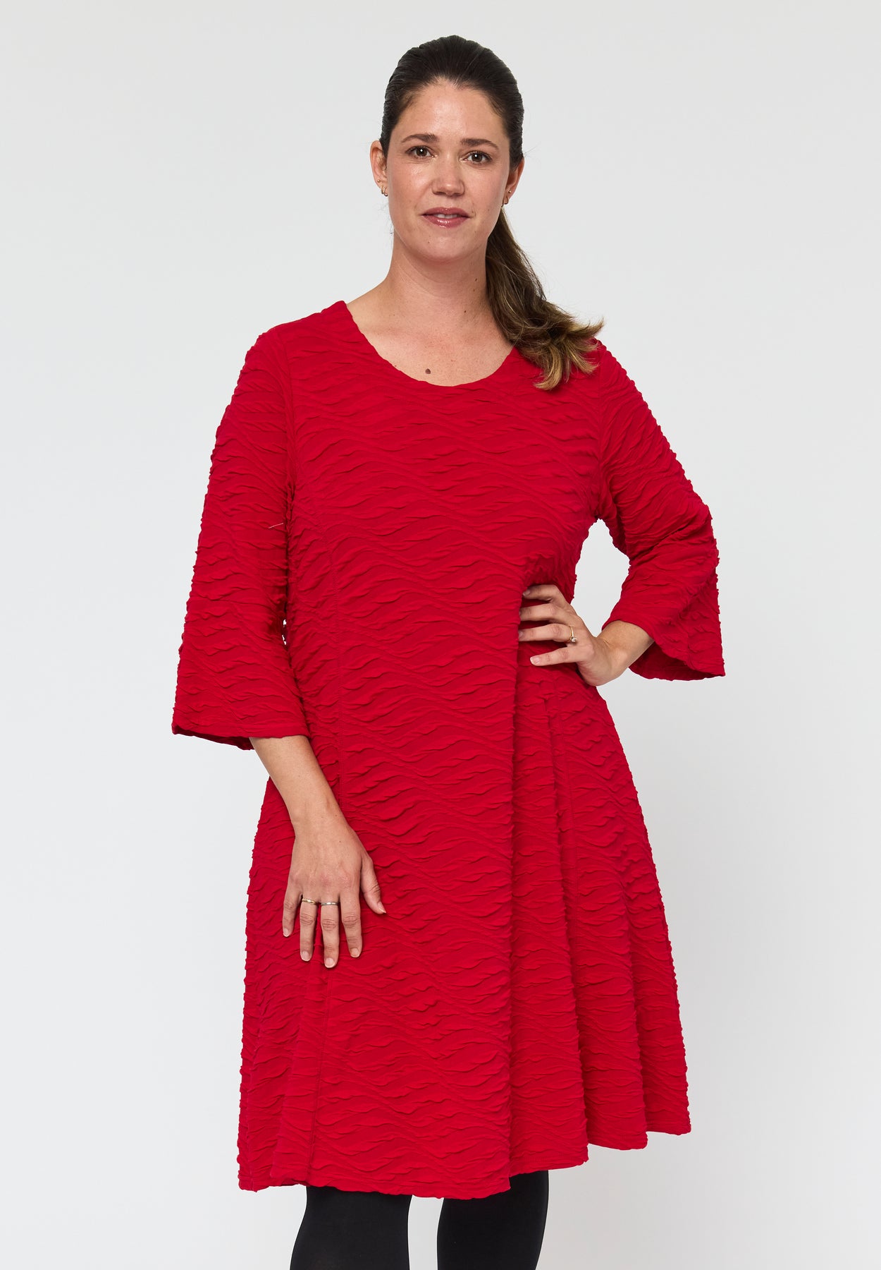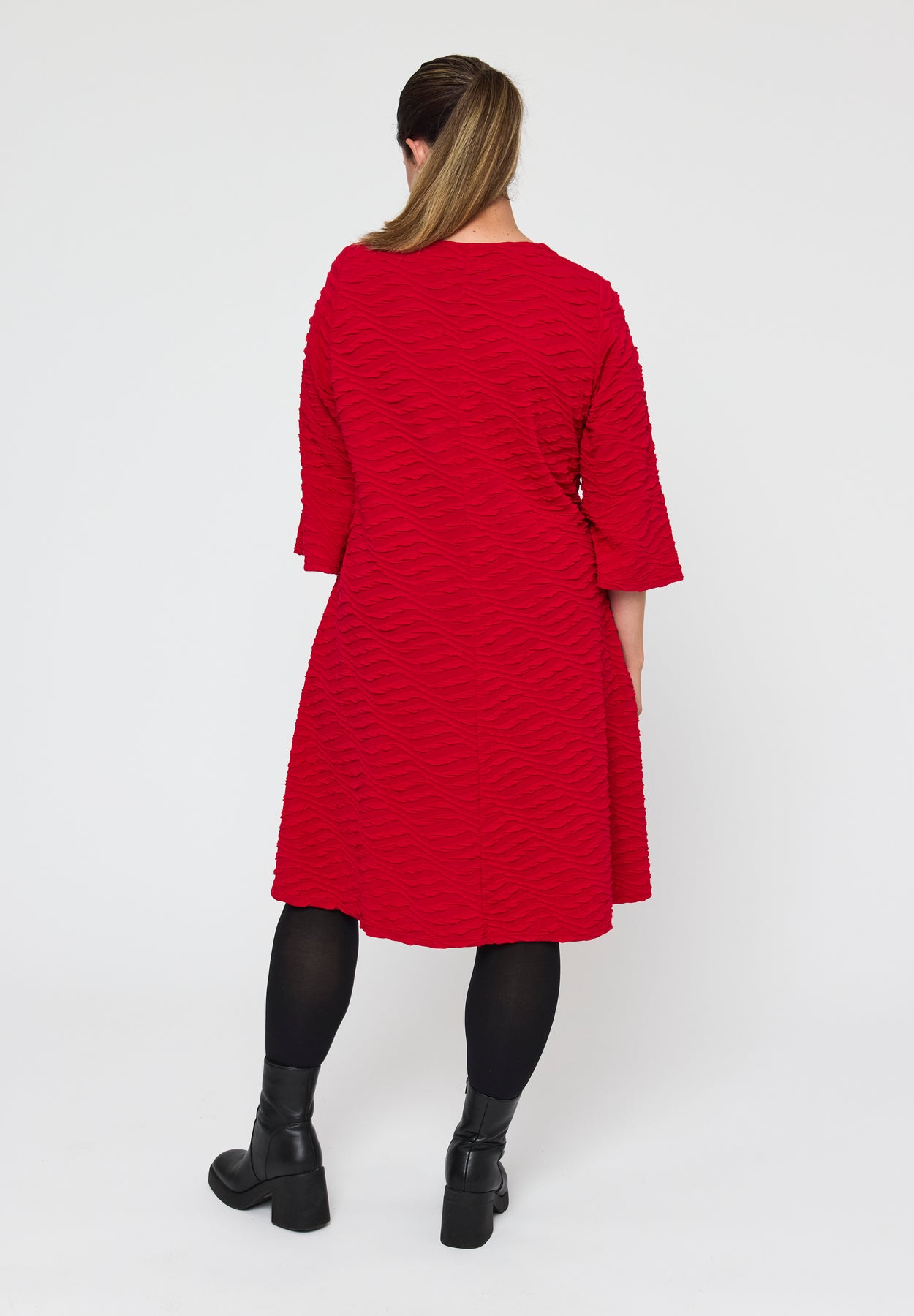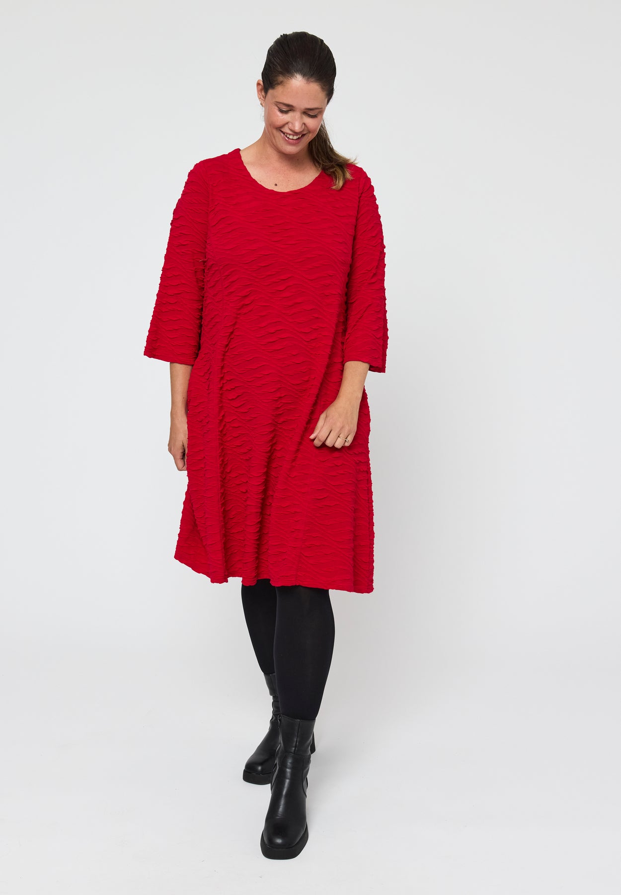 En enkel og stilfuld kjole med et moderne, afslappet snit. Den har rund hals, korte ærmer og en løs A-form, der giver god bevægelsesfrihed og et flot fald. Stoffet har en fast, elastisk kvalitet, som holder formen flot og samtidig føles blødt og komfortabelt mod kroppen.