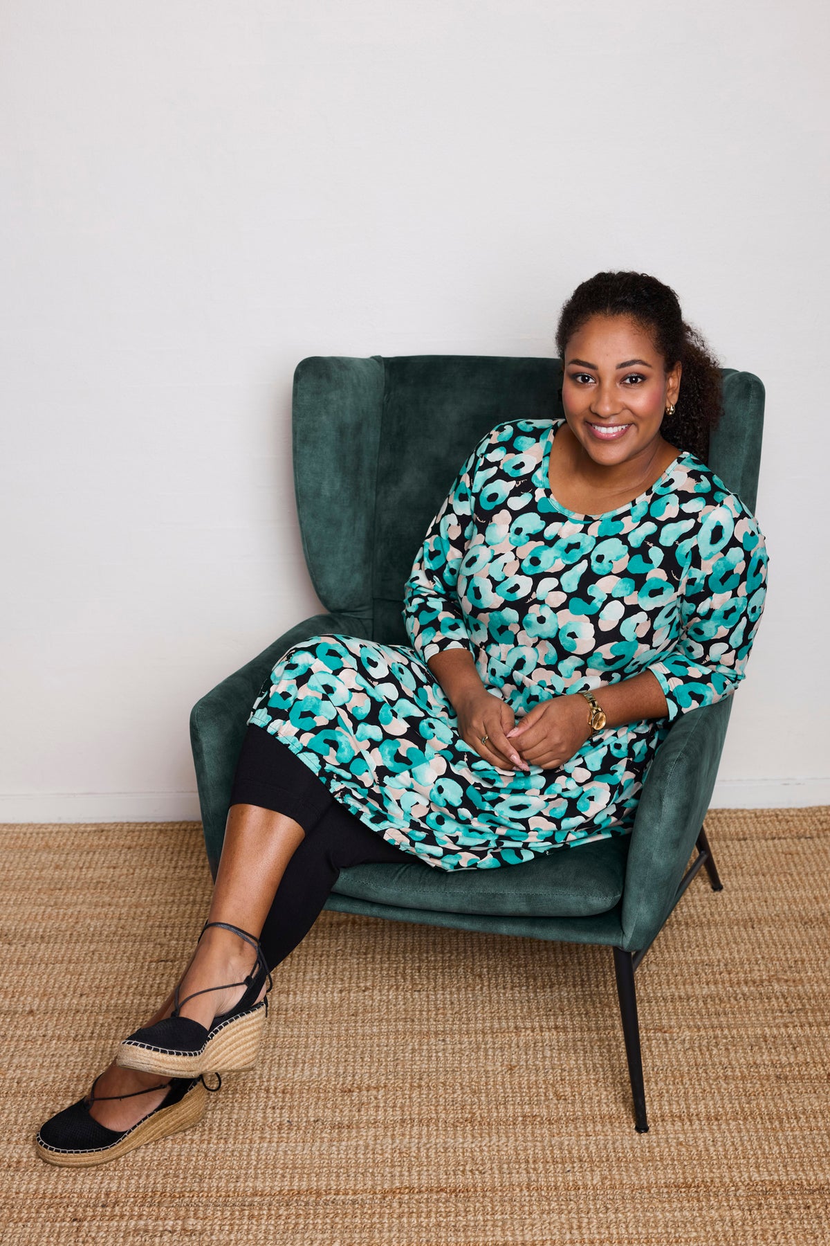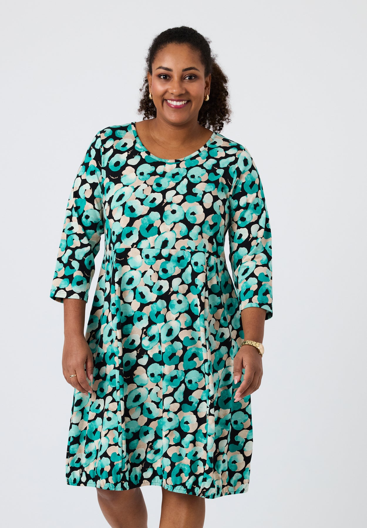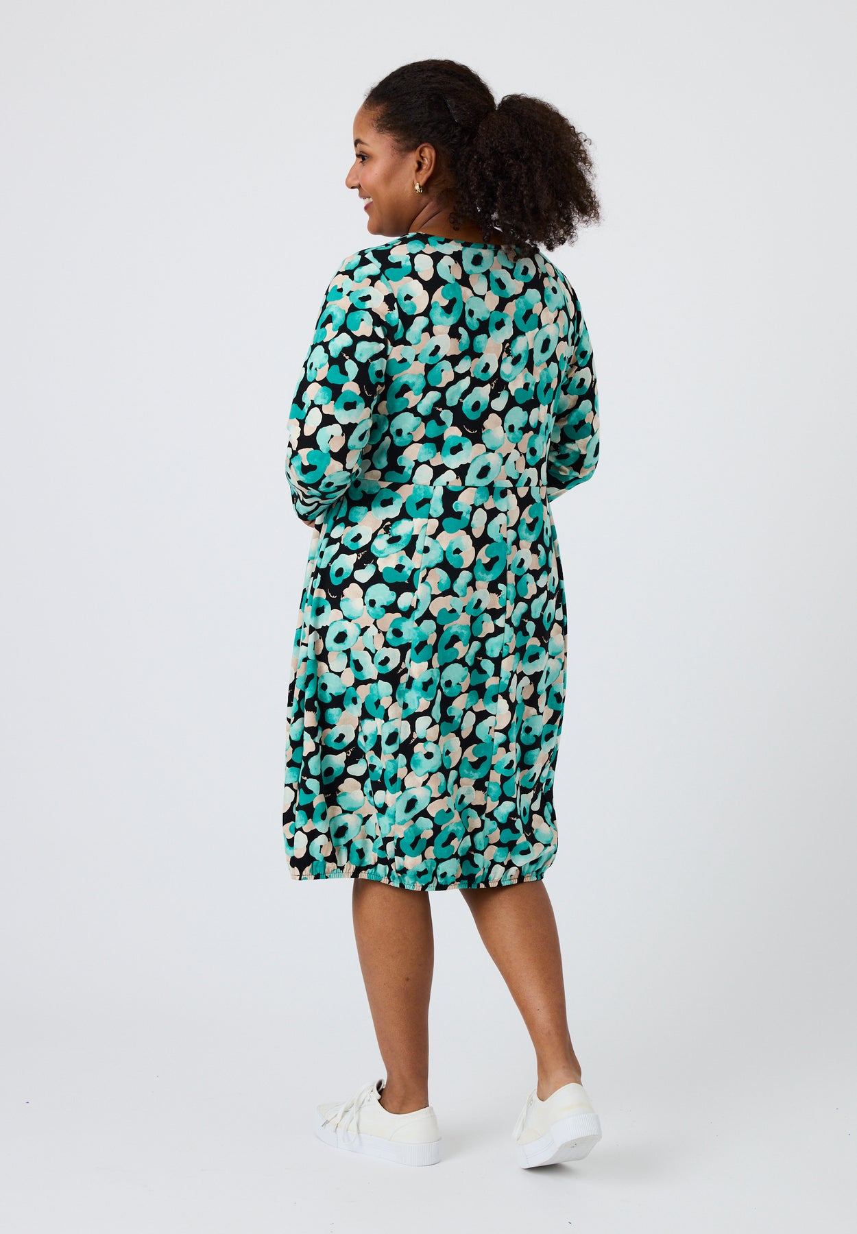 Denne kjole fra Pont Neuf har et markant og feminint udtryk med en karakteristisk balloon-effekt, der giver facon og bevægelse i silhuetten. Den er fremstillet i en blød og elastisk viskosekvalitet, som falder smukt og tilpasser sig kroppen uden at stramme. Kjolen har rund halsudskæring og lange ærmer, hvilket giver et balanceret og anvendeligt design. Det levende mønster understøtter kjolens form og tilfører et iøjnefaldende, men stadig harmonisk udtryk.