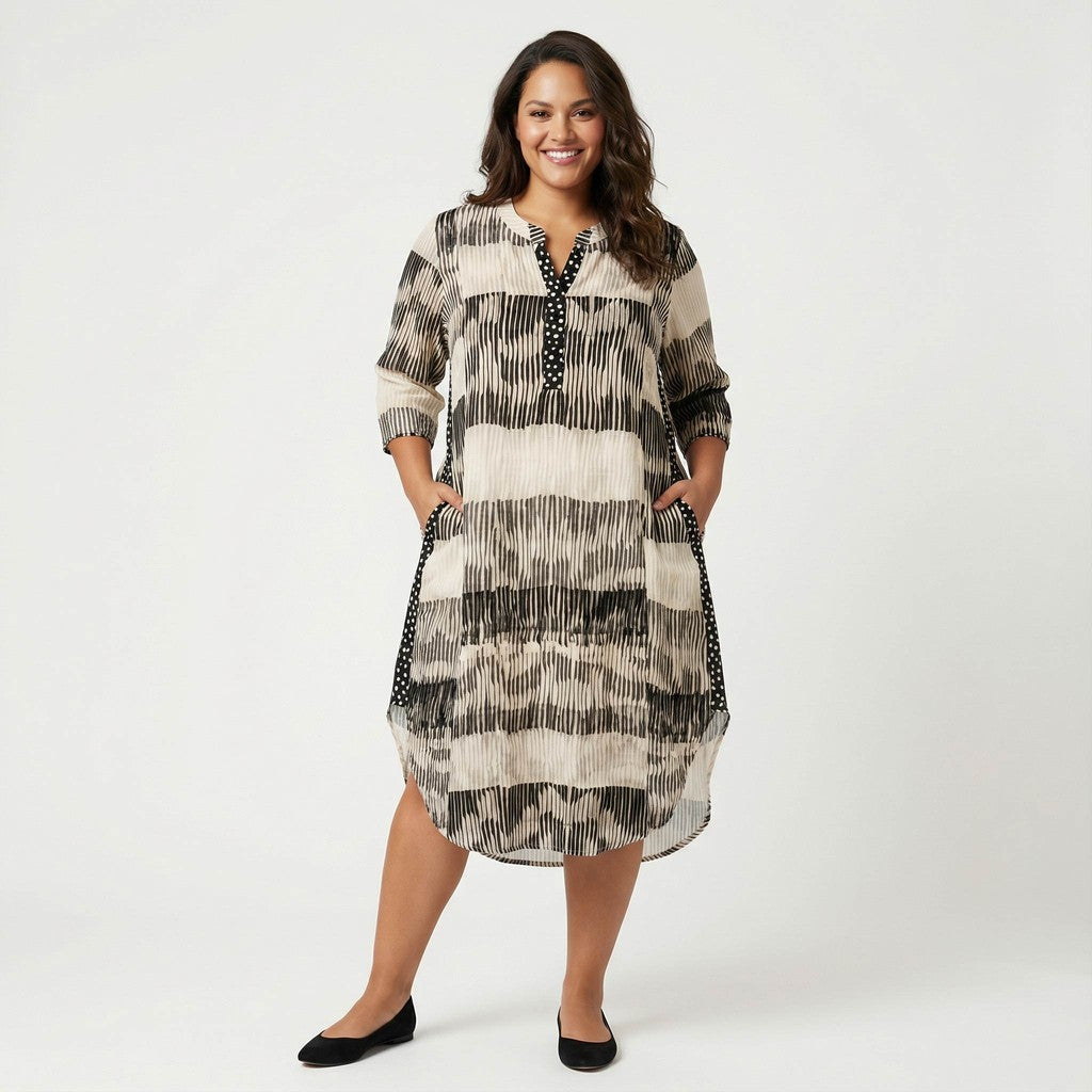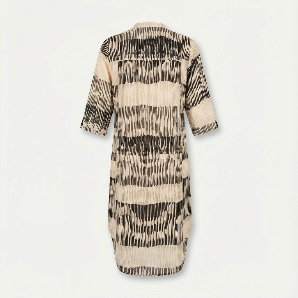 Denne kjole er designet i en klassisk A-form, der giver et smukt fald og god bevægelsesfrihed. Modellen har rund halsudskæring og 3/4-ærmer, som skaber et harmonisk og anvendeligt udtryk. Materialet i viskose og nylon bidrager med en let, glat overflade og en struktur, der holder faconen flot hele dagen.