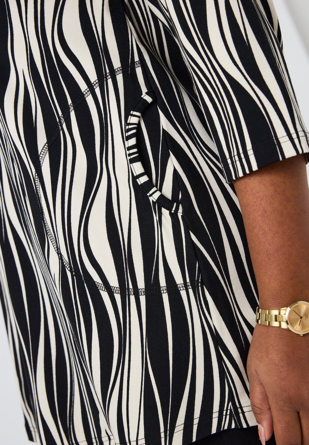 Denne tunika fra Pont Neuf har et enkelt og roligt udtryk, hvor det grafiske print skaber liv uden at virke dominerende. Den lige pasform giver et afslappet fald, som er let at bære og fungerer godt til mange forskellige outfits. Materialet har en blød elasticitet, der sikrer god bevægelighed og en behagelig fornemmelse i løbet af dagen.