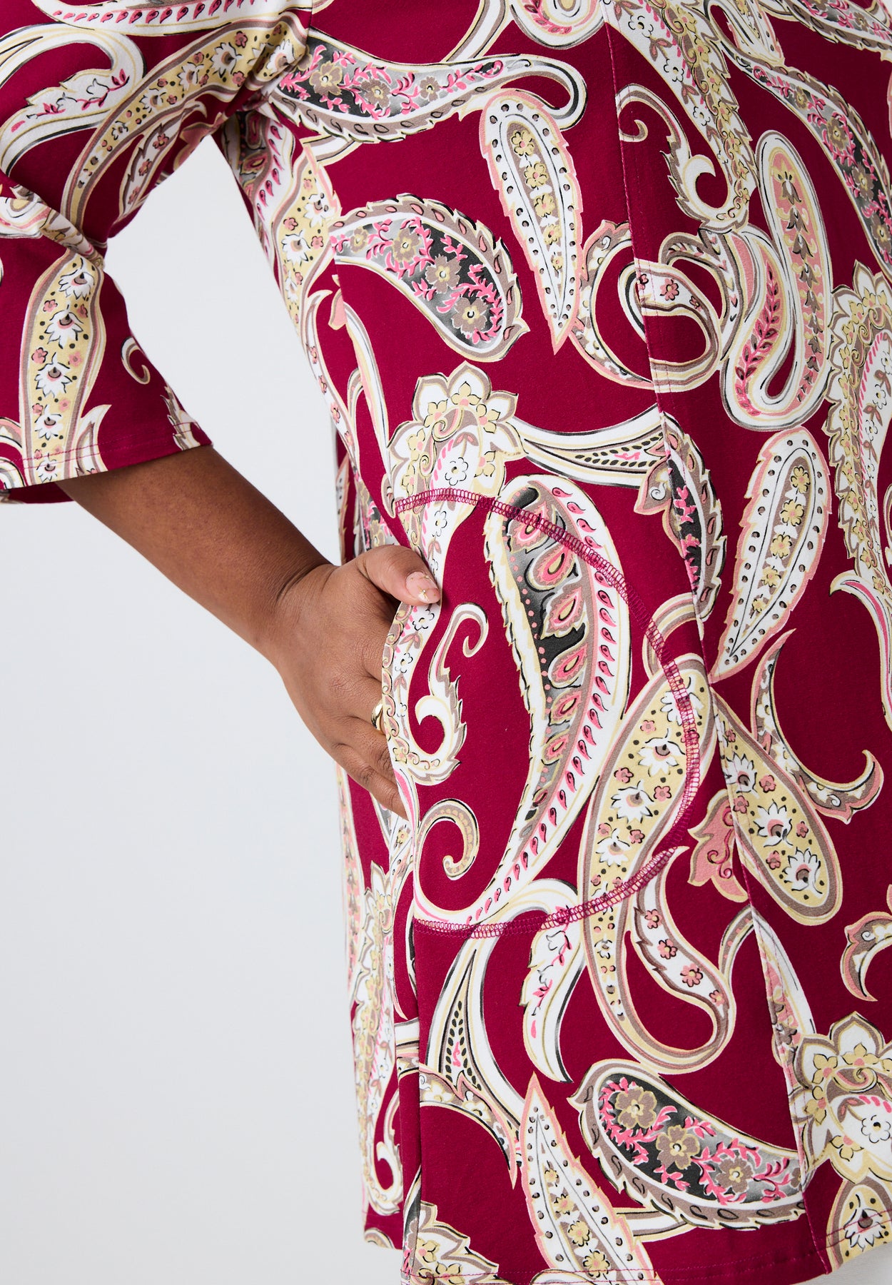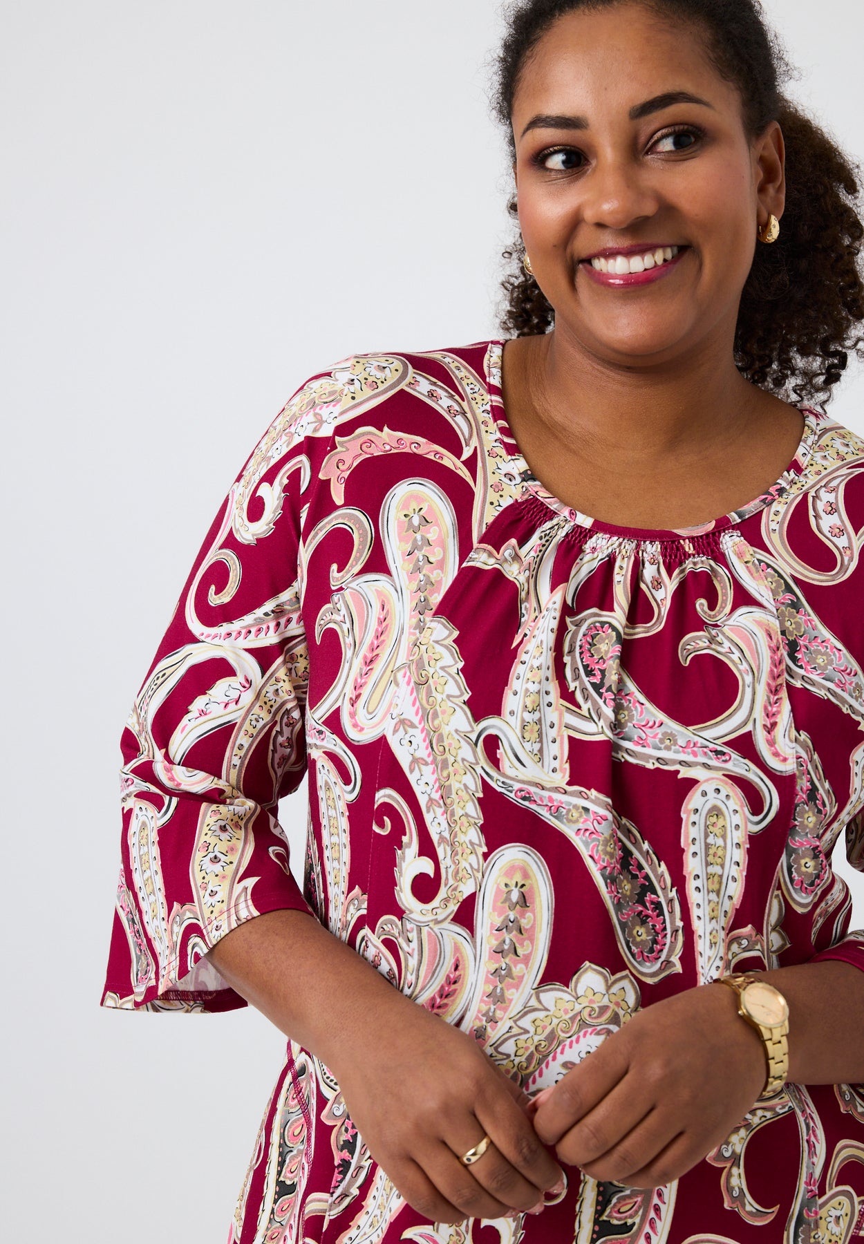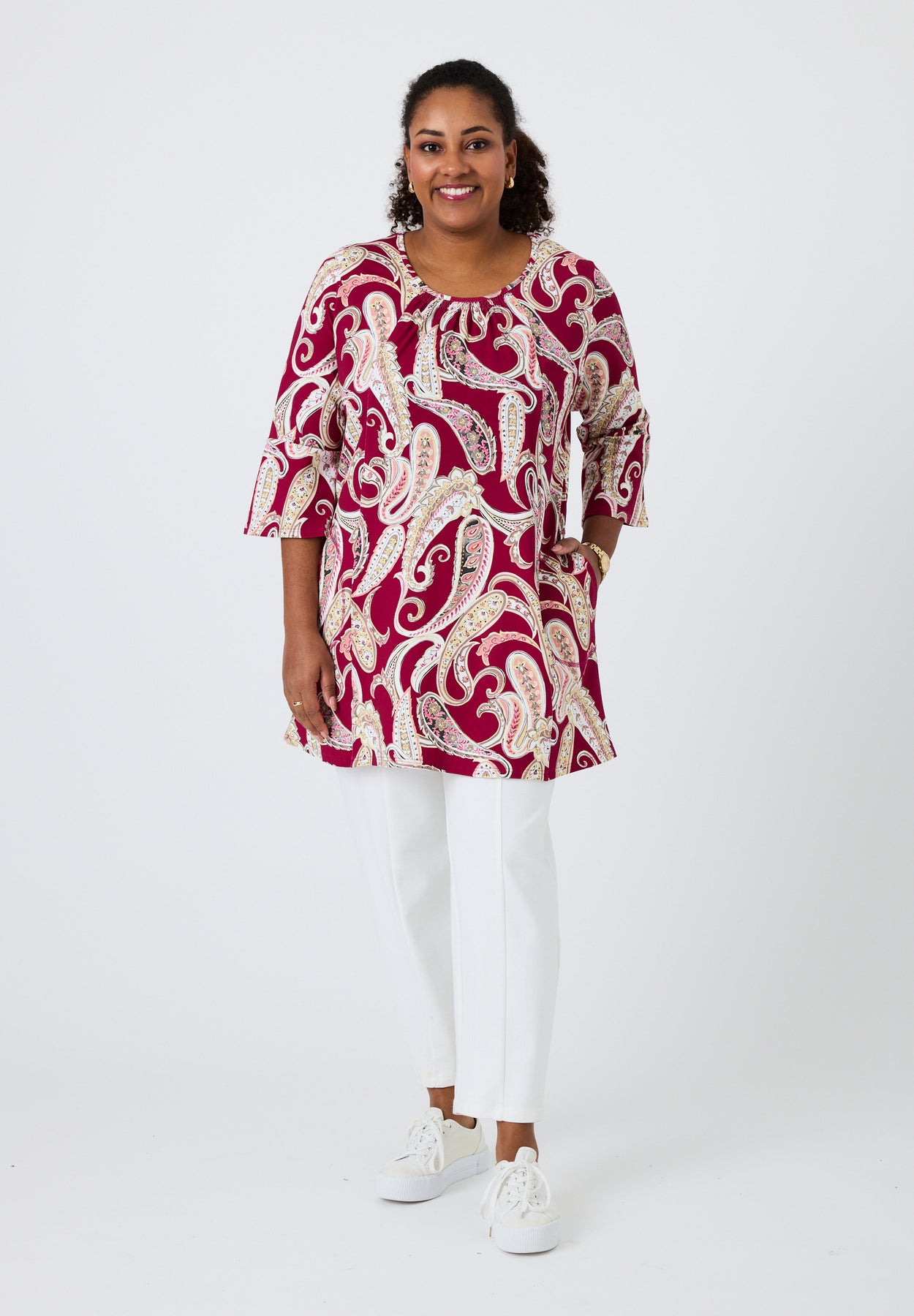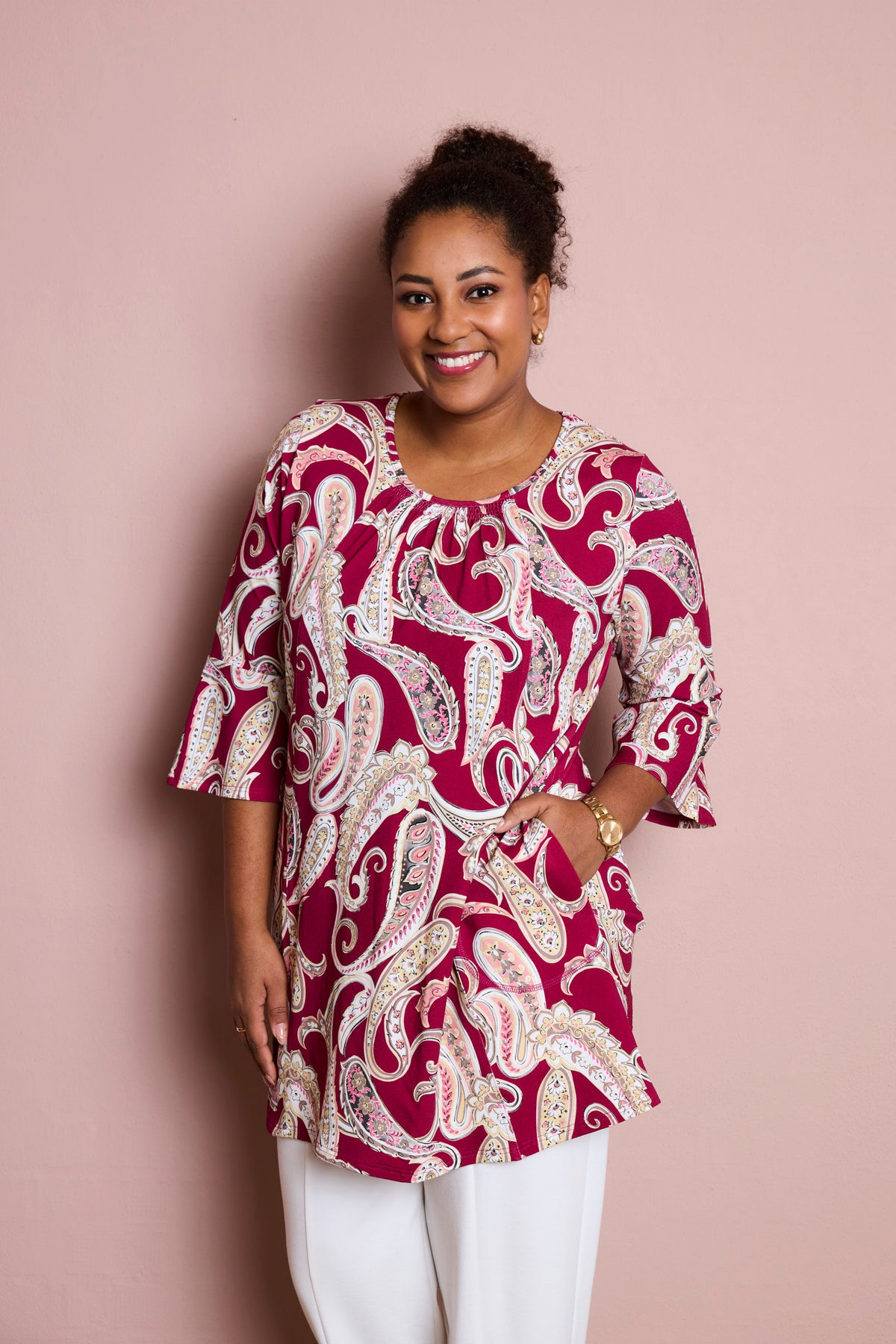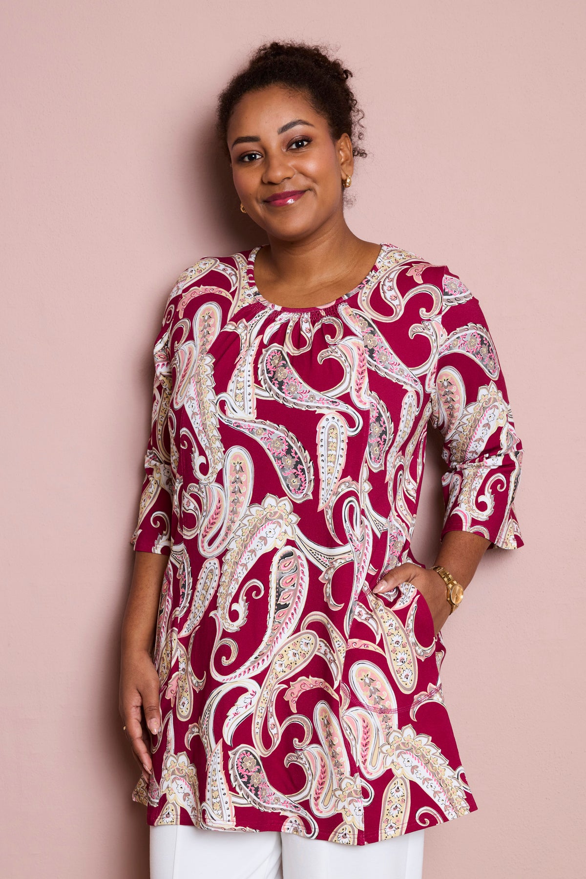 Denne mønstrede tunika fra Pont Neuf har et levende og feminint udtryk med en rummelig A-formet pasform. Den bløde viskosekvalitet med let stræk giver et behageligt fald og sikrer god bevægelsesfrihed. Det dekorative mønster skaber blikfang, mens det enkle snit gør tunikaen let at kombinere med resten af garderoben.