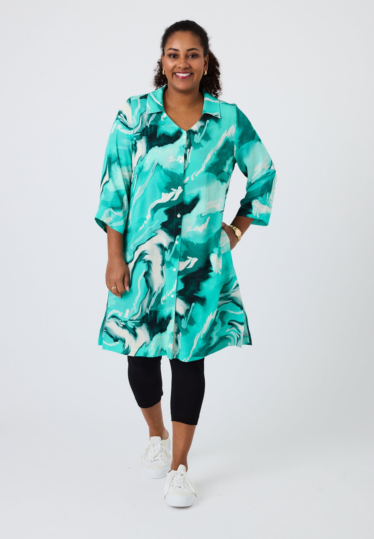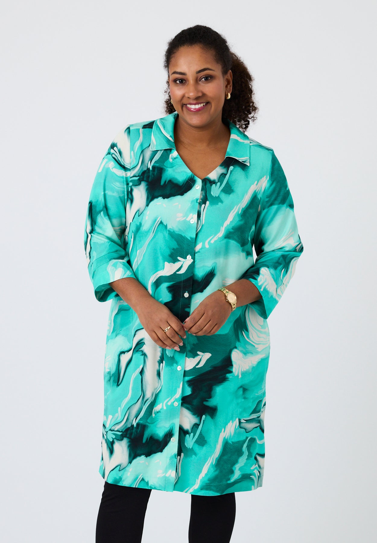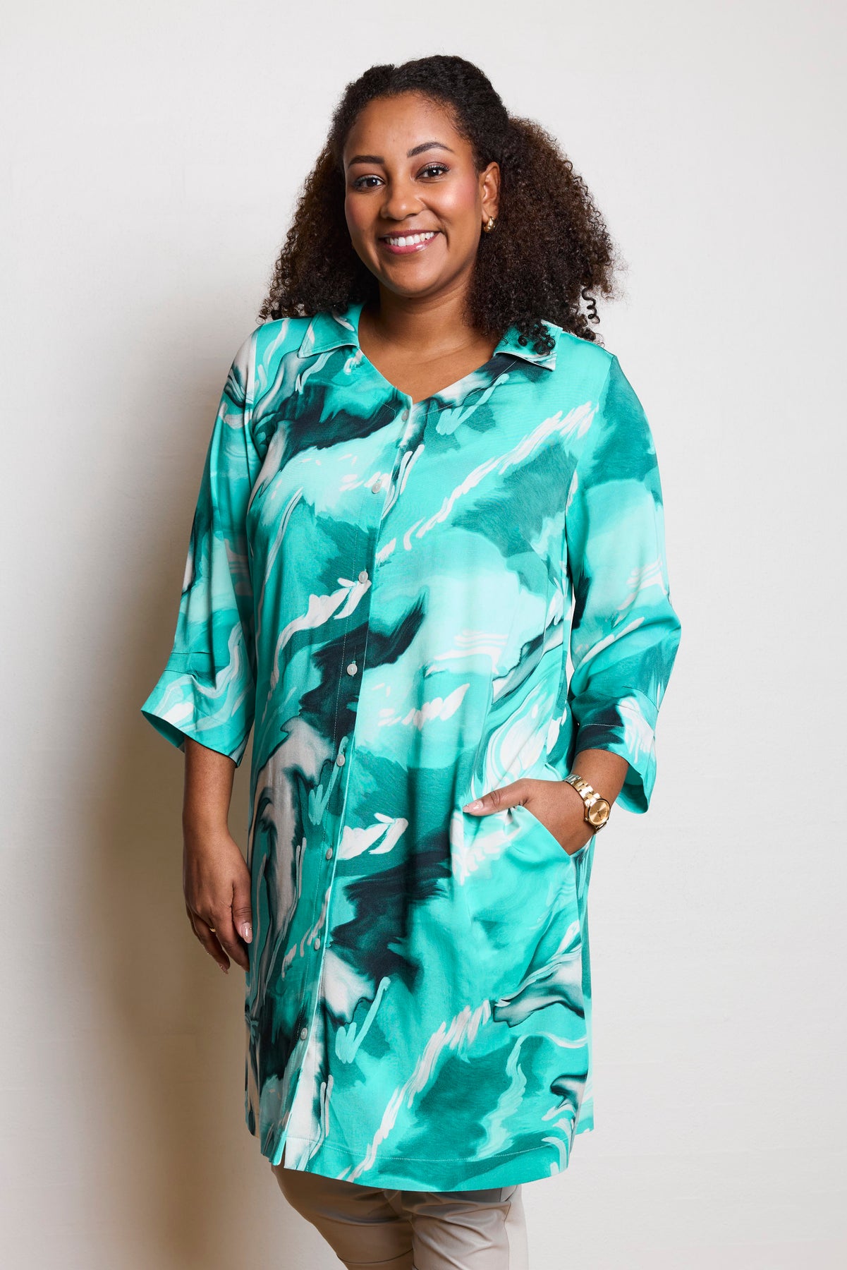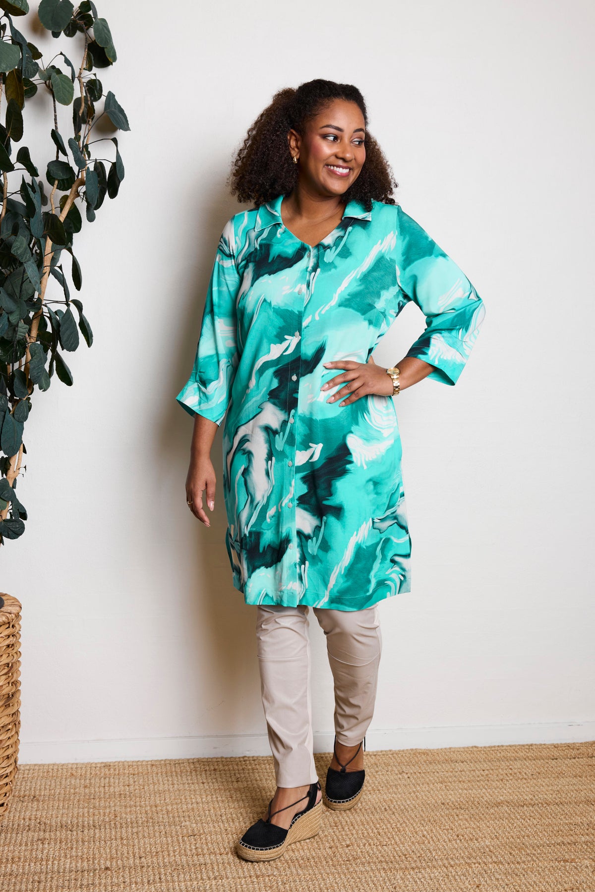 Denne mønstrede skjorte fra Pont Neuf har et friskt og markant udtryk, hvor det levende print skaber et dynamisk helhedsindtryk. Mønstret er opbygget i bløde kontraster, der giver dybde og bevægelse i designet, mens den A-formede pasform falder let fra kroppen og skaber en behagelig silhuet. Det enkle snit giver plads til printet og gør skjorten nem at style til både hverdag og mere afslappede anledninger.