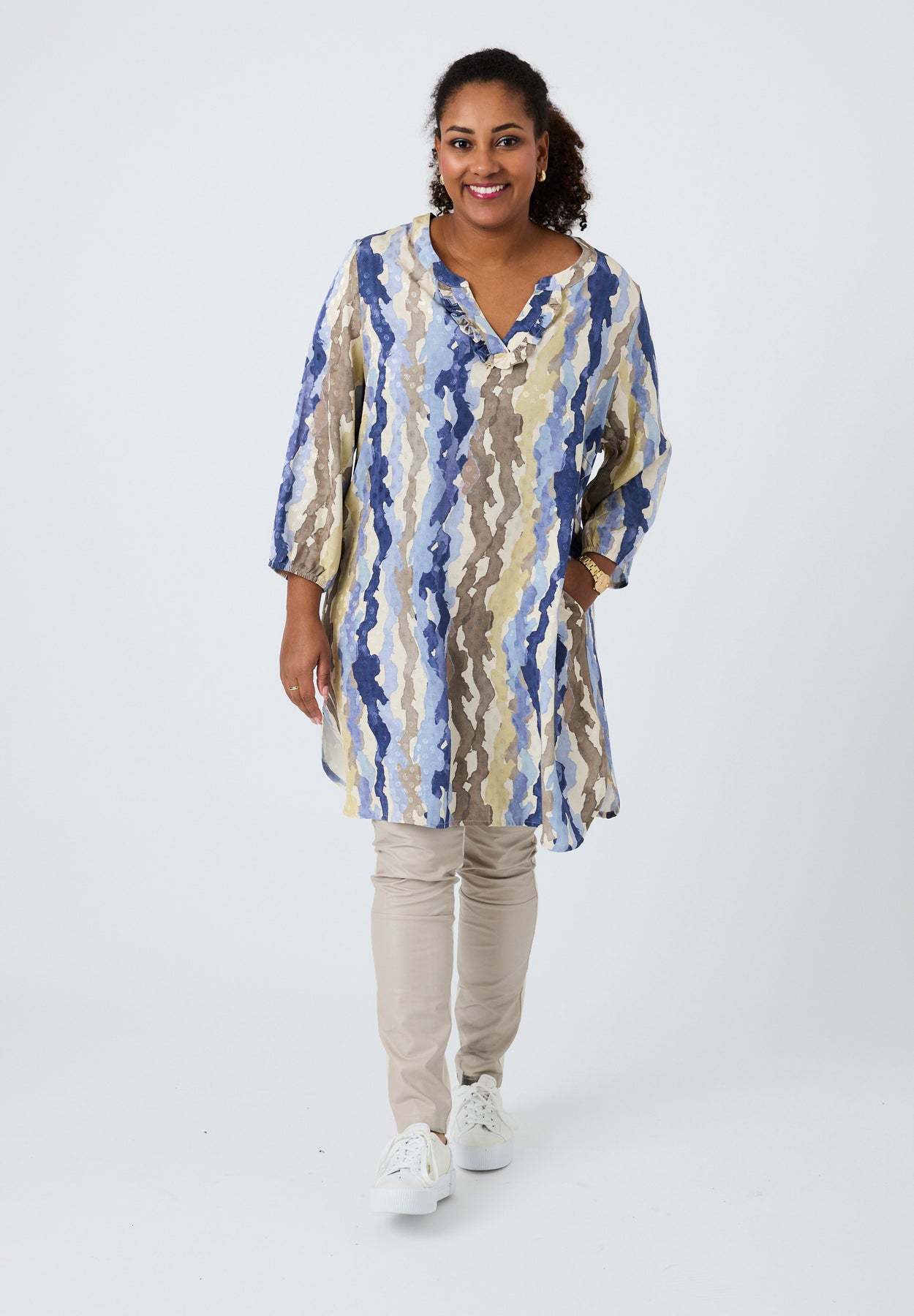 Denne mønstrede tunika fra Pont Neuf har et let og levende udtryk, hvor det lodrette print skaber bevægelse og giver en smigrende helhed. Mønstret er opbygget i bløde kontraster, som giver dybde uden at virke markant. Den A-formede pasform falder let fra kroppen og sikrer et behageligt fald, mens det enkle snit lader printet være i centrum.