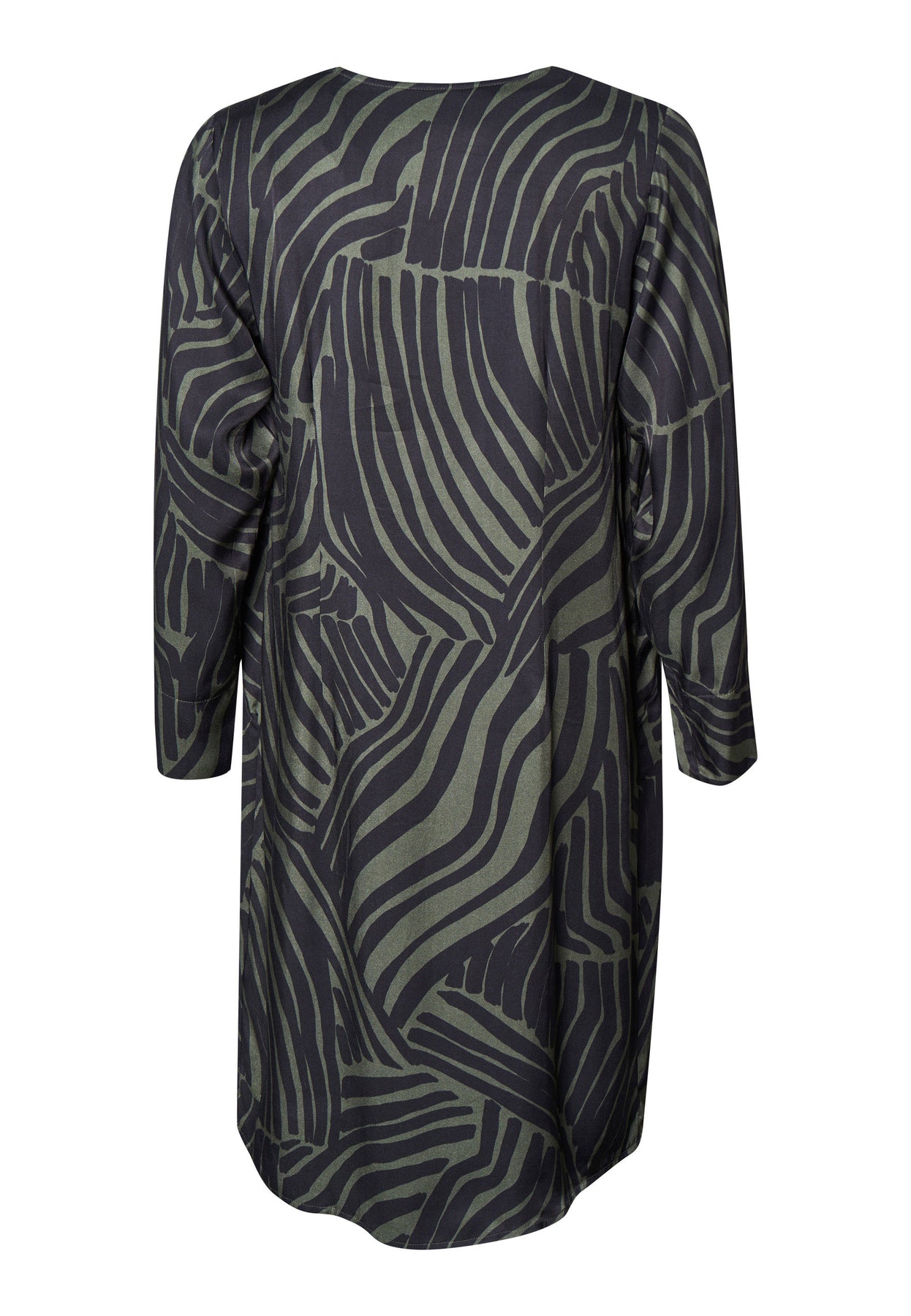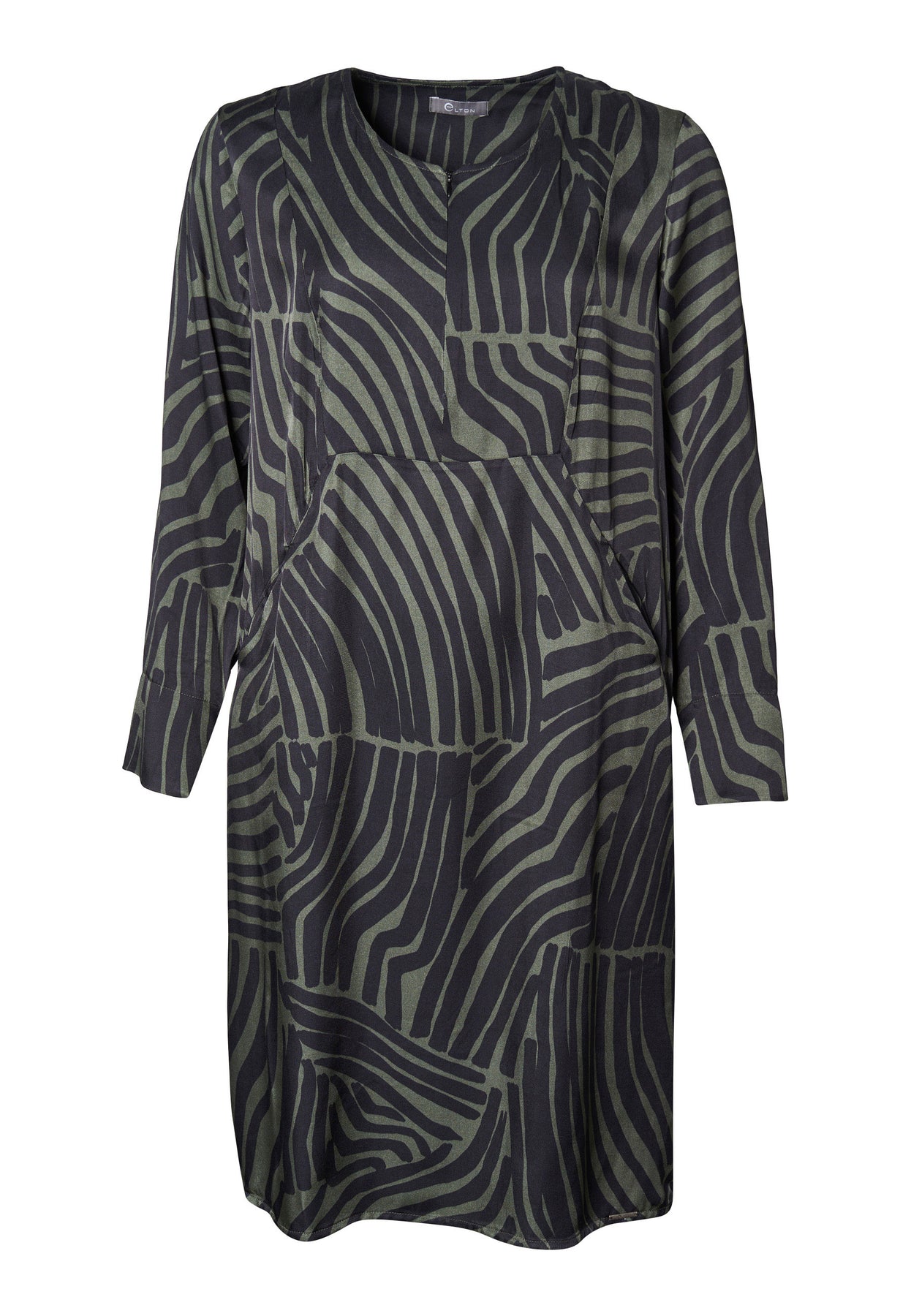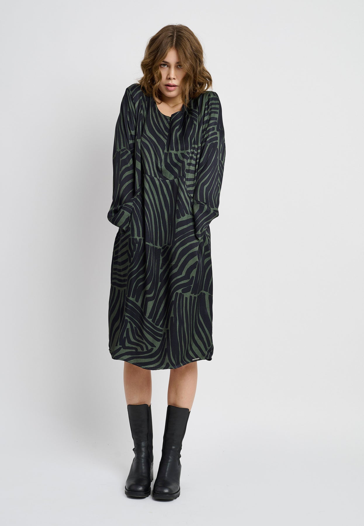 En elegant kjole med lige snit, der kombinerer komfort og raffinement. Det lette viskosestof falder smukt og giver en naturlig bevægelse, mens det diskrete mønster tilfører et sofistikeret udtryk. Kjolen har lange ærmer og en flatterende længde, som gør den velegnet til både dag- og aftenbrug.