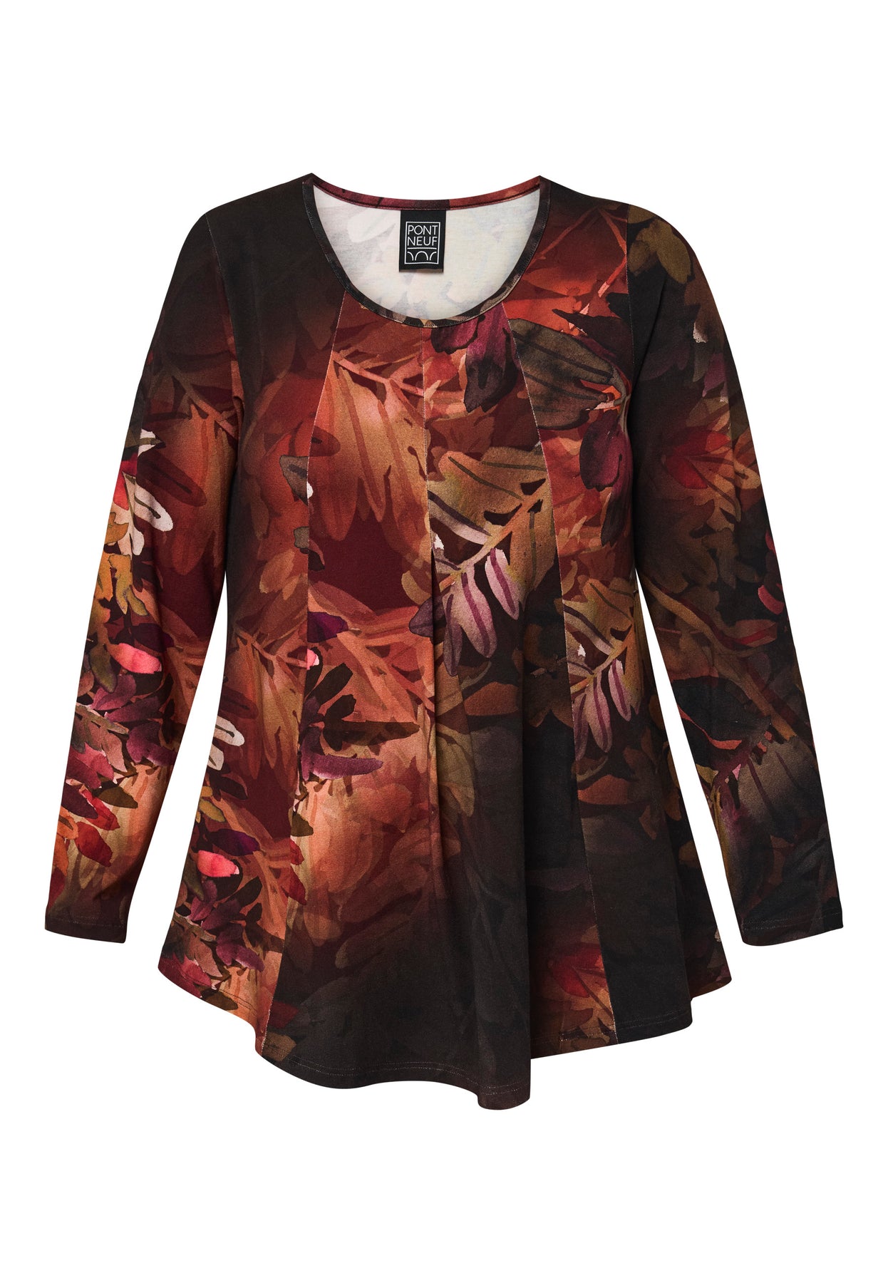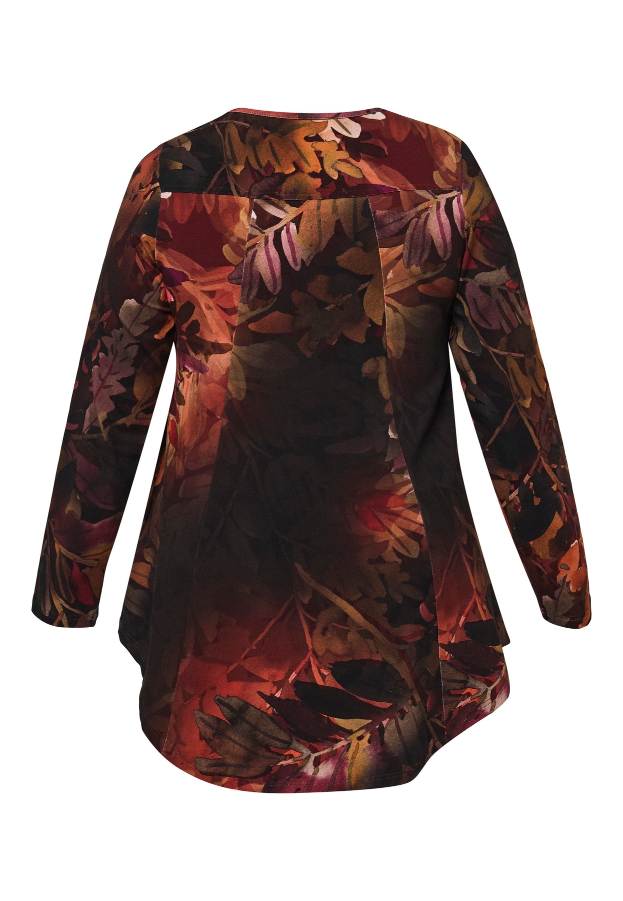 De varme nuancer af rustrød, brun og sort smelter sammen i et kunstnerisk mønster, der giver blusen et dramatisk og sofistikeret præg. Den A-formede pasform fremhæver silhuetten på en elegant måde, mens den bløde viskose med stretch føles let og fleksibel.