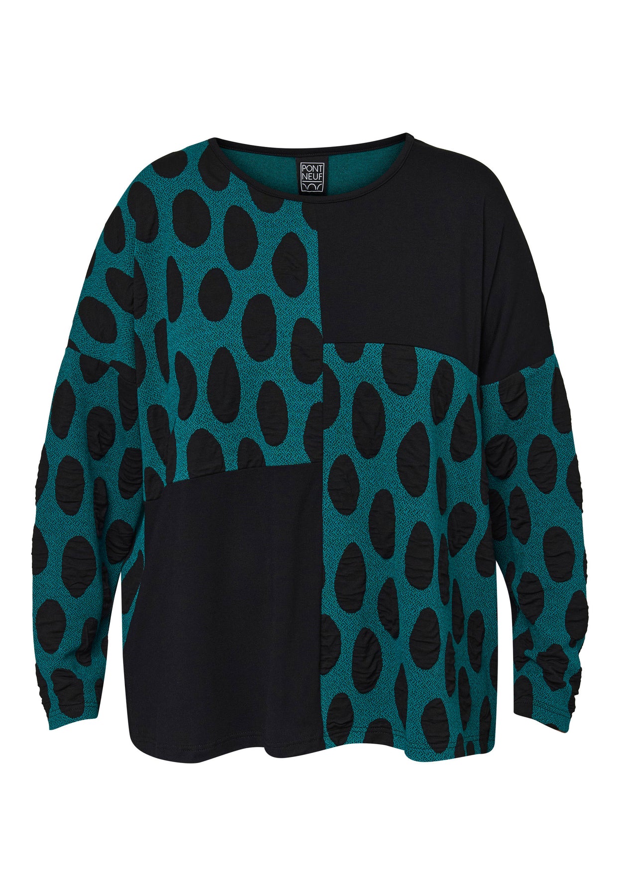 Denne bluse skiller sig ud med sit grafiske print i dybe turkisnuancer på sort bund. Pasformen er afslappet og lige, hvilket giver et ubesværet udtryk, mens den bløde viskoseblanding med lidt stretch gør den behagelig at have på hele dagen. En bluse, der hurtigt bliver en favorit til både hverdag og særlige lejligheder.