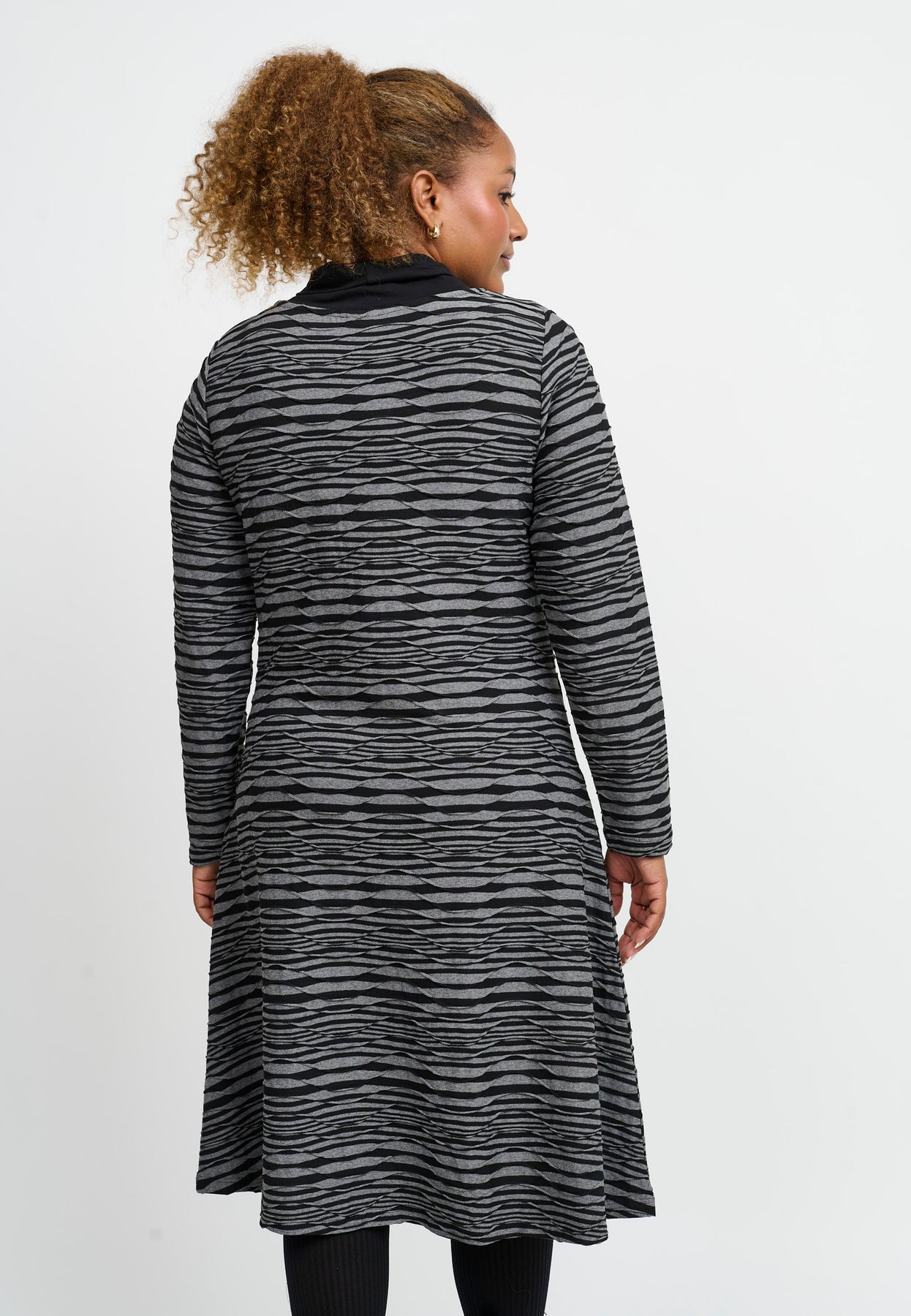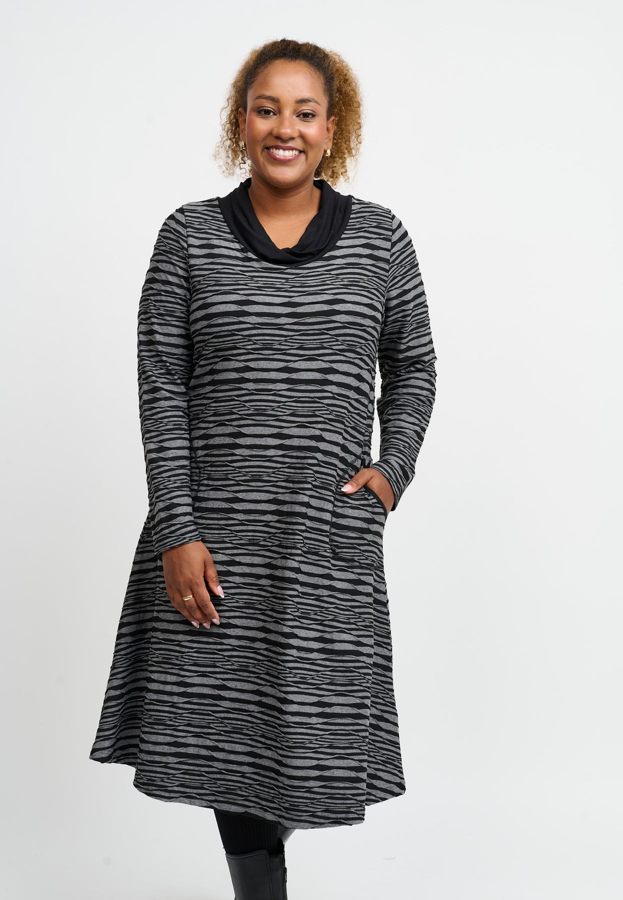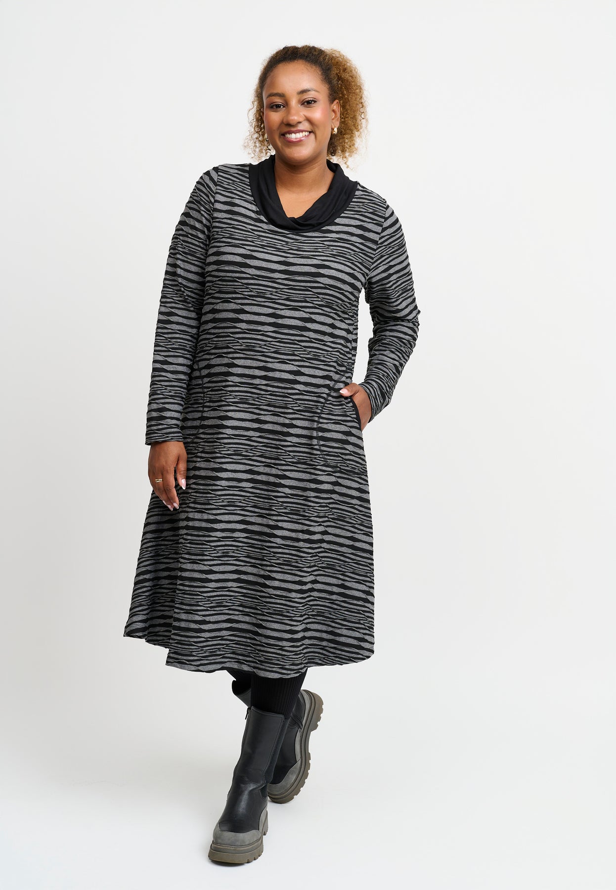 En blød og behagelig kjole med et tidløst sort-hvidt print, der giver et klassisk og stilfuldt udtryk. Den har lange ærmer, en rund hals og et A-formet snit, som falder flot og giver masser af komfort i hverdagen. Den elastiske viskoseblanding gør modellen let at bevæge sig i og perfekt til både afslapning og aktivitet.