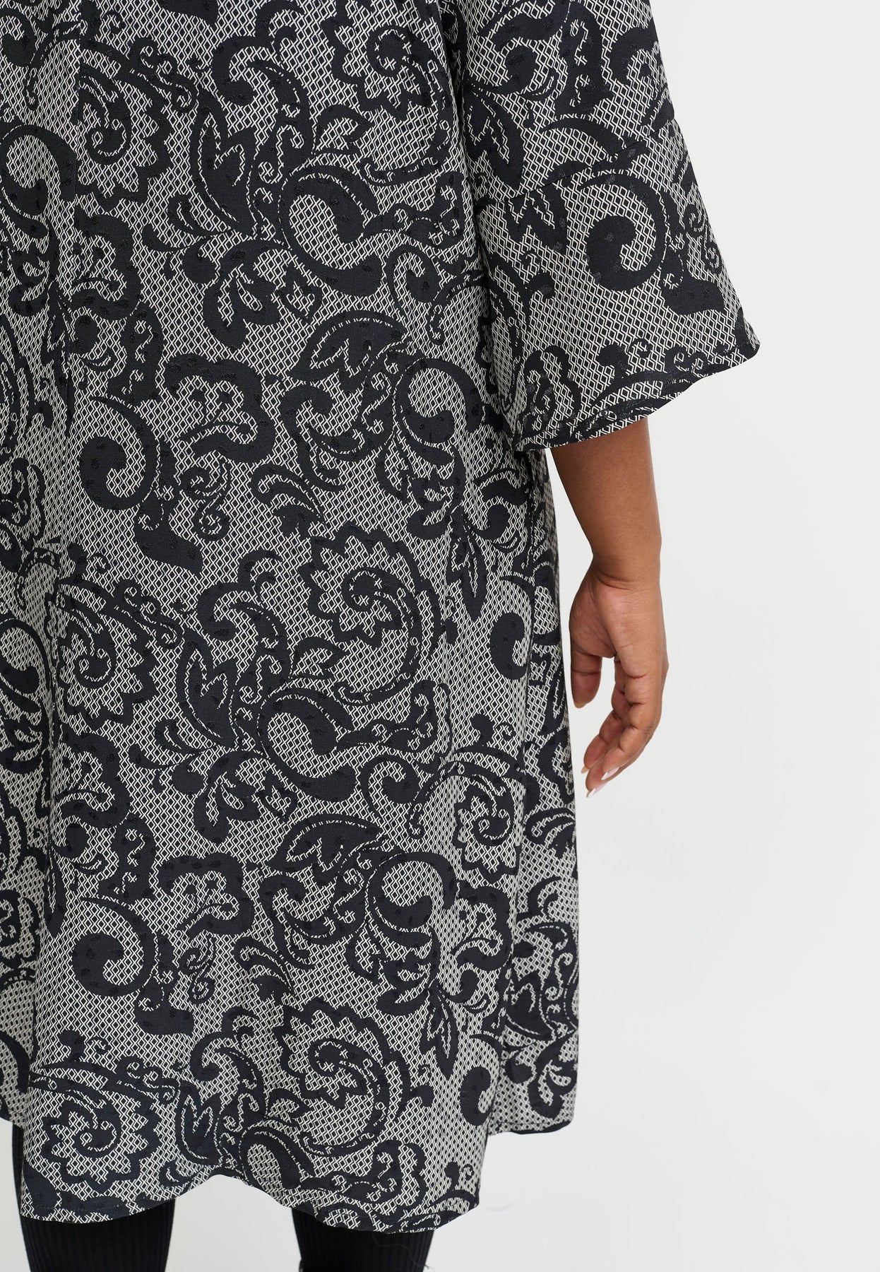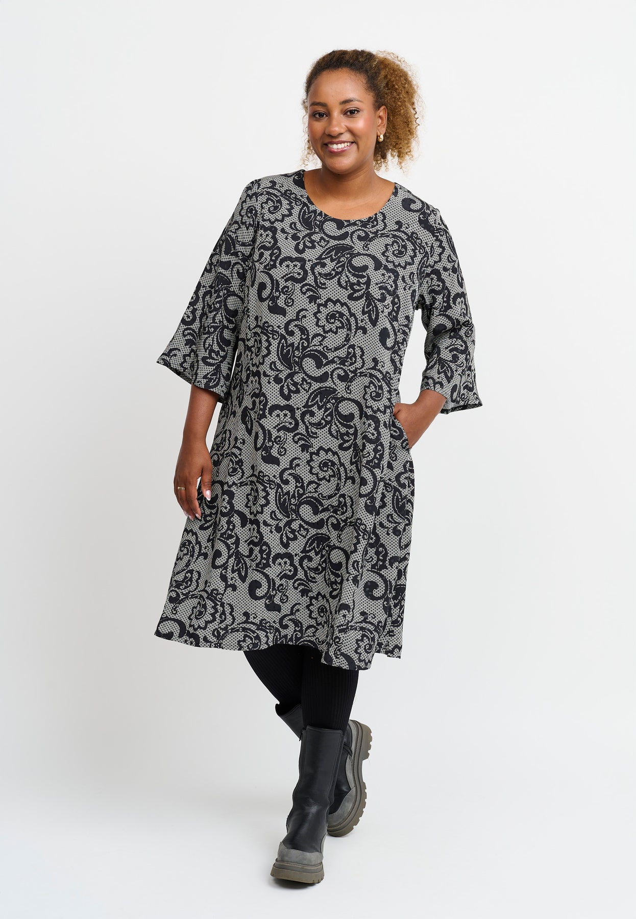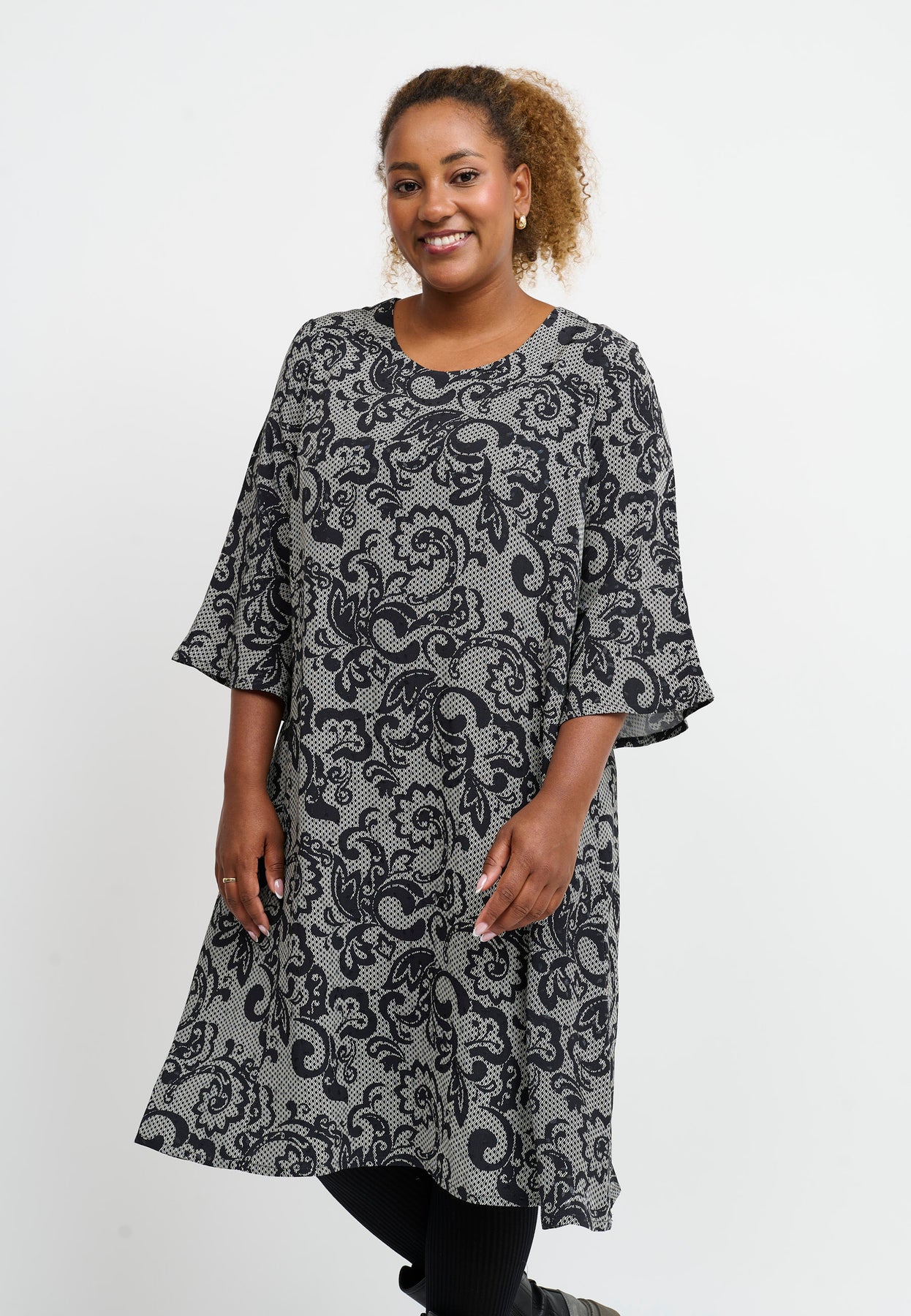 En smuk og luftig kjole med et kunstnerisk, botanisk inspireret print i sort og hvid. Det løse A-formede snit og det lette viskosemateriale skaber et elegant fald og en afslappet pasform. Den runde halsudskæring og de trekvartlange ærmer tilføjer et moderne touch til det klassiske udtryk.