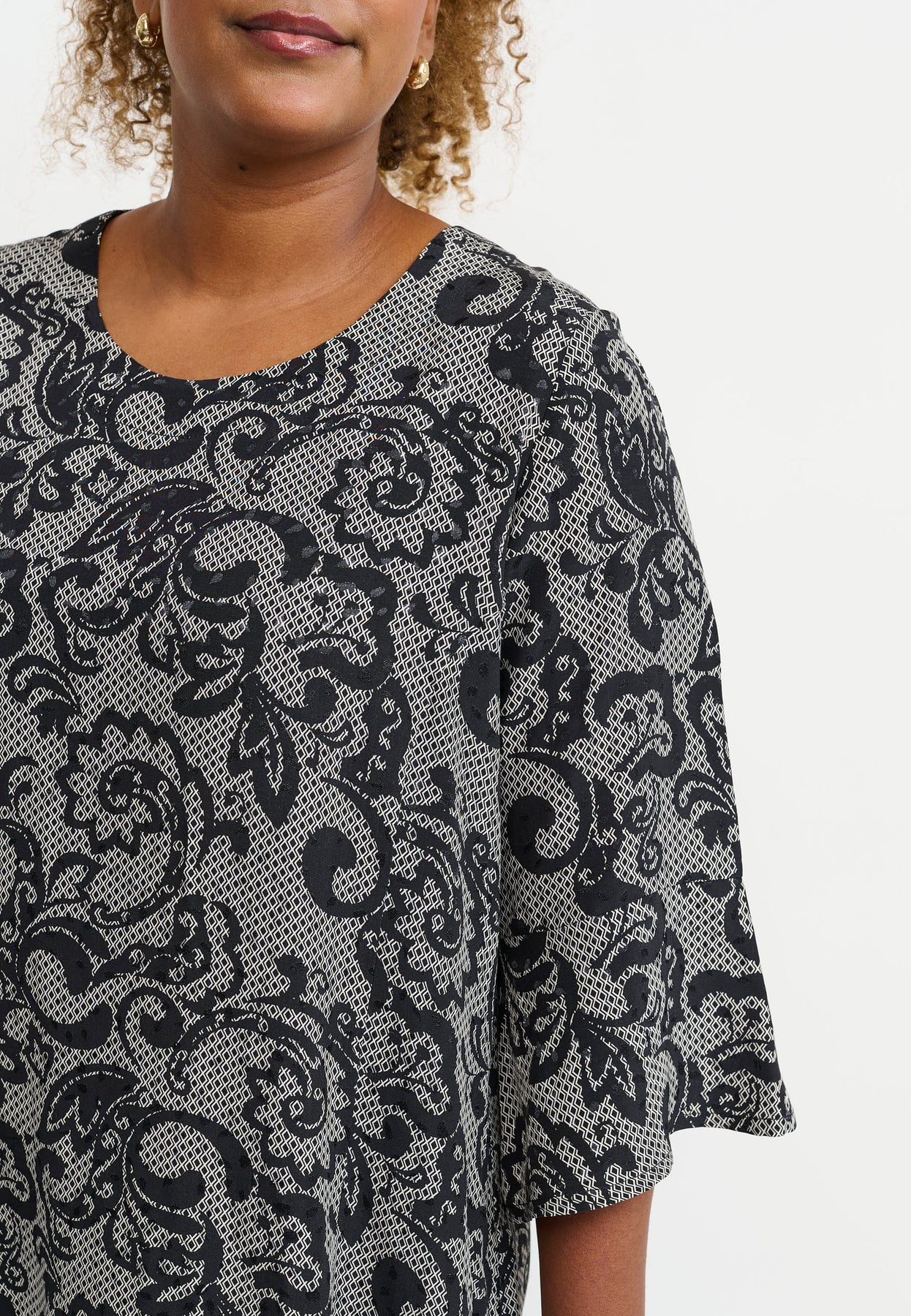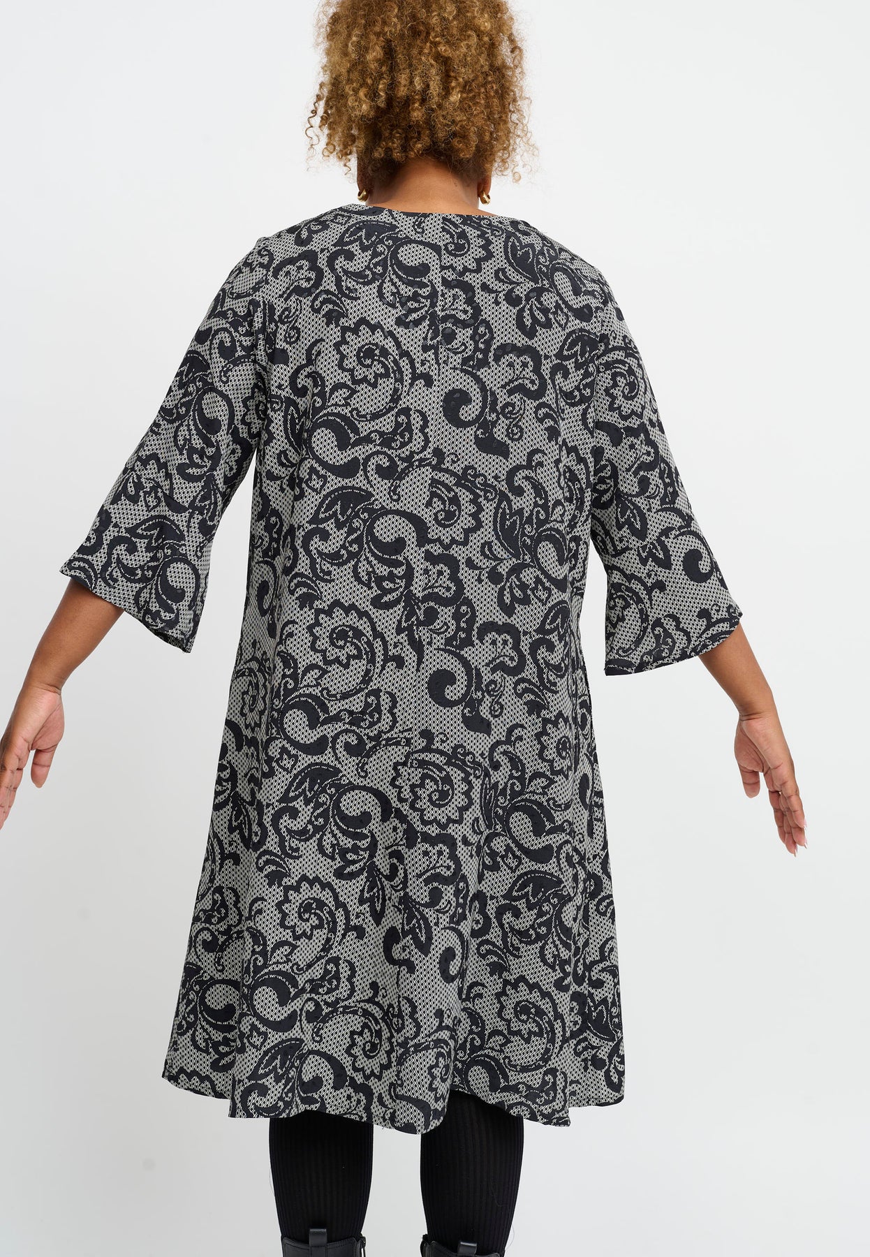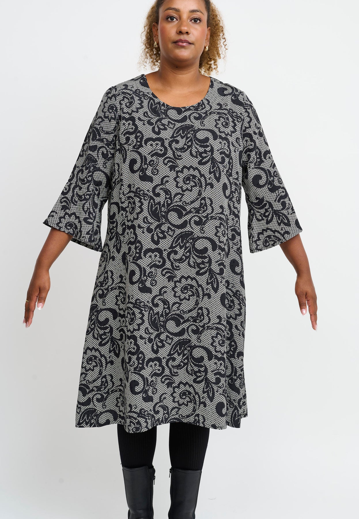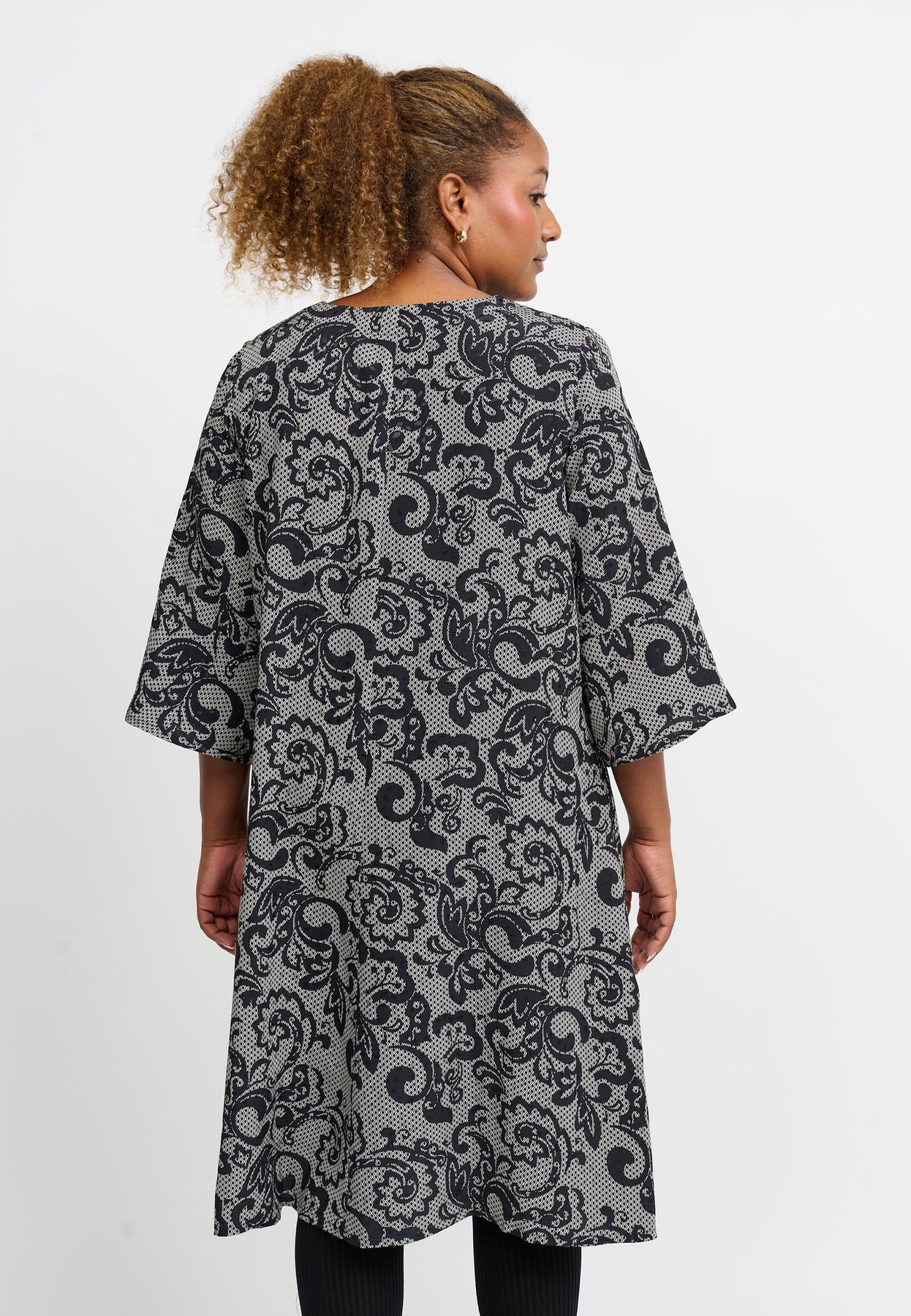 En smuk og luftig kjole med et kunstnerisk, botanisk inspireret print i sort og hvid. Det løse A-formede snit og det lette viskosemateriale skaber et elegant fald og en afslappet pasform. Den runde halsudskæring og de trekvartlange ærmer tilføjer et moderne touch til det klassiske udtryk.