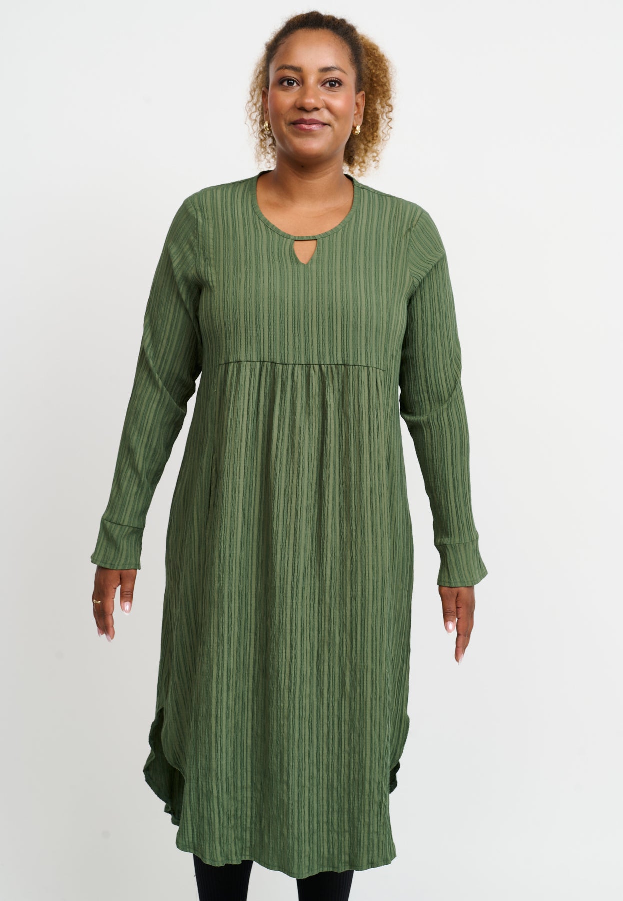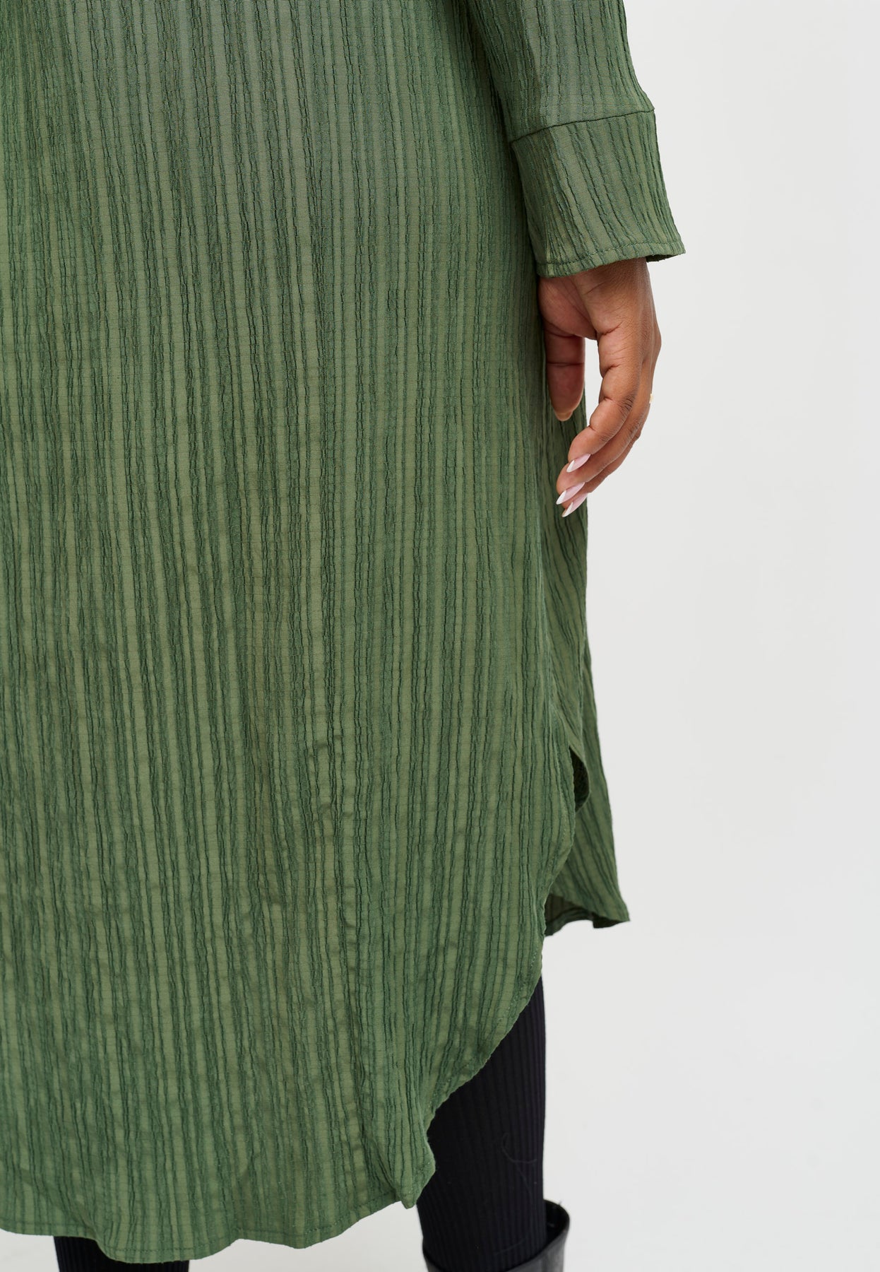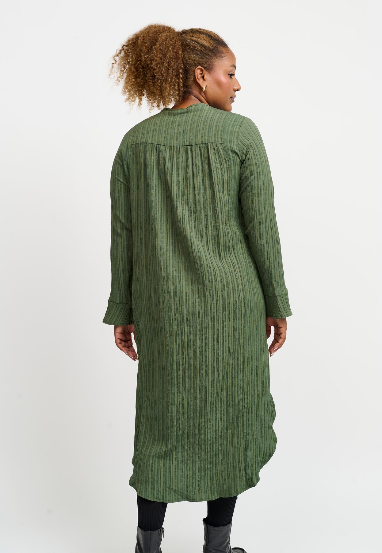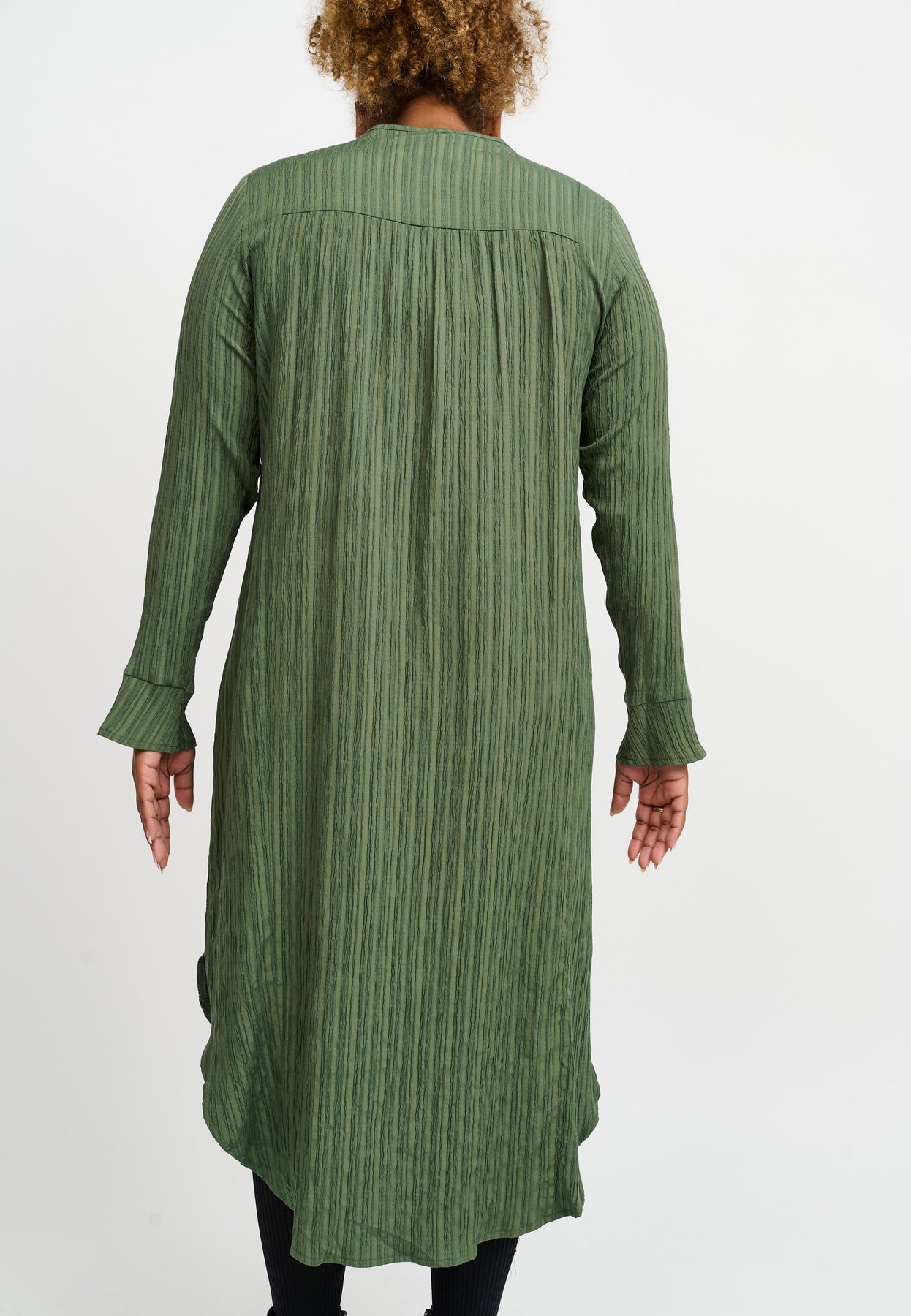En lang, elegant kjole i en smuk armygrøn nuance med asymmetrisk længde og casual detaljer. Det let strukturerede materiale har en blød og fleksibel kvalitet, mens den rummelige A-form sikrer god komfort. Kjolen har lange ærmer, knaplukning ved halsen og lommer i siden, som understreger det afslappede udtryk.