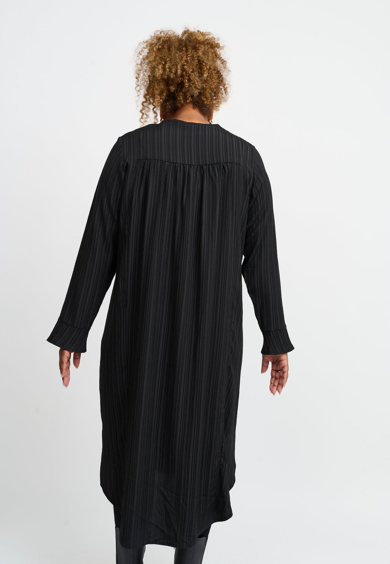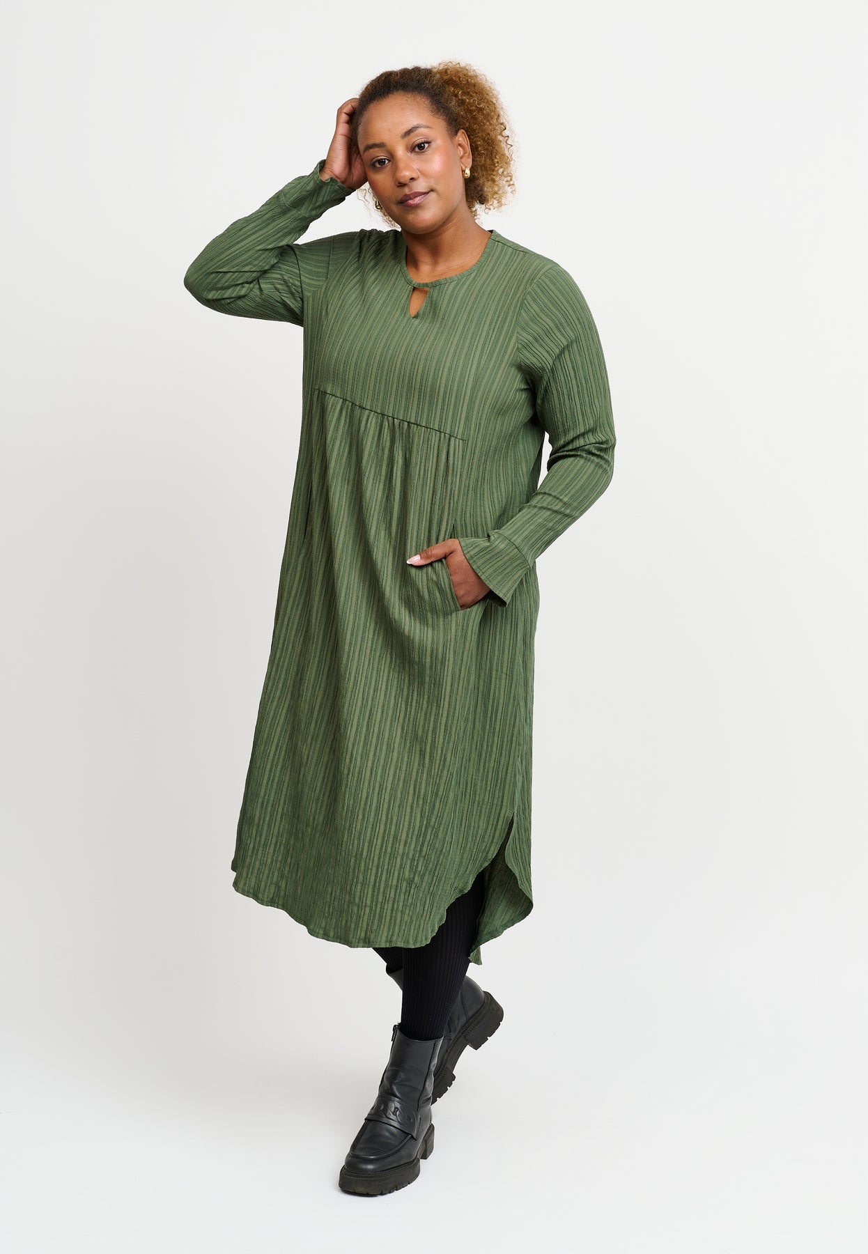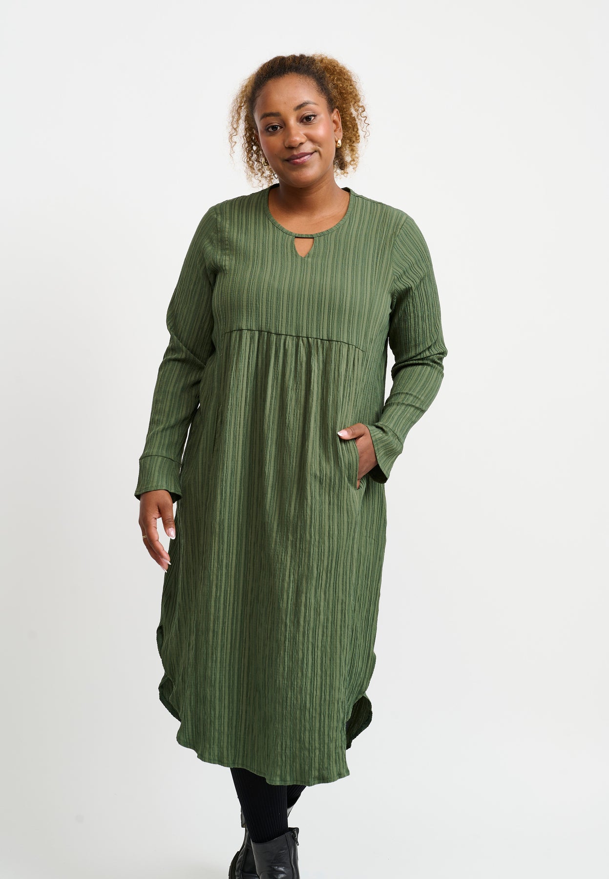 En lang, elegant kjole i en smuk armygrøn nuance med asymmetrisk længde og casual detaljer. Det let strukturerede materiale har en blød og fleksibel kvalitet, mens den rummelige A-form sikrer god komfort. Kjolen har lange ærmer, knaplukning ved halsen og lommer i siden, som understreger det afslappede udtryk.