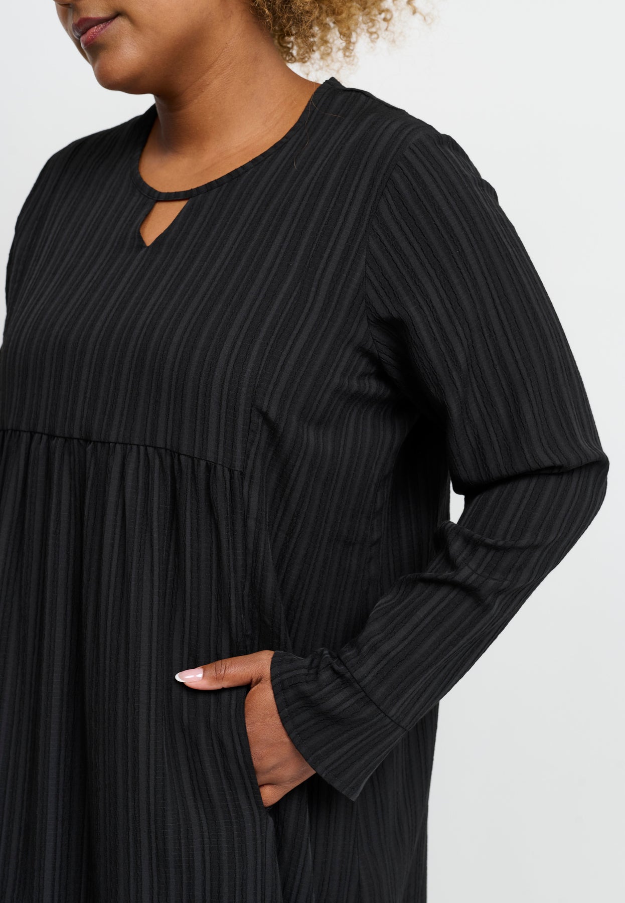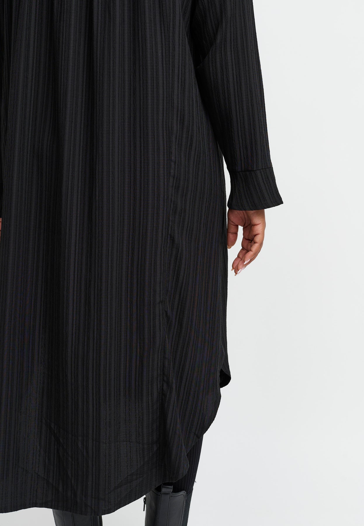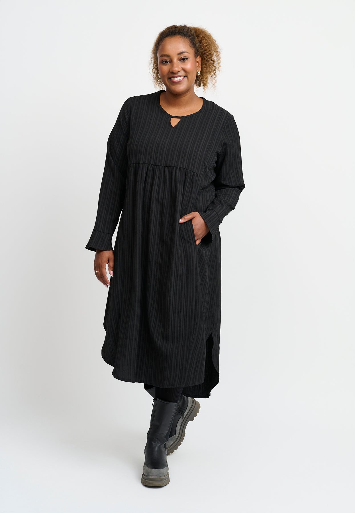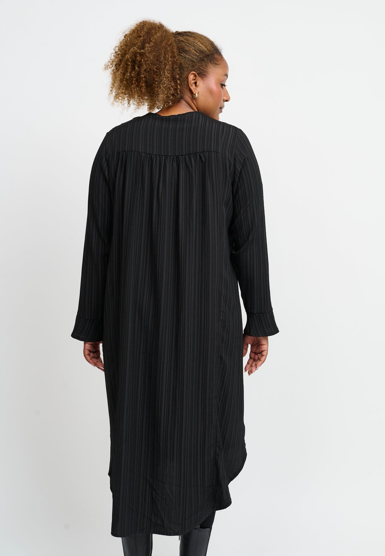 En lang, elegant kjole i en smuk armygrøn nuance med asymmetrisk længde og casual detaljer. Det let strukturerede materiale har en blød og fleksibel kvalitet, mens den rummelige A-form sikrer god komfort. Kjolen har lange ærmer, knaplukning ved halsen og lommer i siden, som understreger det afslappede udtryk.