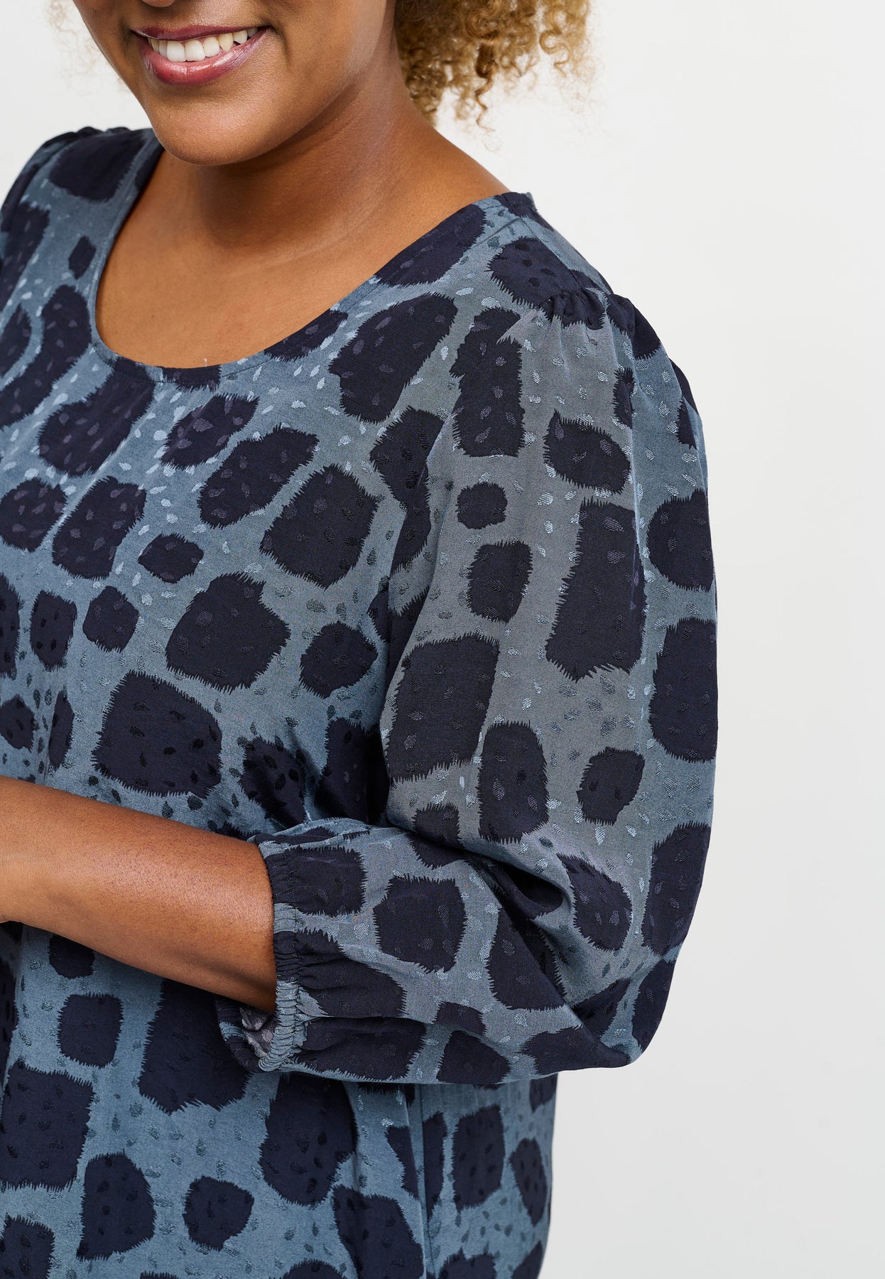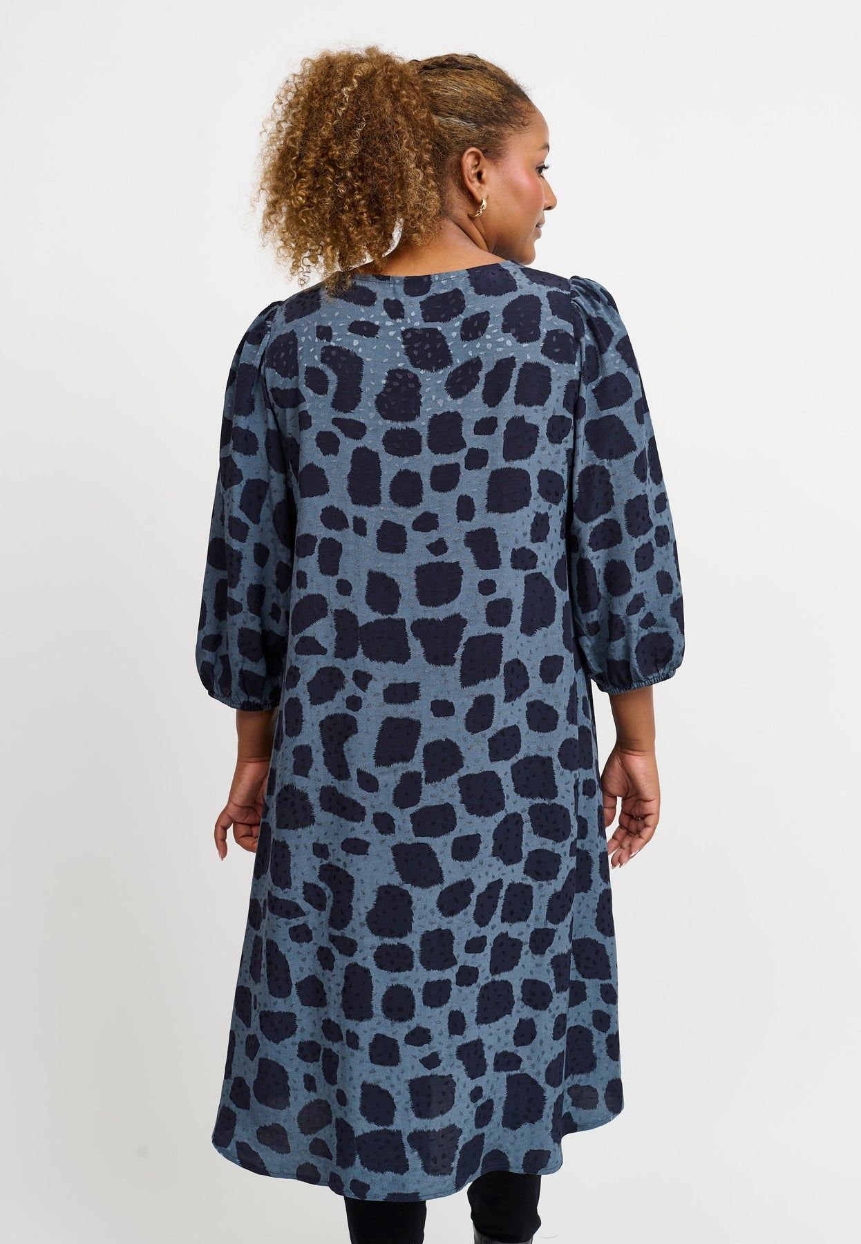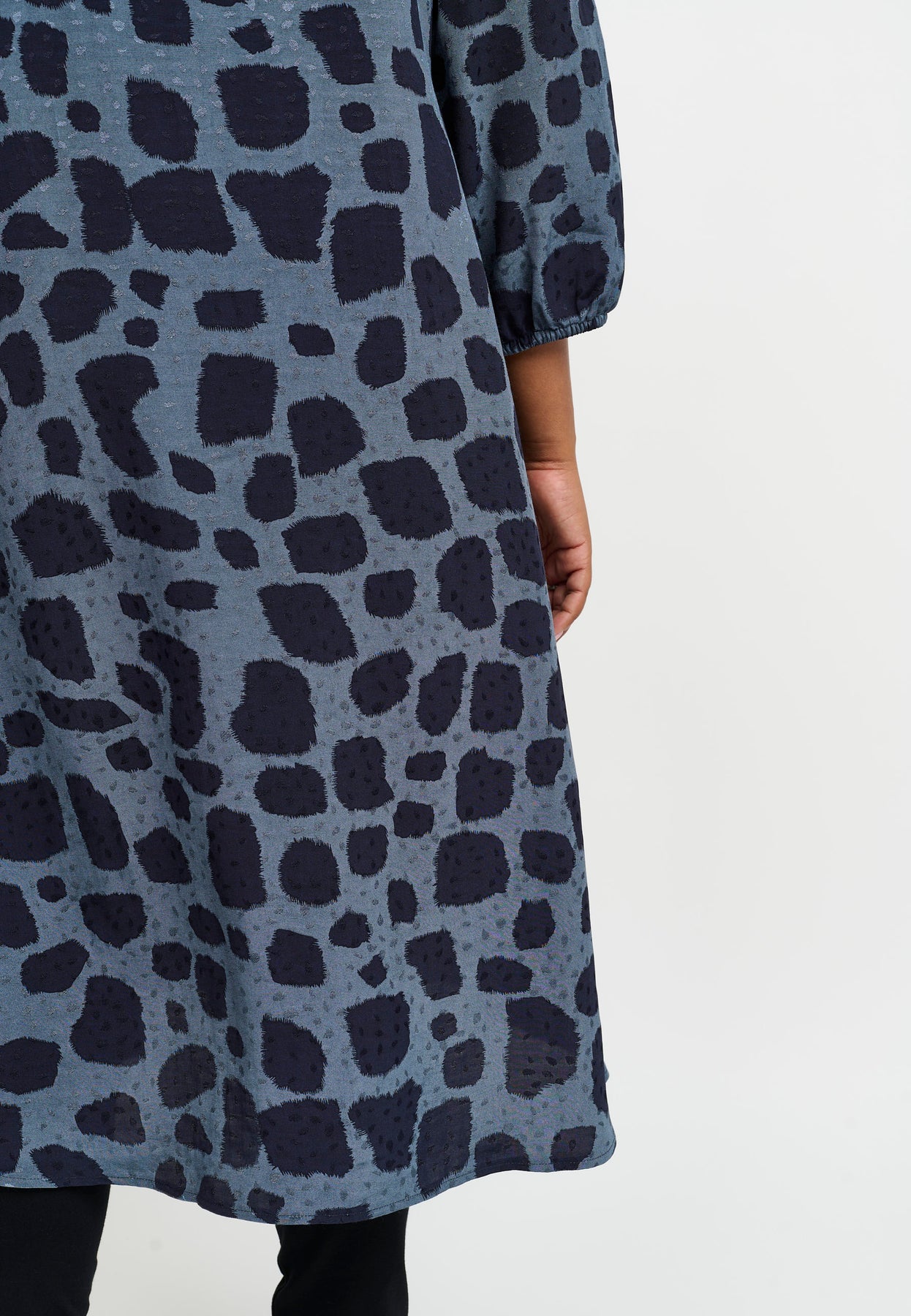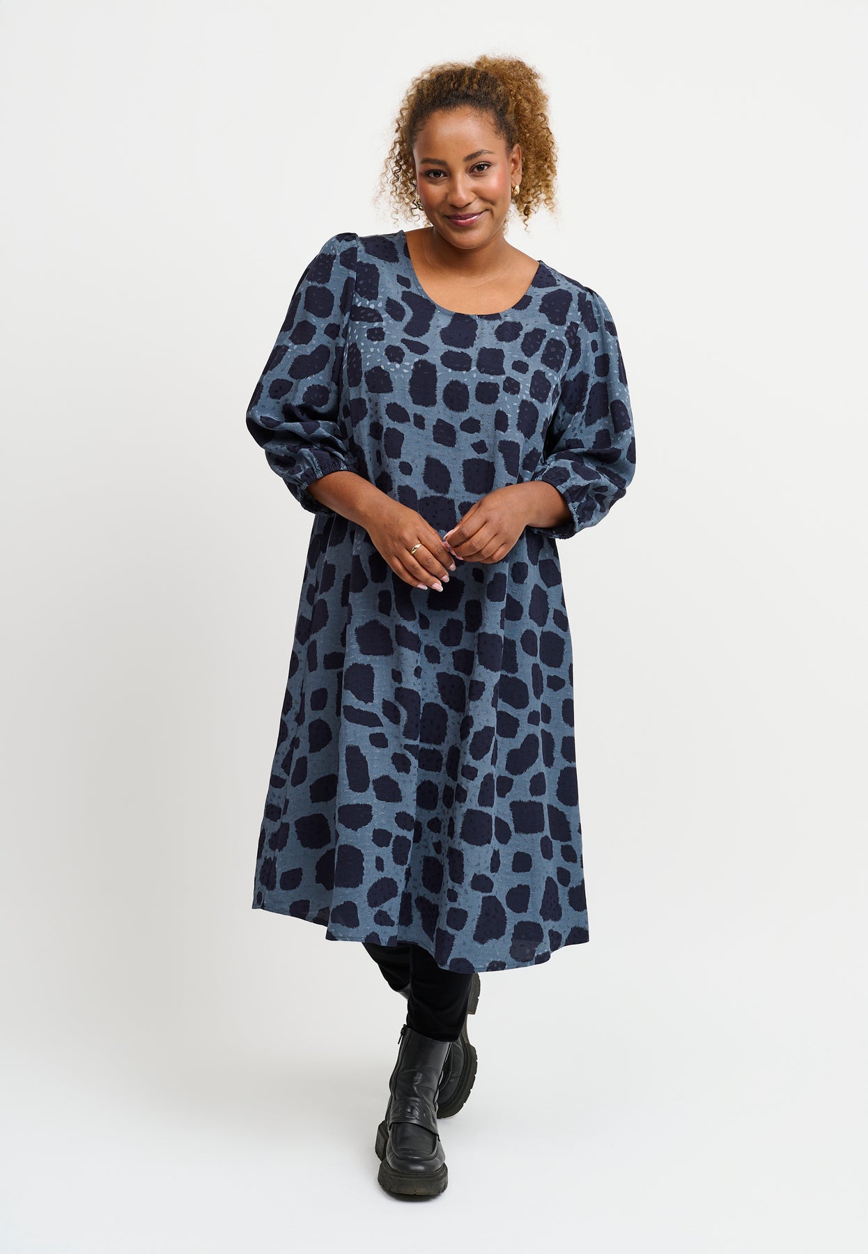En elegant og komfortabel kjole fra Pont Neuf i et flatterende A-formet snit. Det markante print i dyb blå og sort giver et moderne og iøjnefaldende udtryk, mens den runde hals og de lange ærmer tilføjer et klassisk touch. Den lette viskosekvalitet falder flot og føles behagelig mod huden.