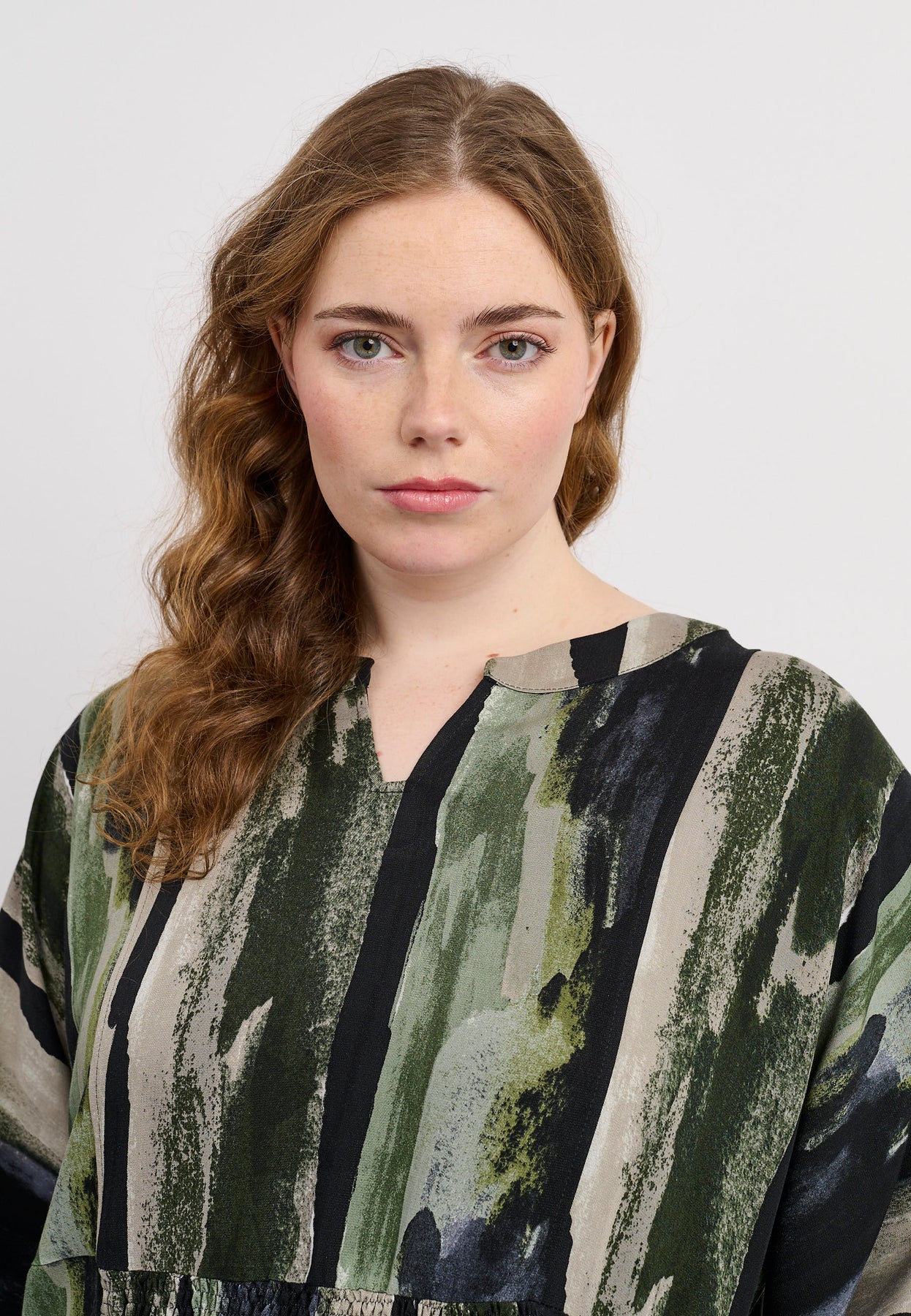 En iøjnefaldende kjole i en eksklusiv jacquardvævet kvalitet med et grafisk mønster, der emmer af karakter. Det A-formede snit giver en flatterende silhuet med god vidde og bevægelse, mens den bløde viskose føles behagelig mod huden. Designet balancerer elegance og kant – perfekt til dig, der ønsker noget særligt i garderoben.