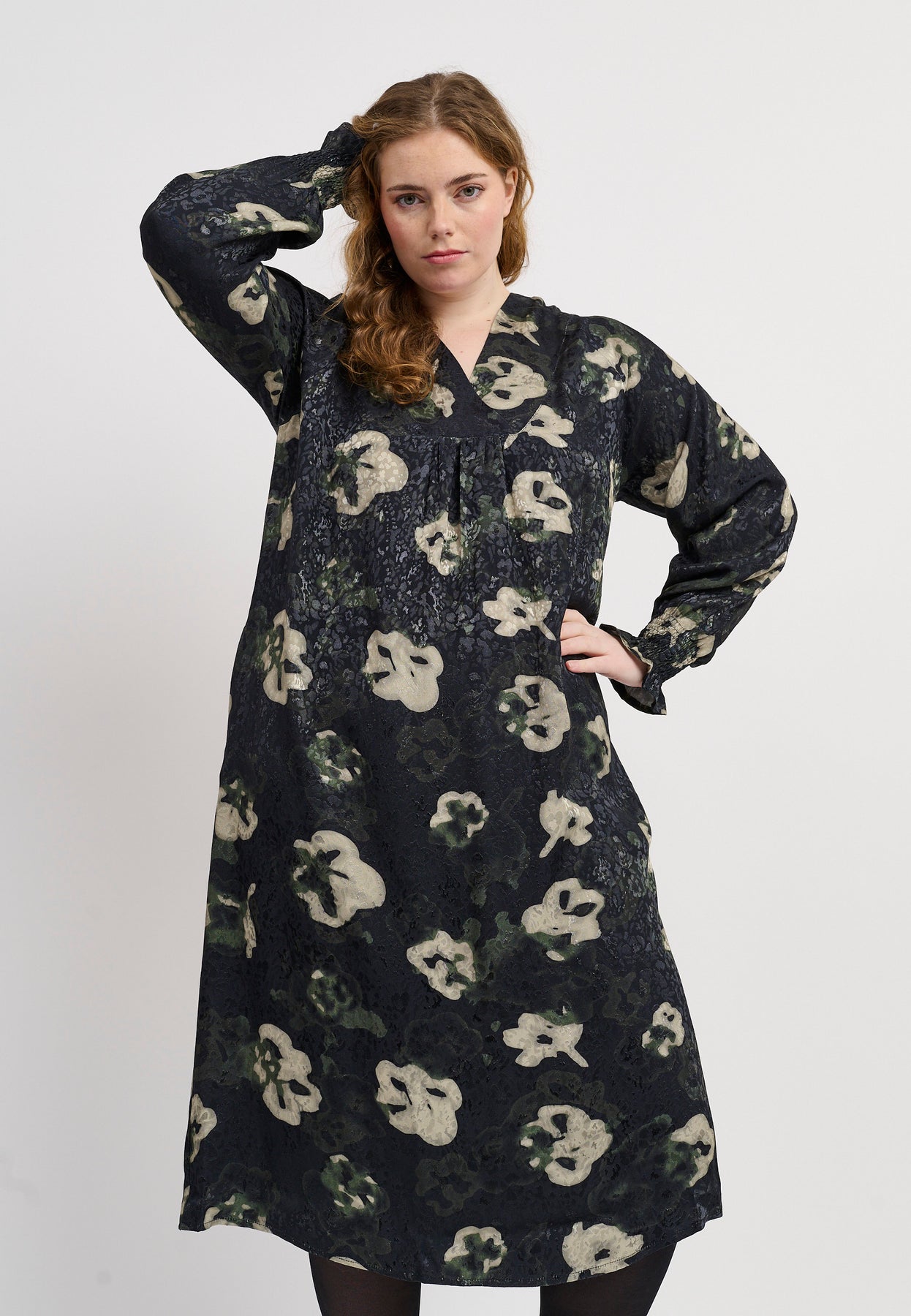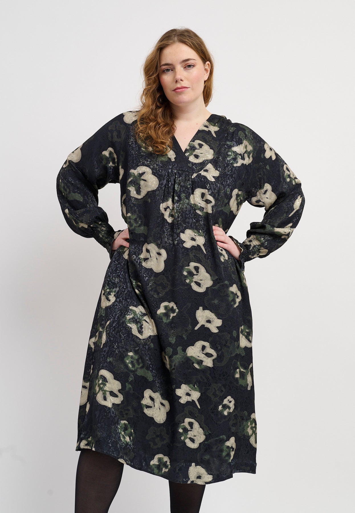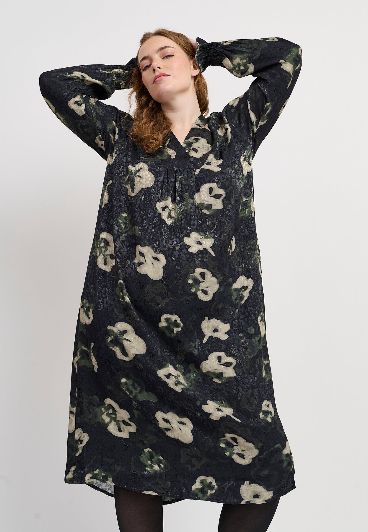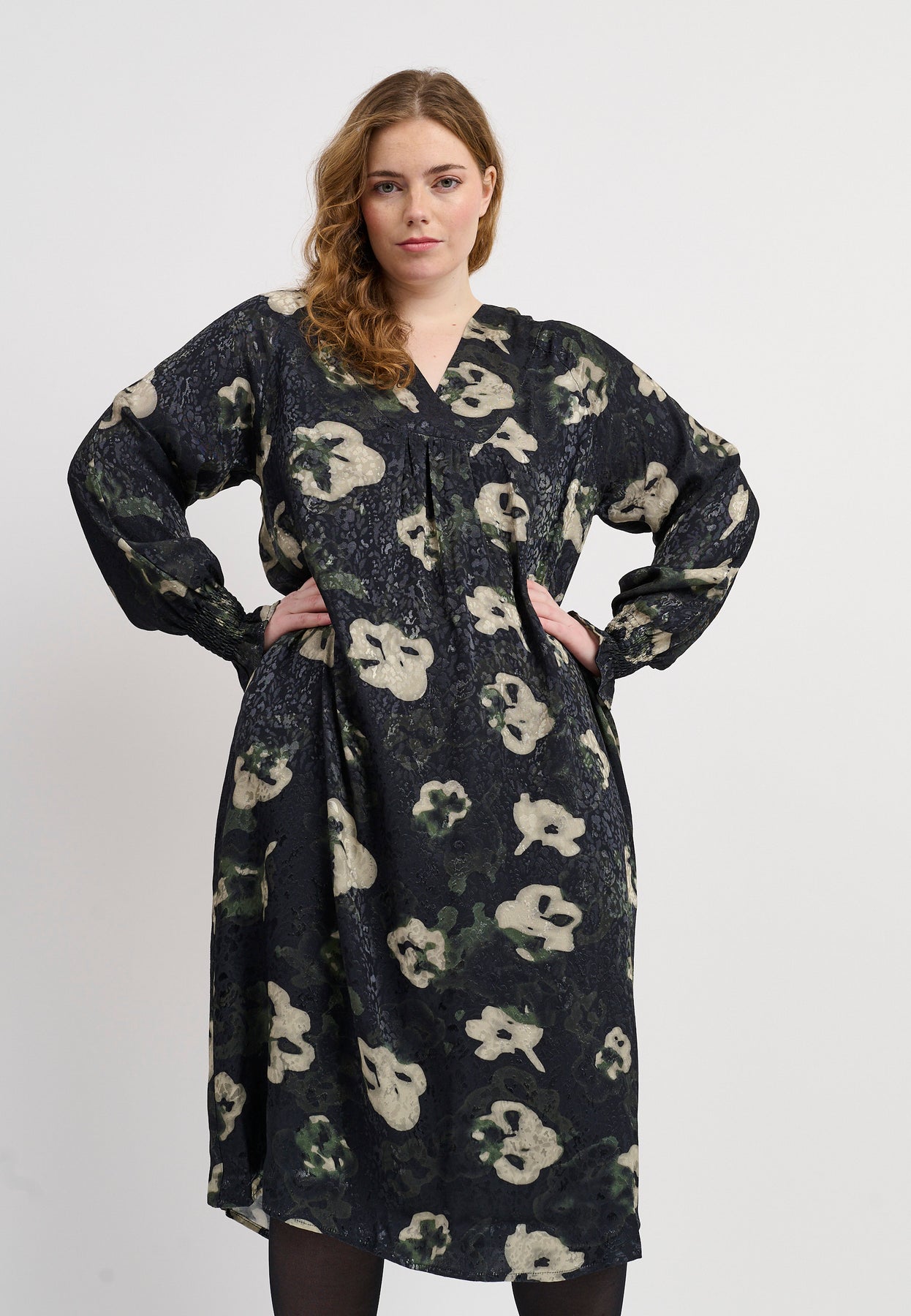 En elegant og feminin kjole med et smukt blomsterprint, der tilføjer farve og personlighed til din garderobe. Kjolen har et flatterende A-formet snit og god længde, som giver en let og flydende silhuet. Den bløde viskose føles behagelig mod huden og gør modellen ideel til både hverdagsbrug og særlige lejligheder.
