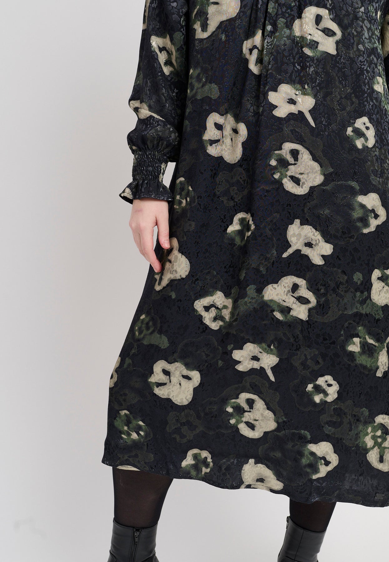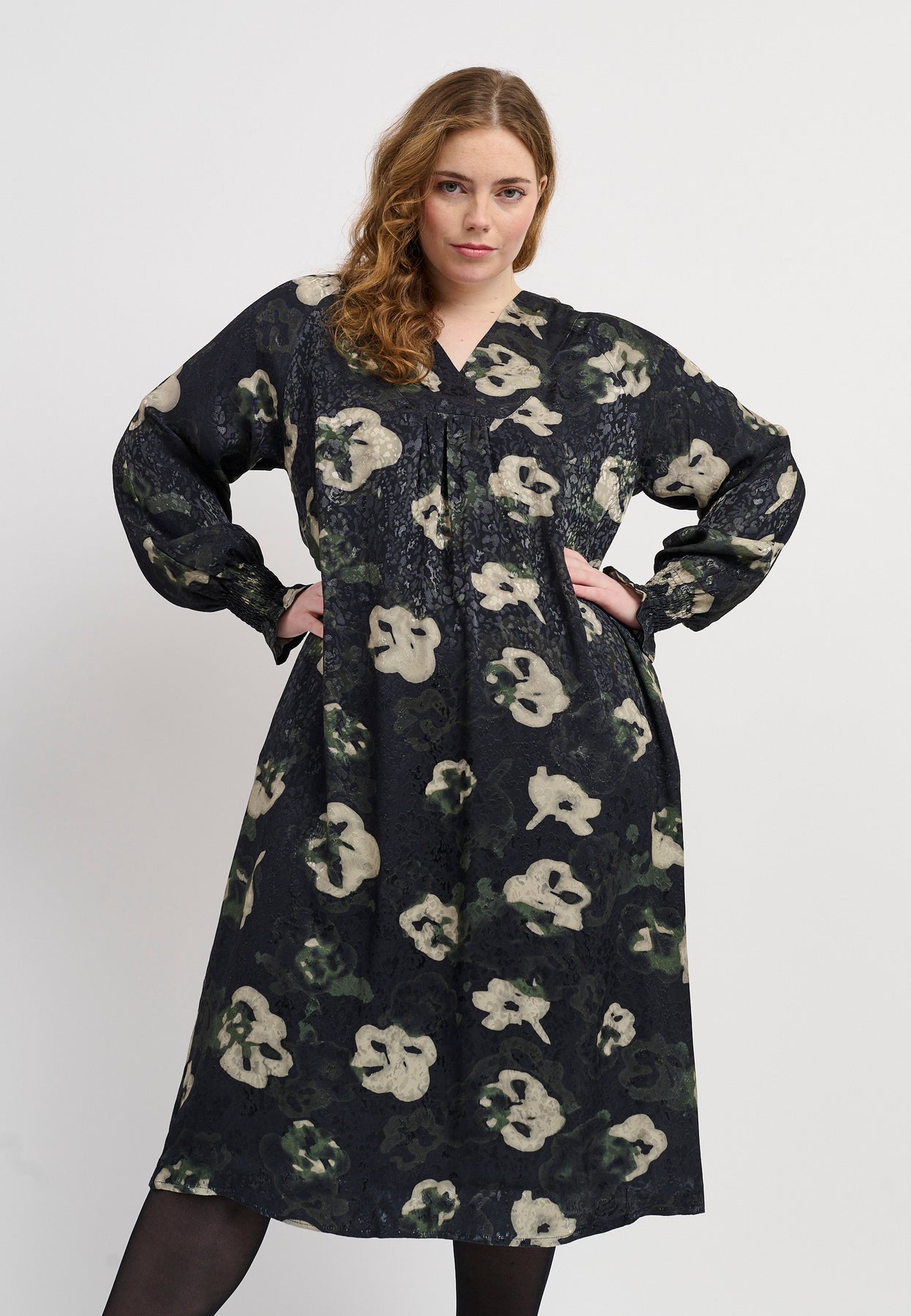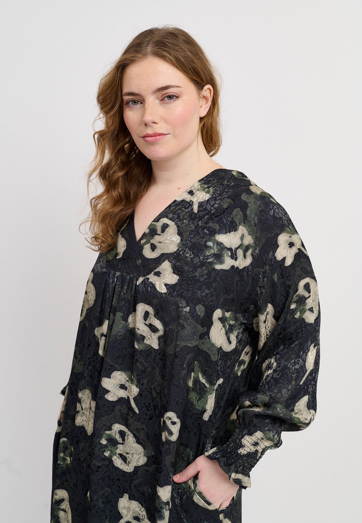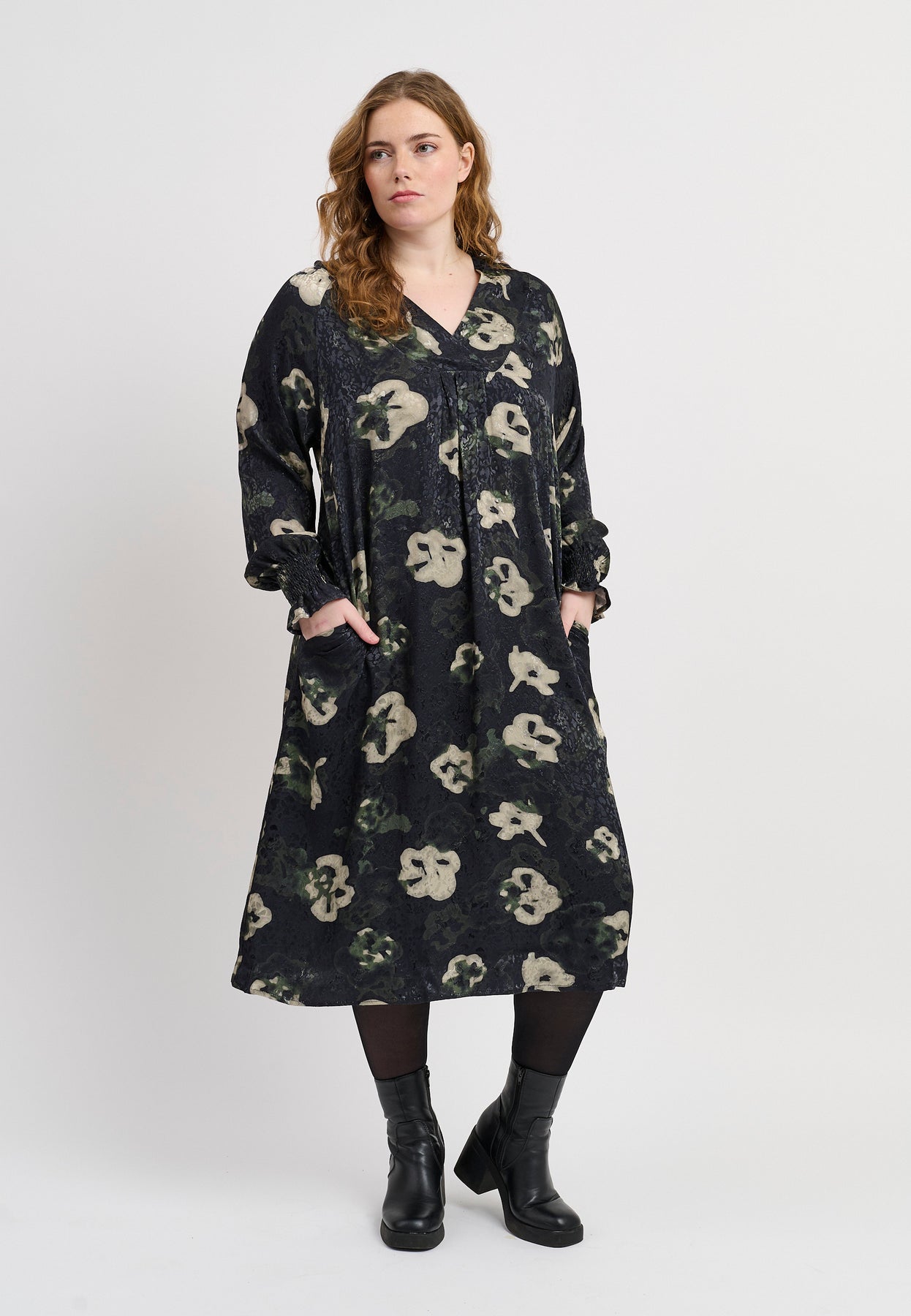 En elegant og feminin kjole med et smukt blomsterprint, der tilføjer farve og personlighed til din garderobe. Kjolen har et flatterende A-formet snit og god længde, som giver en let og flydende silhuet. Den bløde viskose føles behagelig mod huden og gør modellen ideel til både hverdagsbrug og særlige lejligheder.