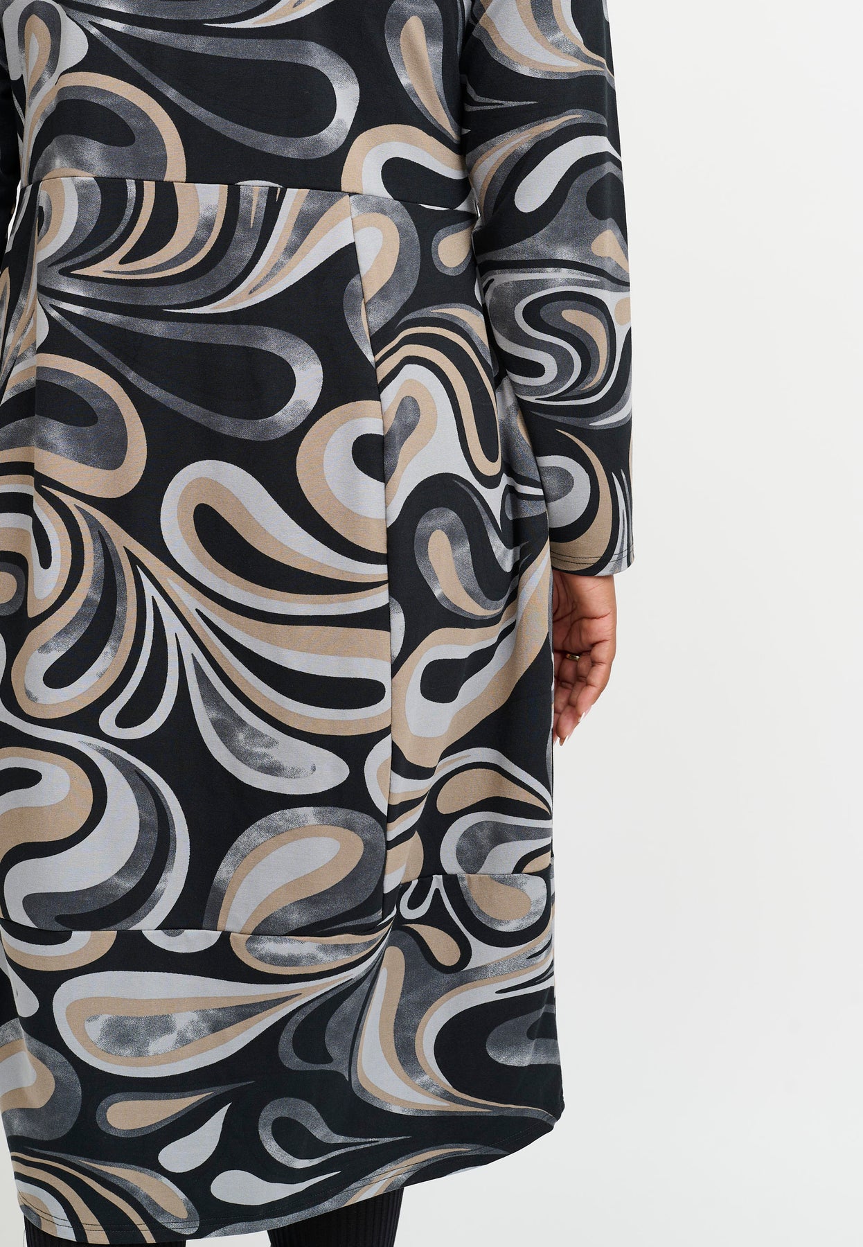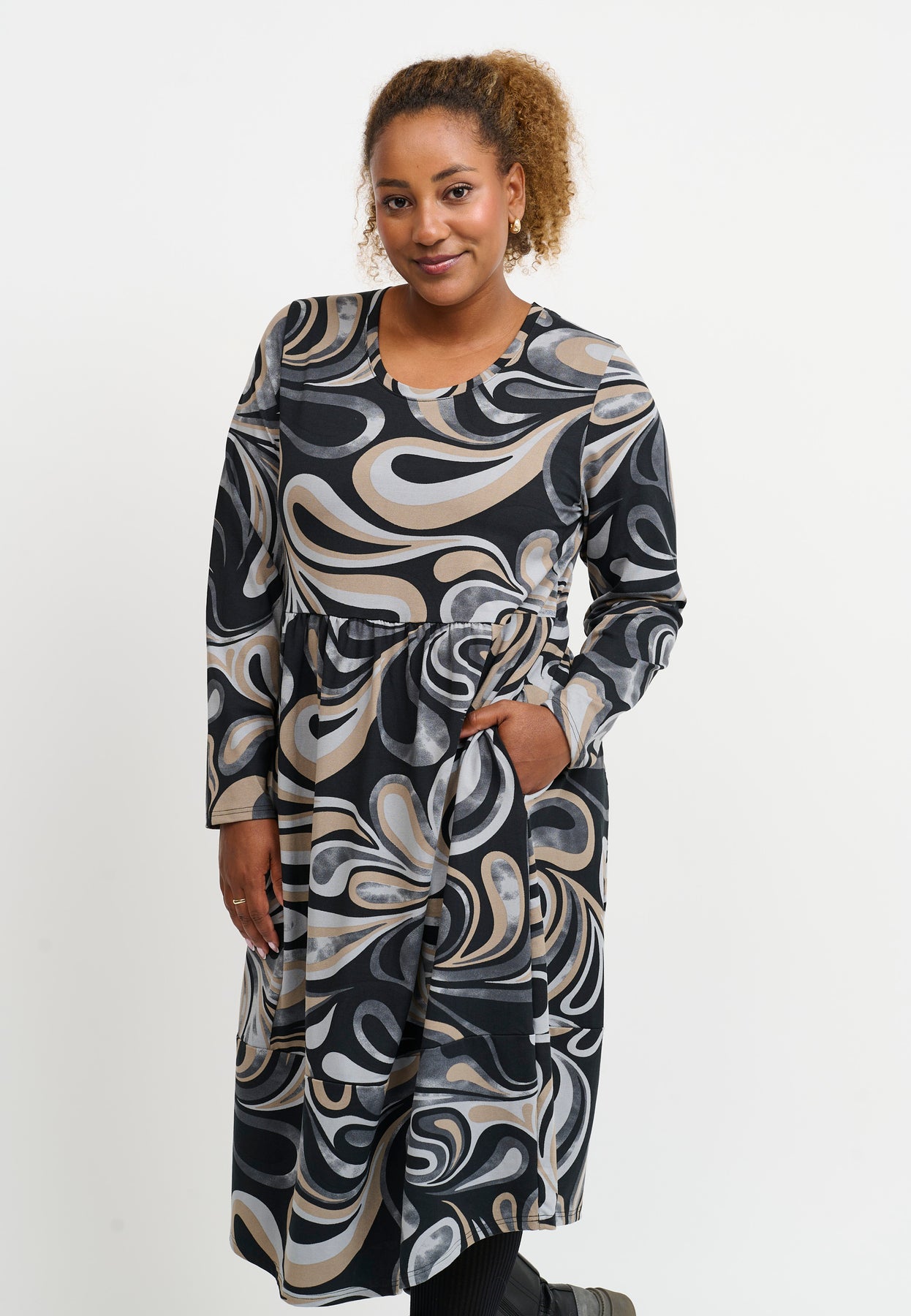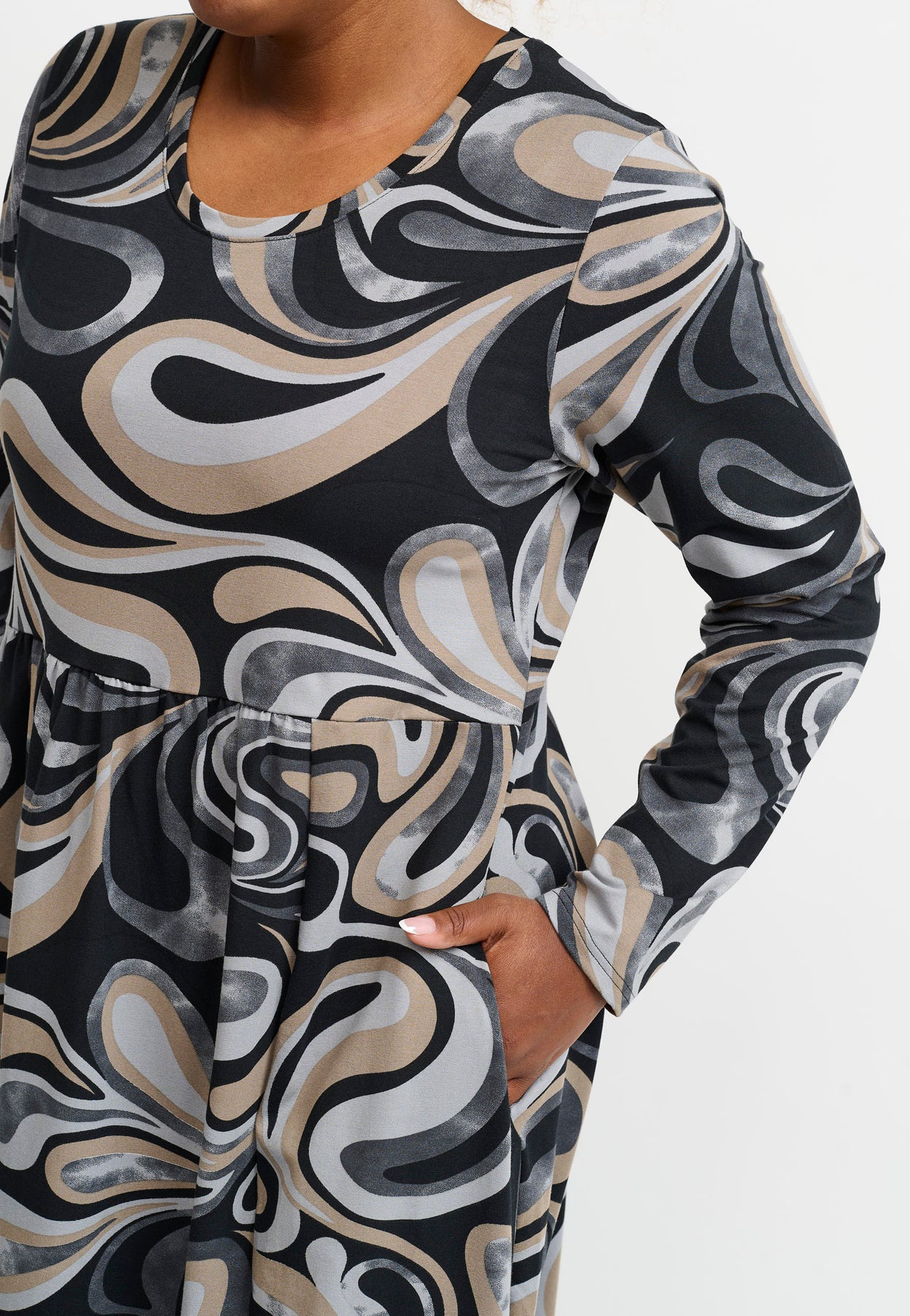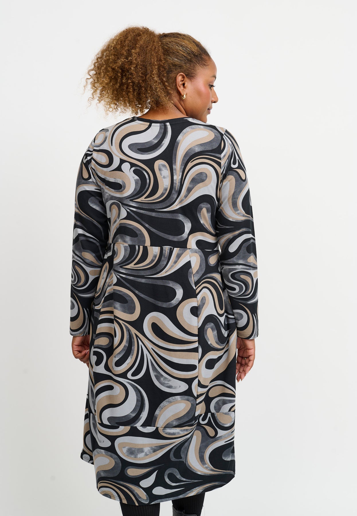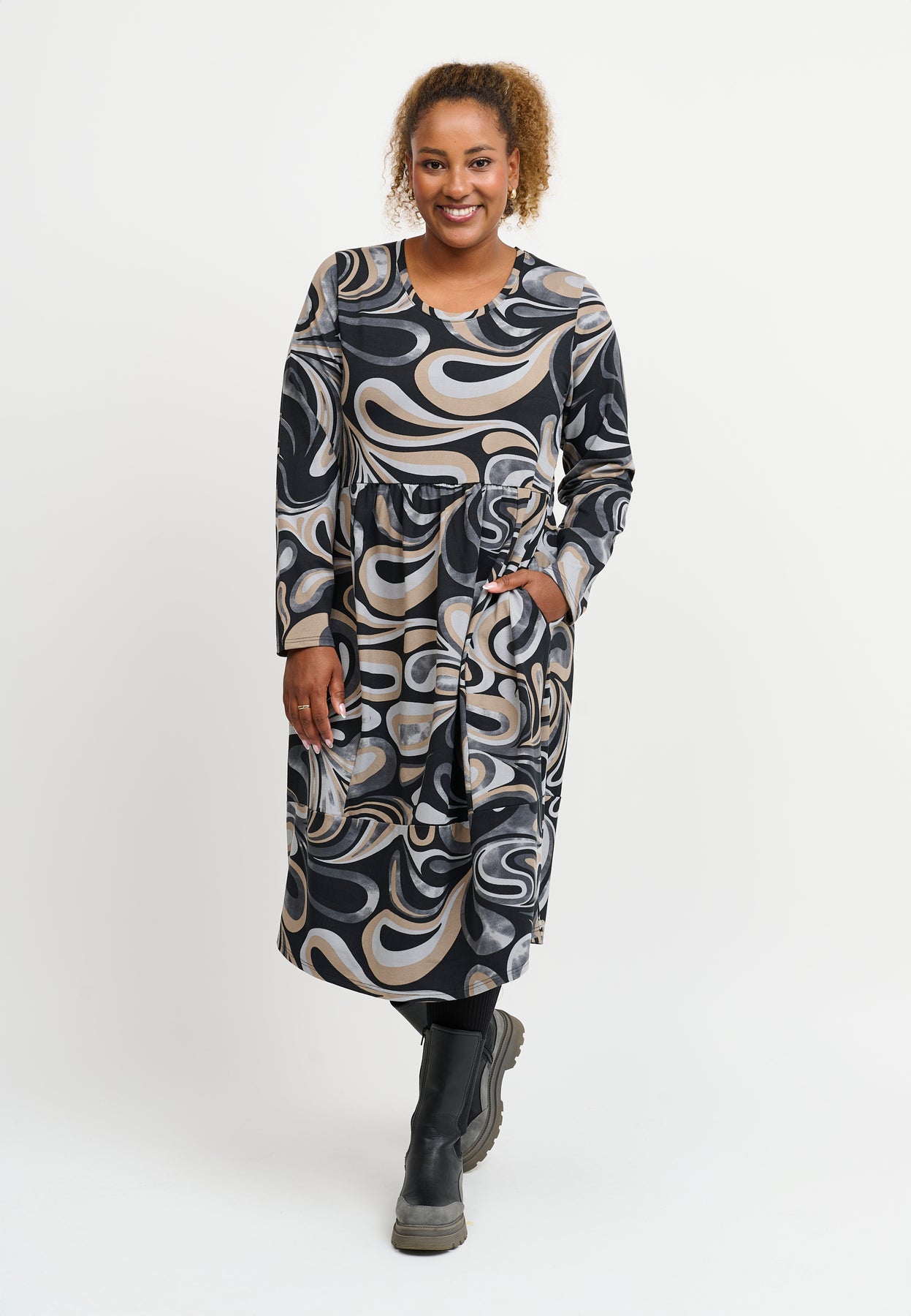 En karakterfuld kjole med ballon-effekt og et iøjnefaldende swirl-print i sort, grå og offwhite. Silhuetten er rund og rummelig med elastik forneden, som skaber den ikoniske ballonform. Den bløde og elastiske viskosekvalitet giver en behagelig pasform med masser af bevægelsesfrihed.