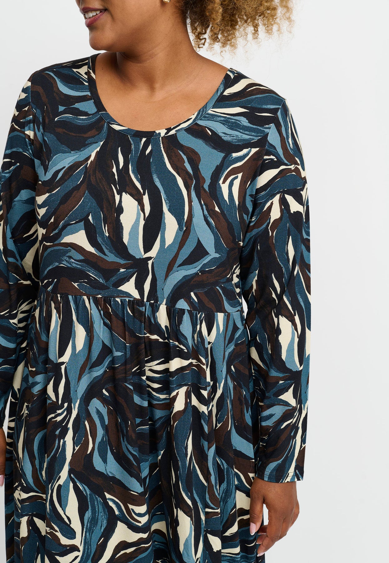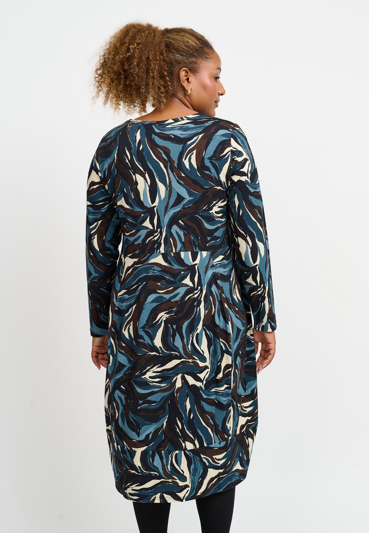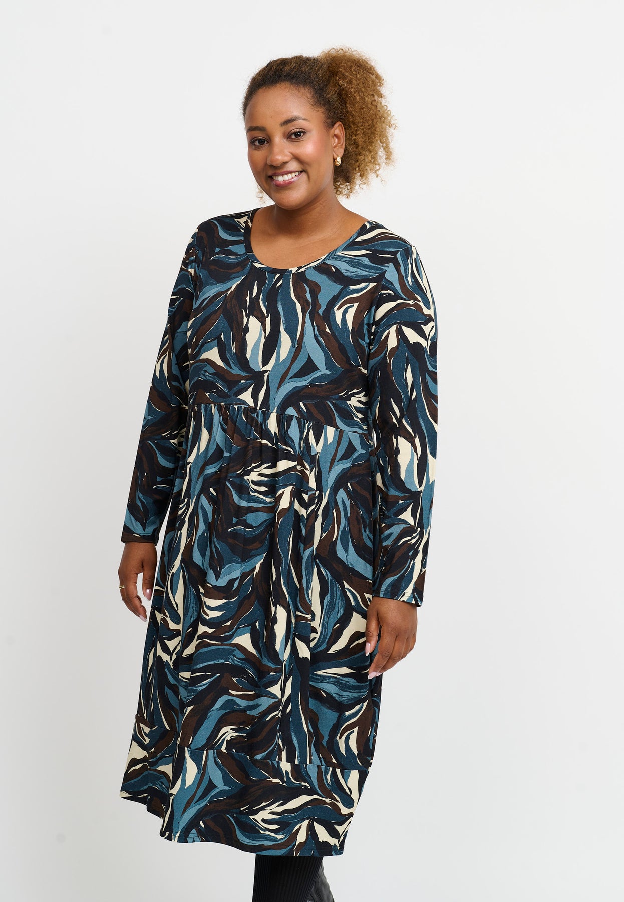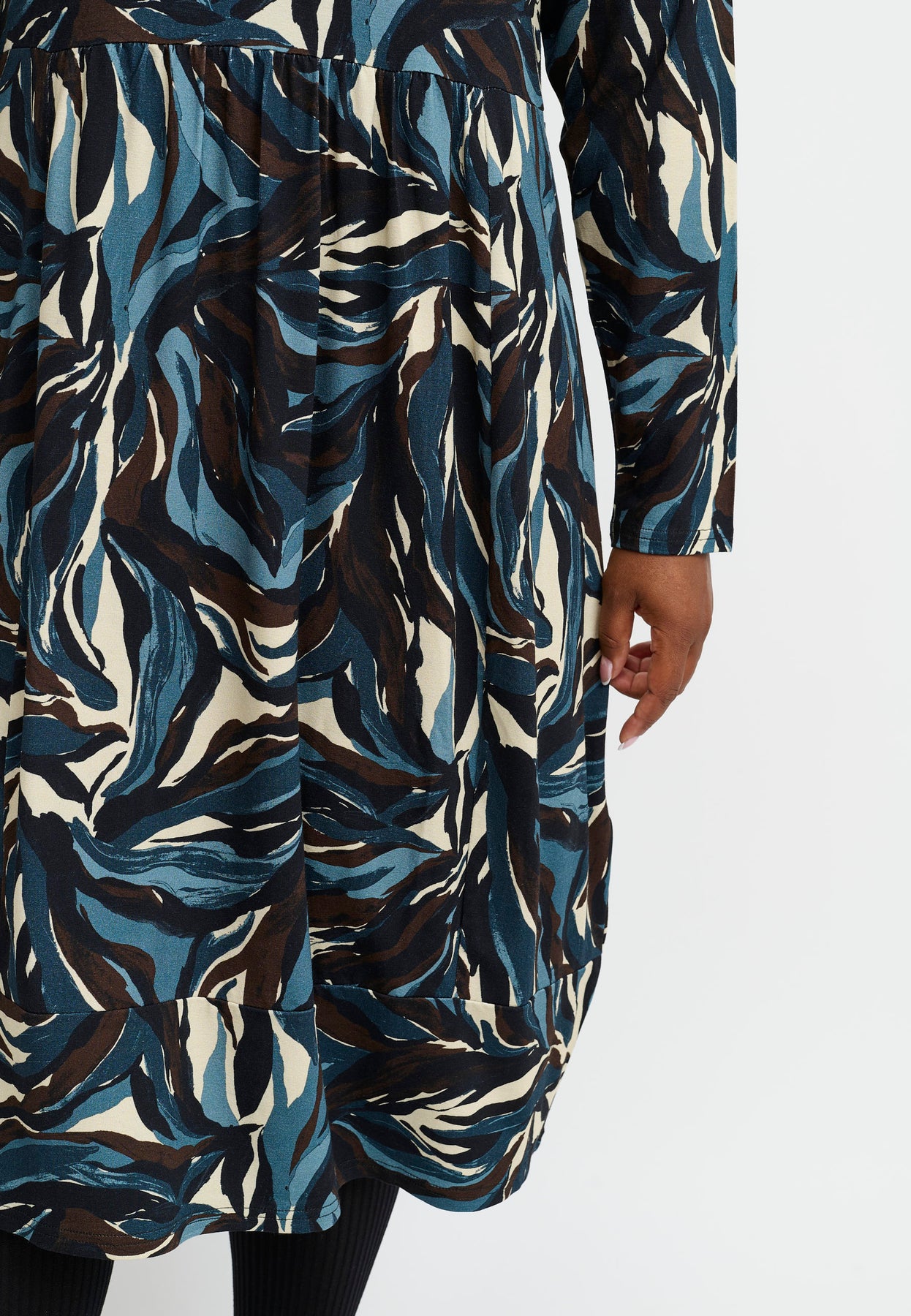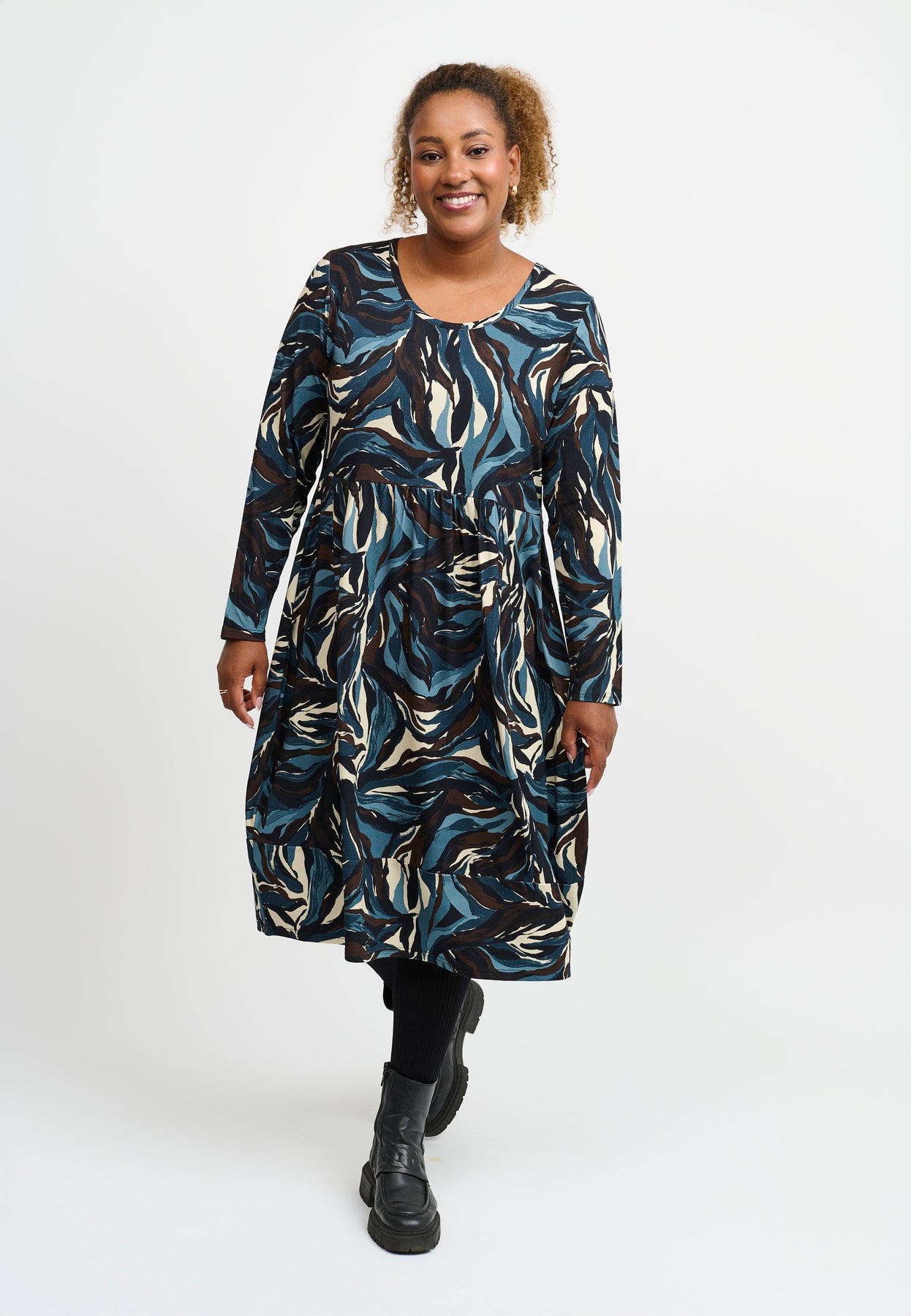 En skøn kjole med ballon-effekt og et dynamisk swirl-print i dybblå, beige og sort. Silhuetten er løs og rund med elastik i bunden, som skaber den karakteristiske ballonform. Den elastiske viskosekvalitet føles blød og fleksibel, så kjolen er både behagelig og flatterende at have på.