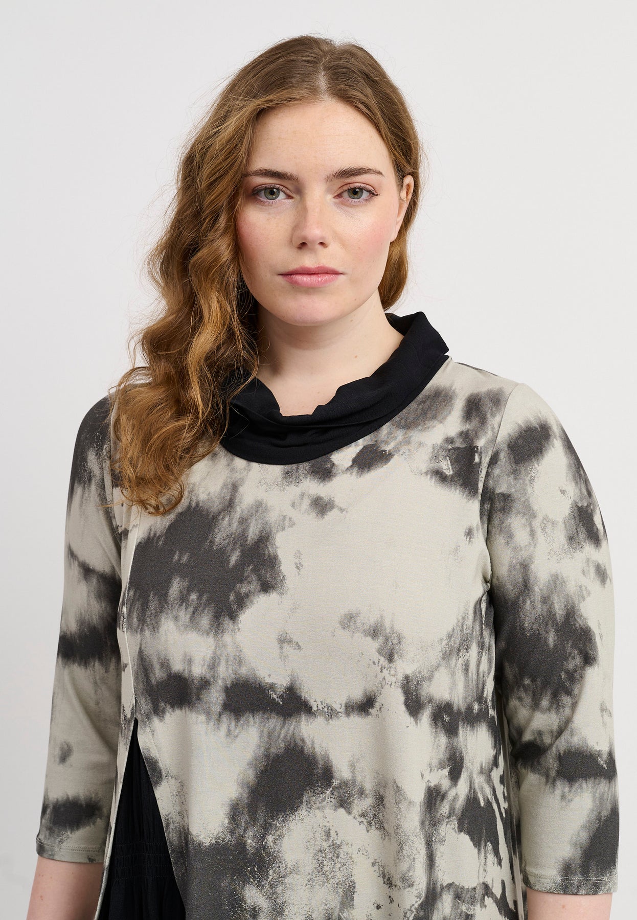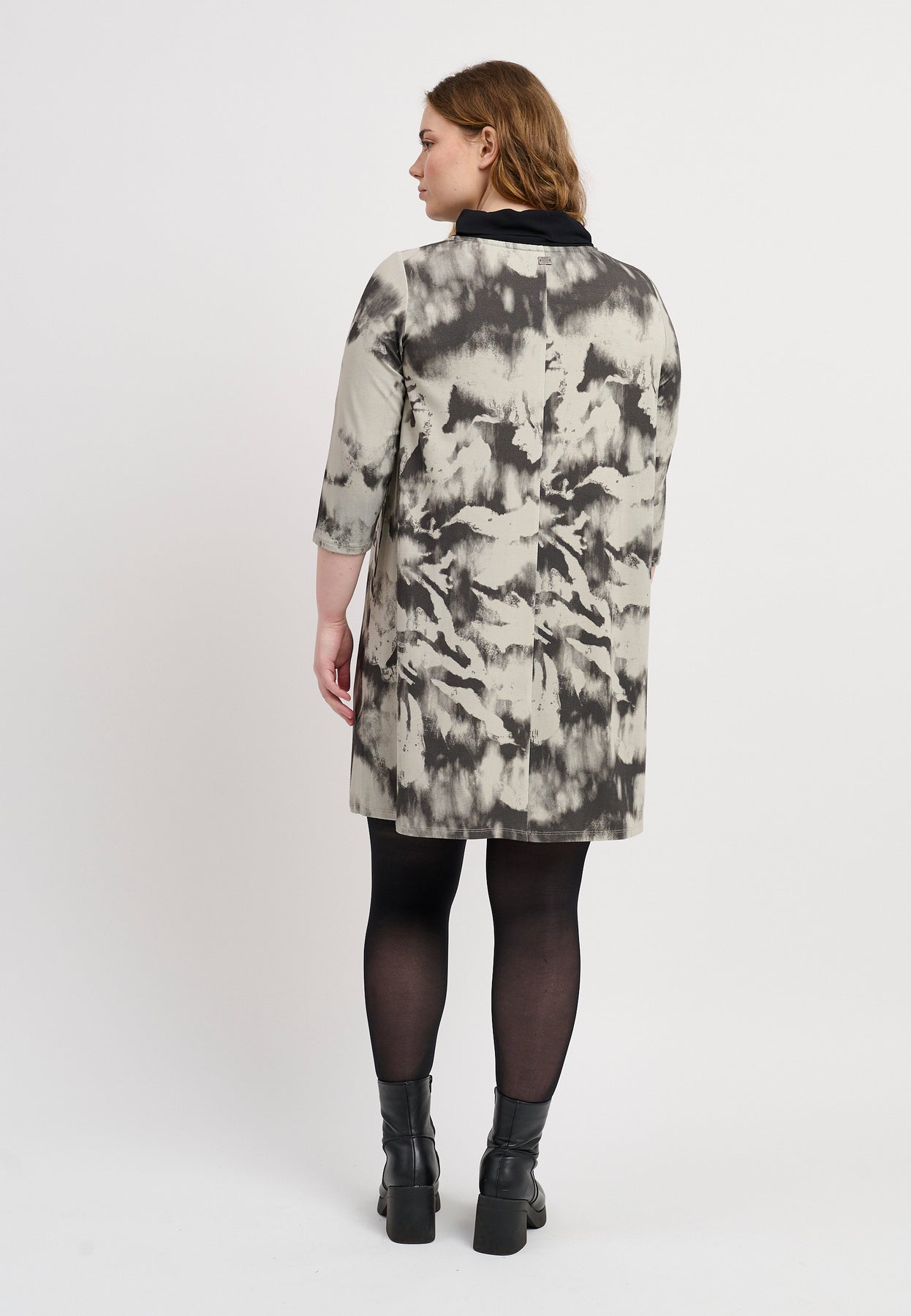 En moderne tunika med A-formet pasform og et iøjnefaldende, grafisk mønster. Den bløde viskosejersey med elastan giver en behagelig strækbarhed og en flatterende silhuet, der følger kroppen uden at stramme. De lange ærmer og den gode længde gør tunikaen alsidig til både hverdagsbrug og særlige lejligheder.