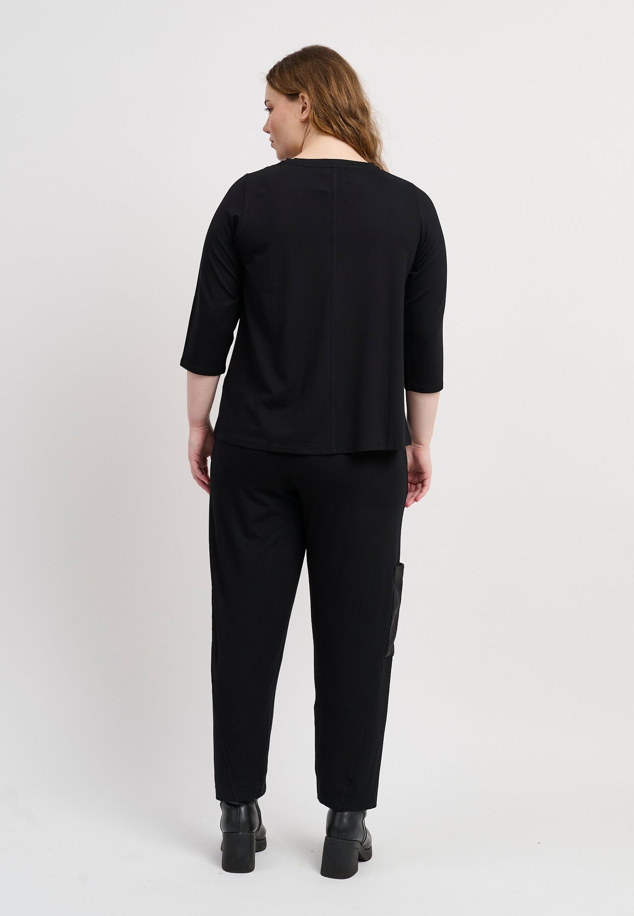 En klassisk sort bluse med et moderne tvist i form af dekorative detaljer foran, der skaber struktur og et spændende udtryk. Blusen har en lige pasform med 3/4-ærmer og en rund hals, og den er fremstillet i en blød og strækbar jerseykvalitet, som giver maksimal komfort hele dagen. Det diskrete design gør den nem at style og anvendelig til både hverdagsbrug og pænere lejligheder.