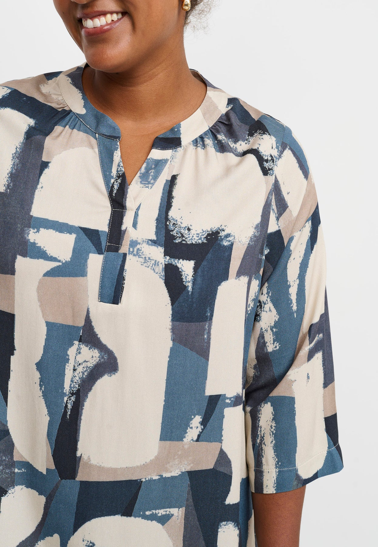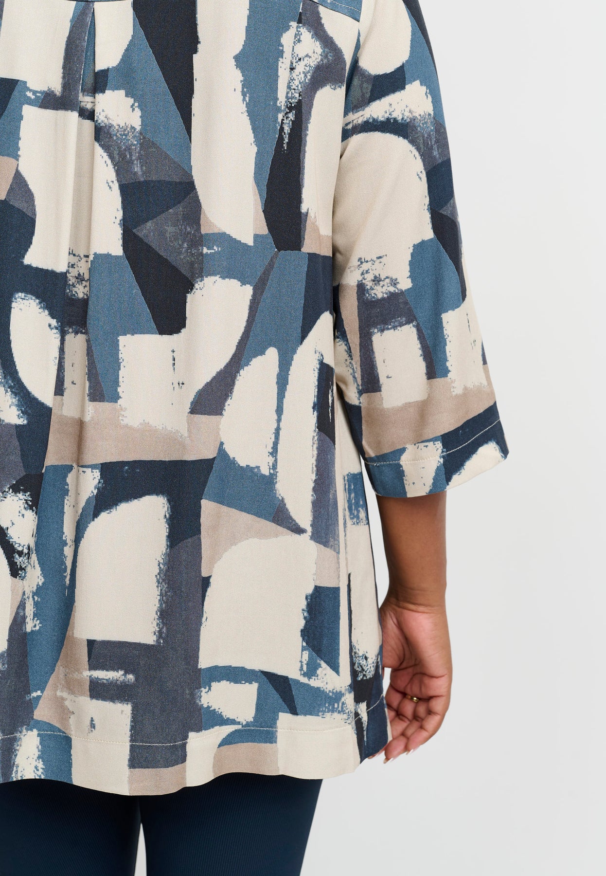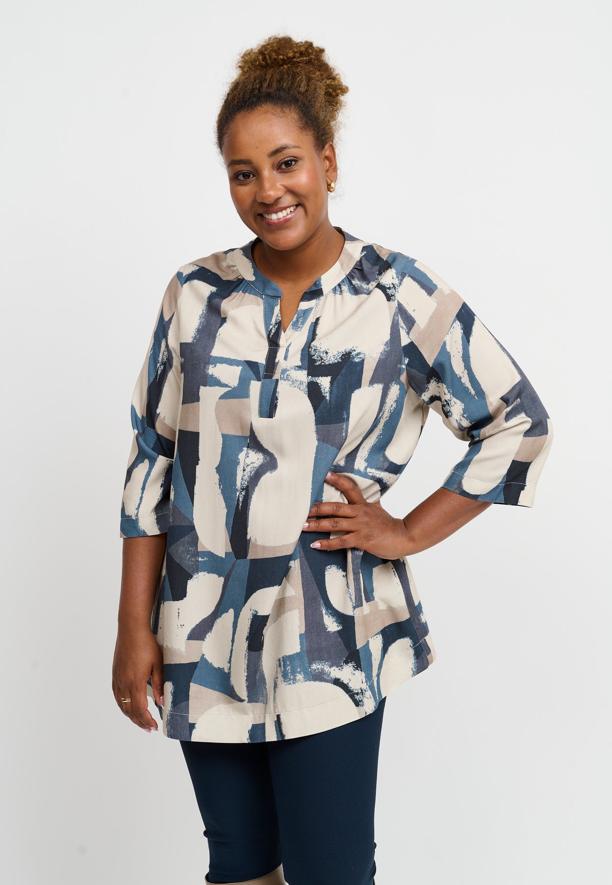 En let og feminin bluse med A-formet snit og et spændende grafisk print i harmoniske nuancer. Modellen har en løs pasform, som falder flot om kroppen, og den bløde viskosekvalitet gør den behagelig at have på – perfekt til både hverdag og mere pyntede lejligheder. Krave og knapper foran tilfører et klassisk touch til det moderne design.
