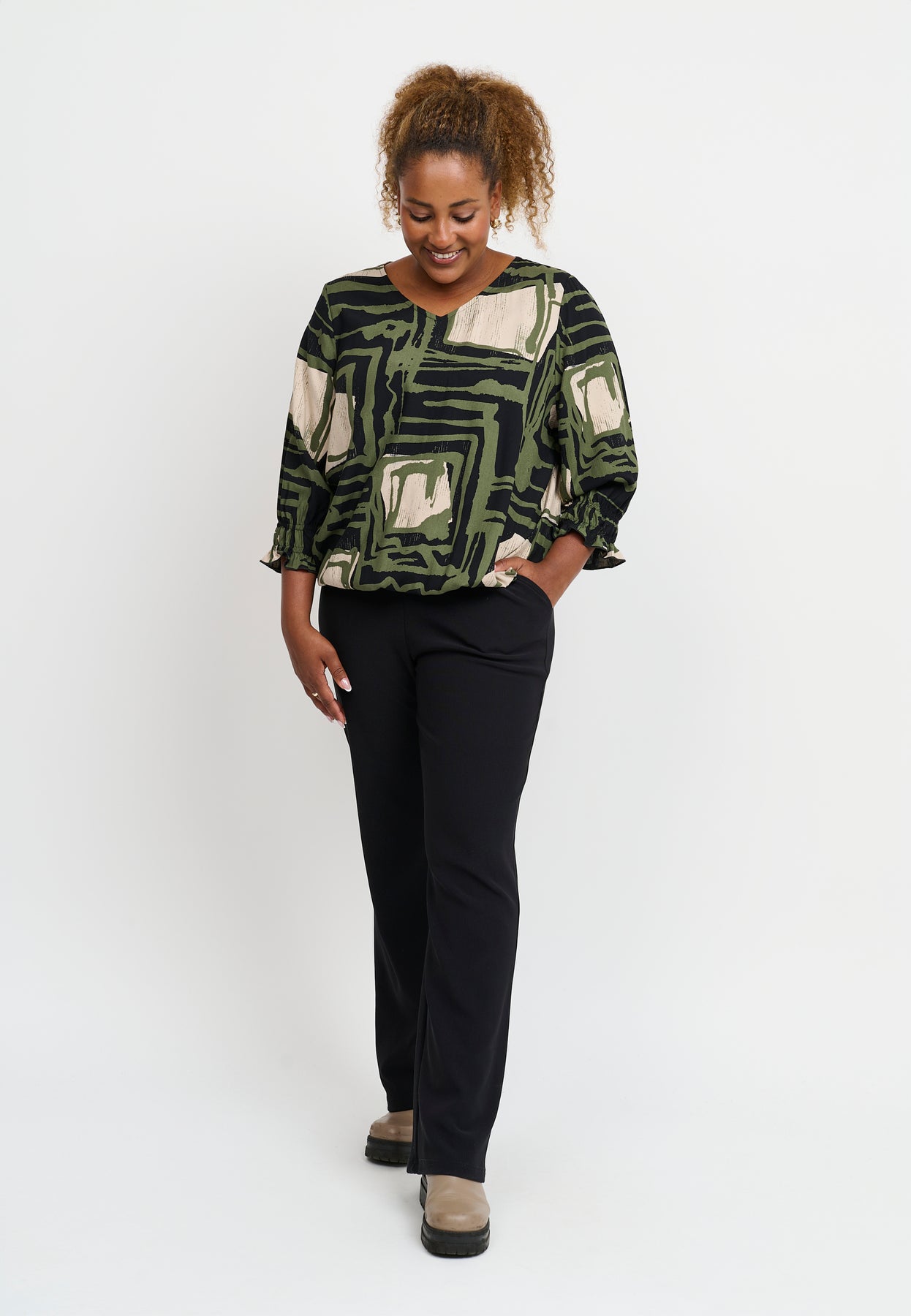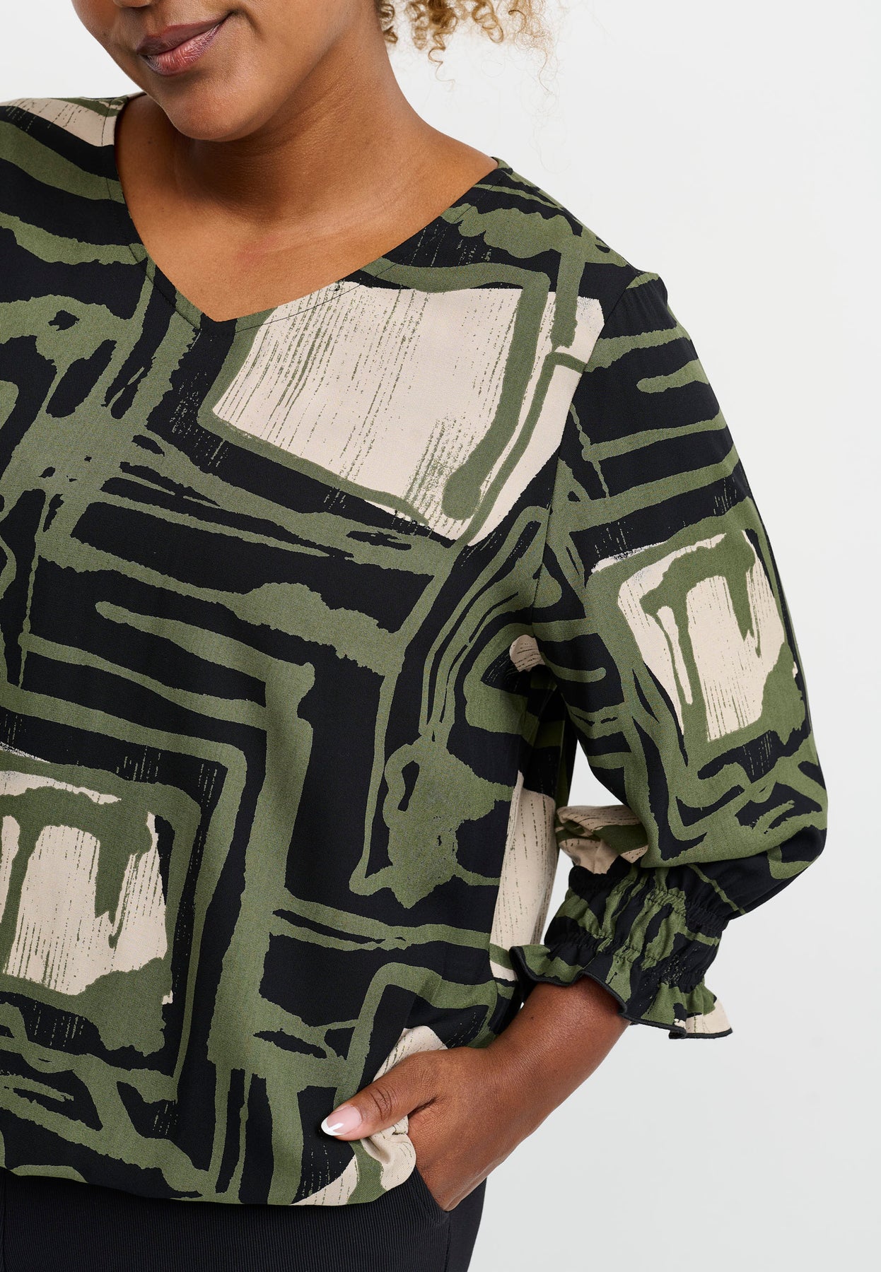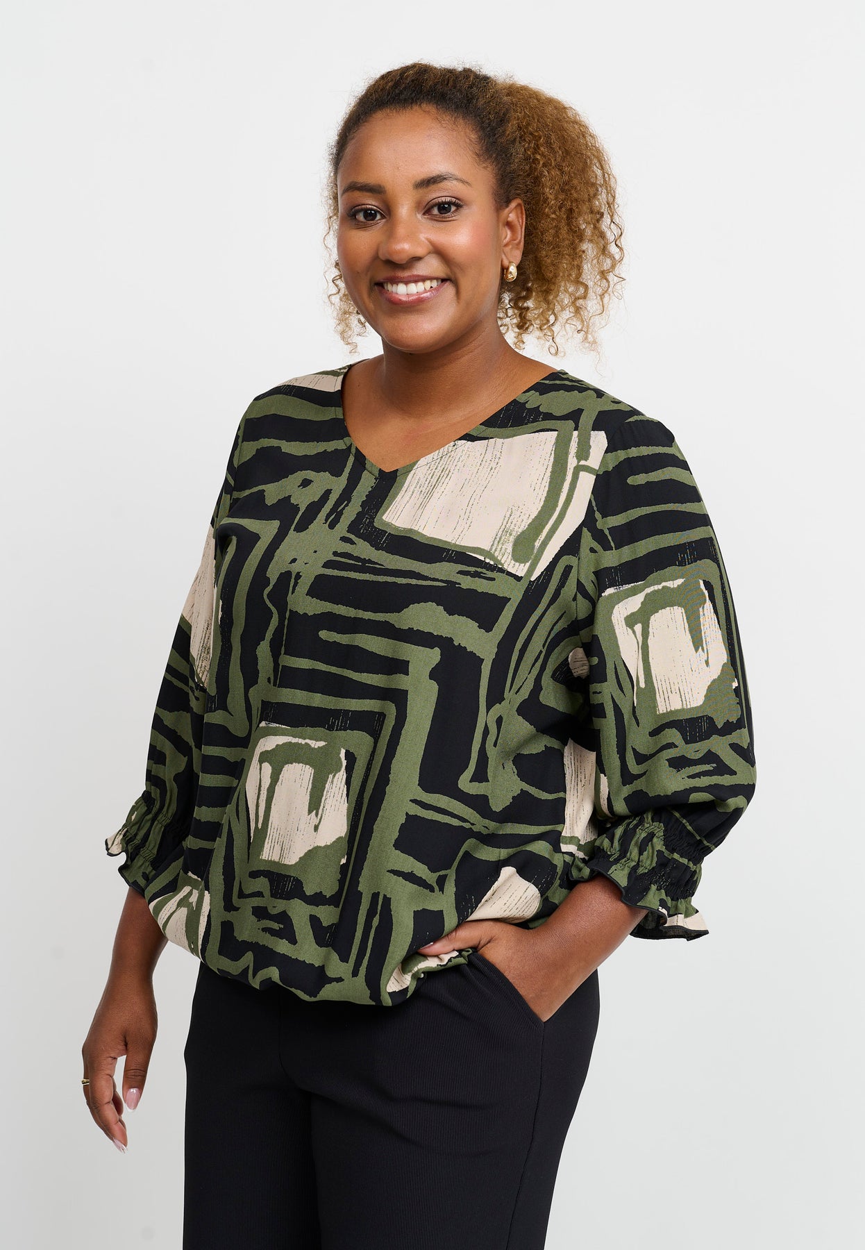 En stilfuld og moderne bluse med et grafisk print i grønne og sorte nuancer. Blusen har en flatterende ballon-effekt forneden, som giver volumen og en let afrundet silhuet. Den brede, runde hals og trekvartlange ærmer tilfører et afslappet og feminint udtryk. Den rene viskosekvalitet føles blød og let mod huden og sikrer høj komfort hele dagen.