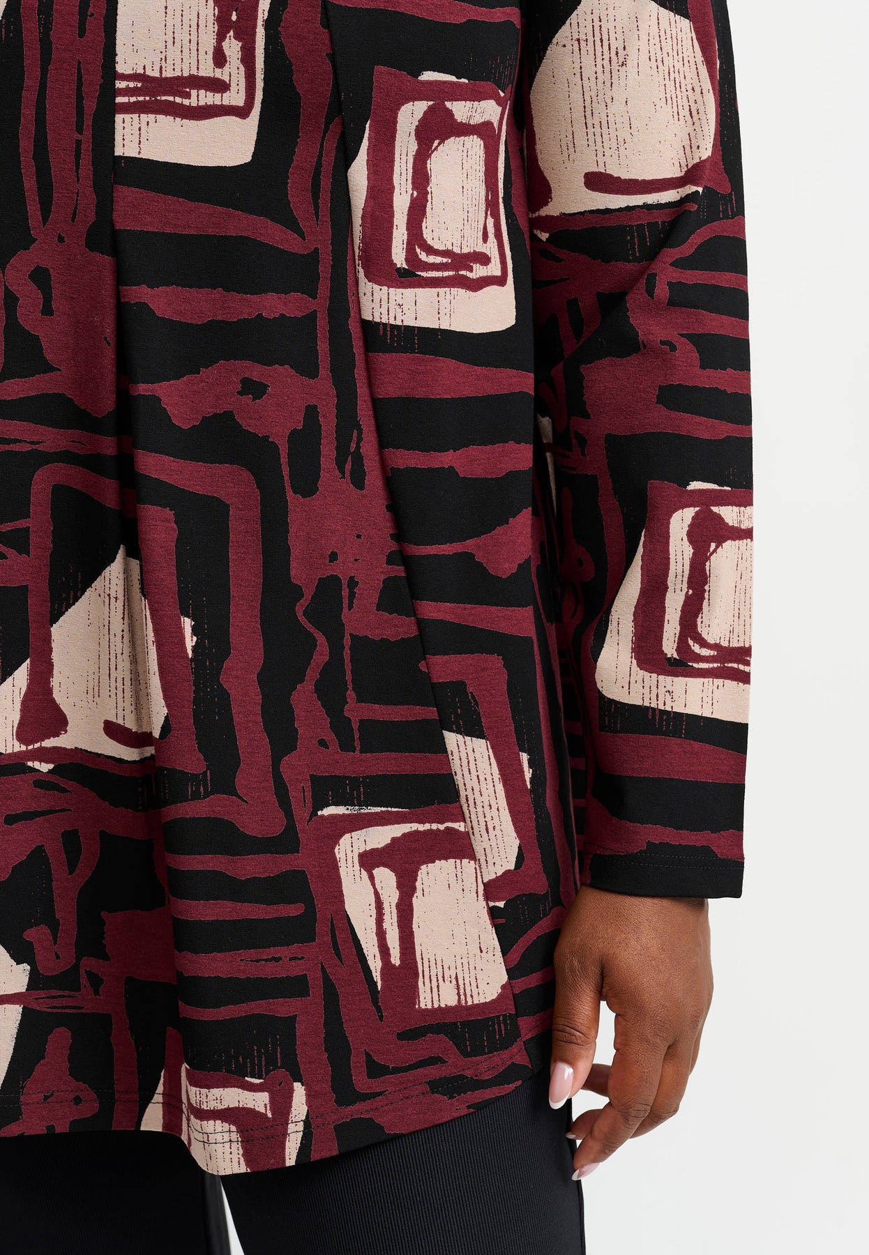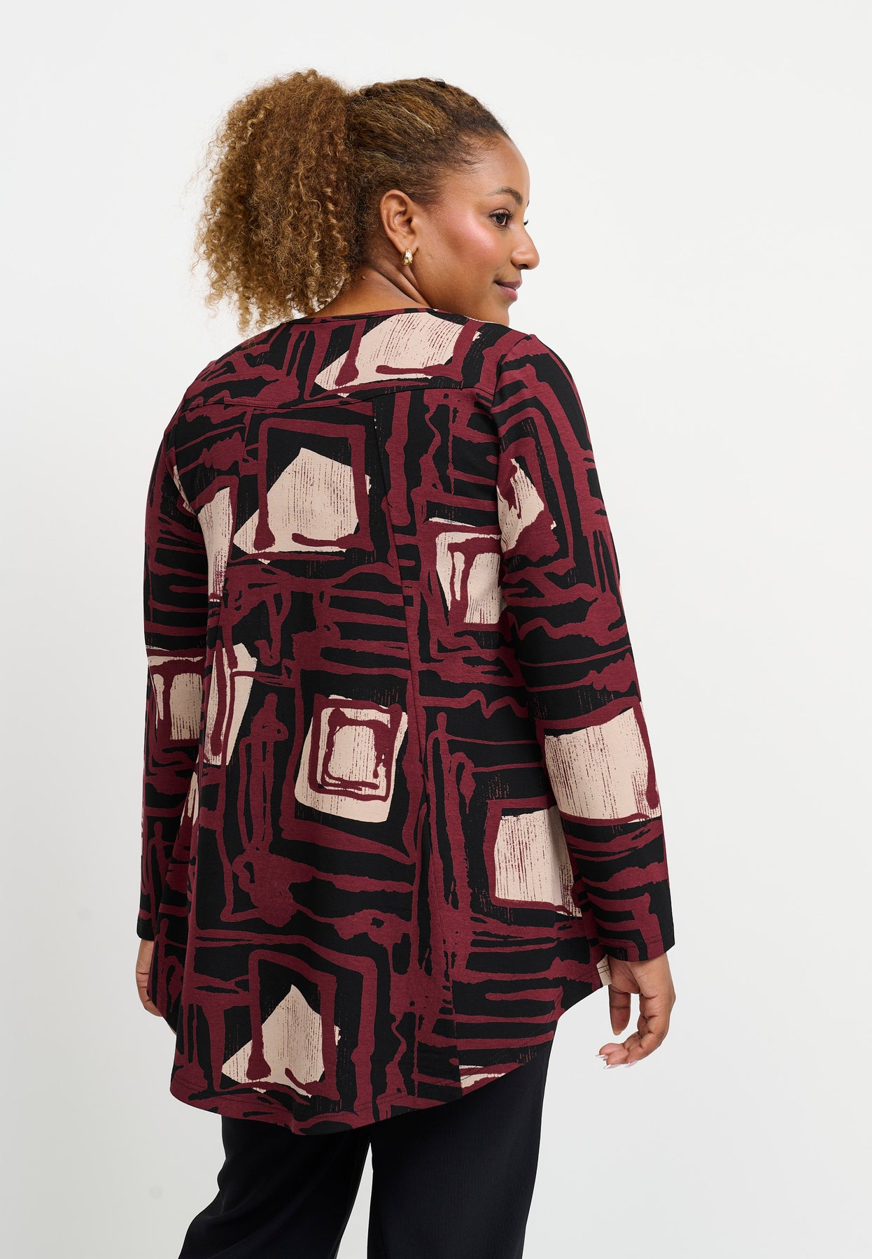 En farverig og flatterende A-formet top med et levende grafisk print i bordeaux og rosa nuancer. Det enkle design med rund hals og lange ærmer gør den let at style til både hverdag og mere festlige lejligheder. Den bløde jerseykvalitet i viskose med elastan giver masser af komfort og bevægelsesfrihed – perfekt til dage, hvor både din personlige stil og velvære er i fokus.