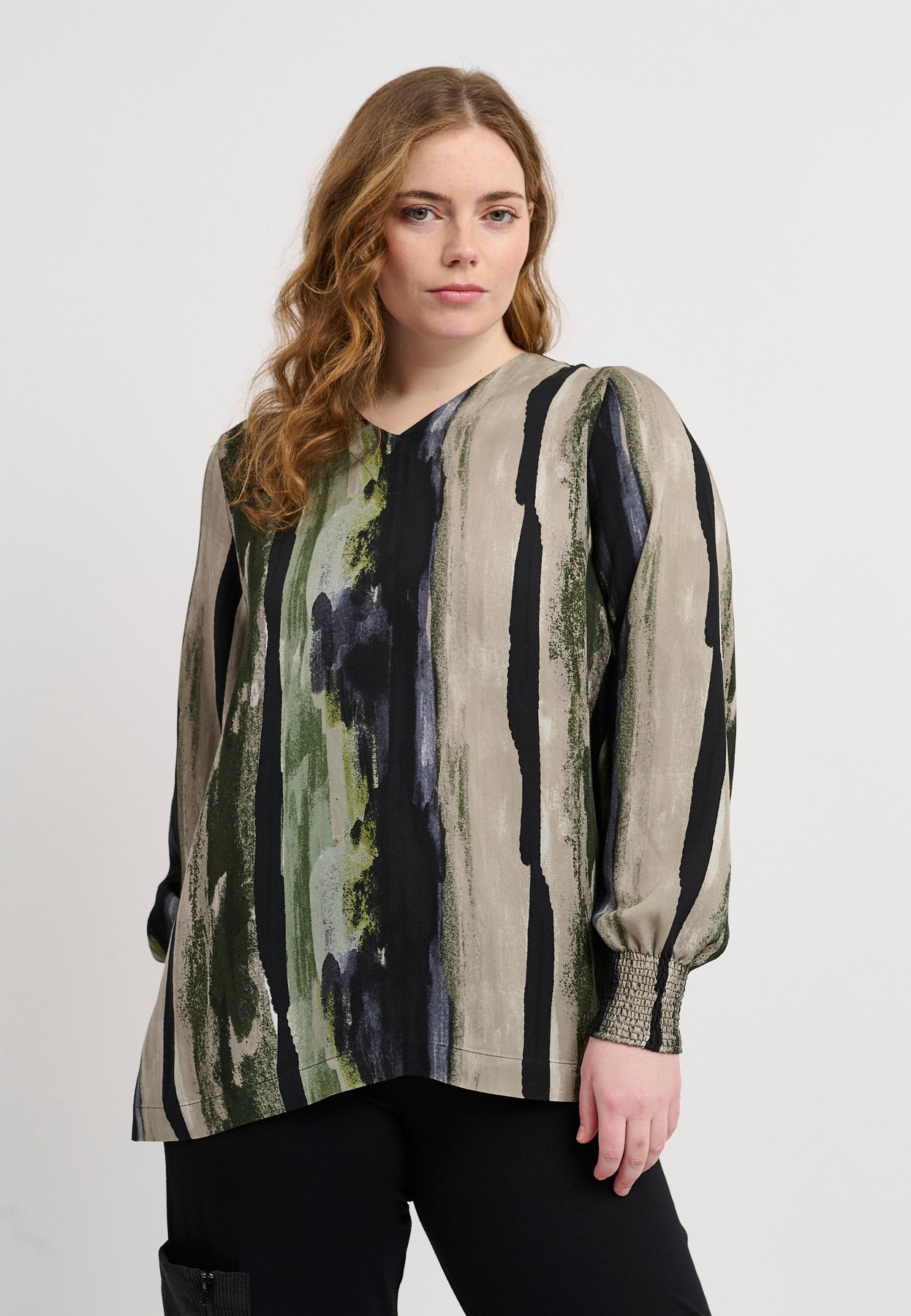 En let og luftig bluse med et kunstnerisk stribeprint i afdæmpede nuancer, der giver et moderne og elegant udtryk. Blusen har en flatterende A-formet pasform, rund hals og lange ærmer med let rynkeeffekt og elastik i kanten. Den fine viskosekvalitet falder flot og føles blød og behagelig mod huden – perfekt til både hverdagsbrug og særlige anledninger.