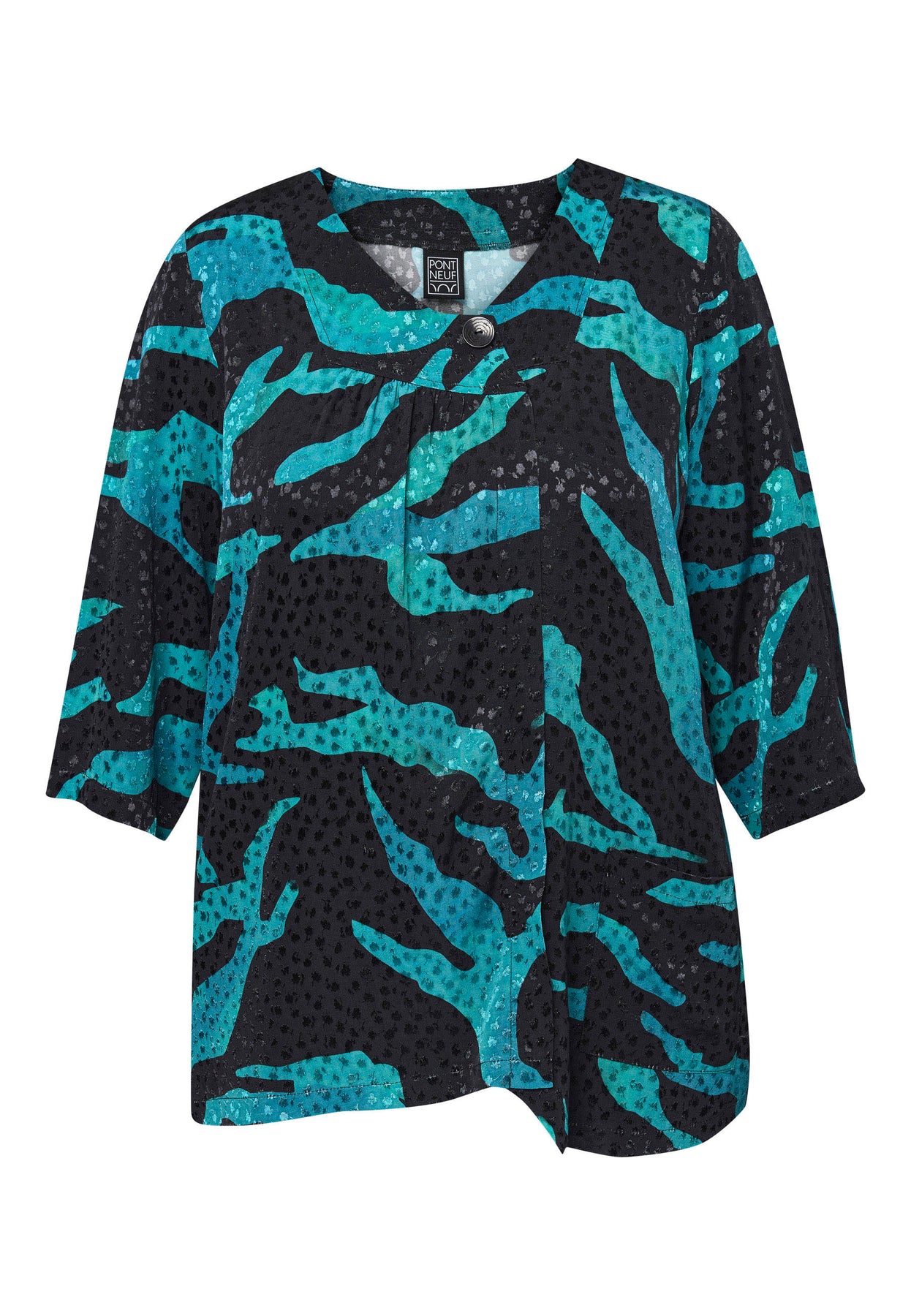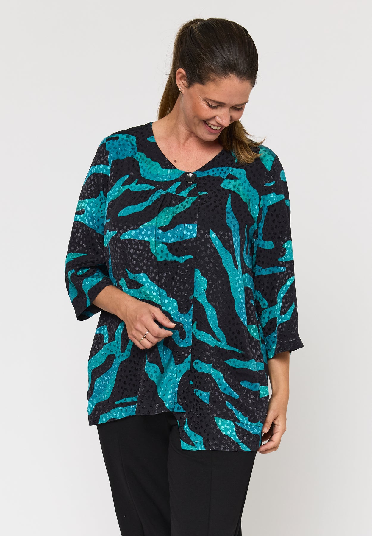 Denne bluse byder på et grafisk print i kontrastfulde nuancer af turkis og sort, der giver et moderne og markant udtryk. Det lige snit giver en enkel silhuet, mens den lette kvalitet i rayon og viskose sikrer et smukt fald og en behagelig fornemmelse. En bluse, der både fanger øjet og føles let at have på.