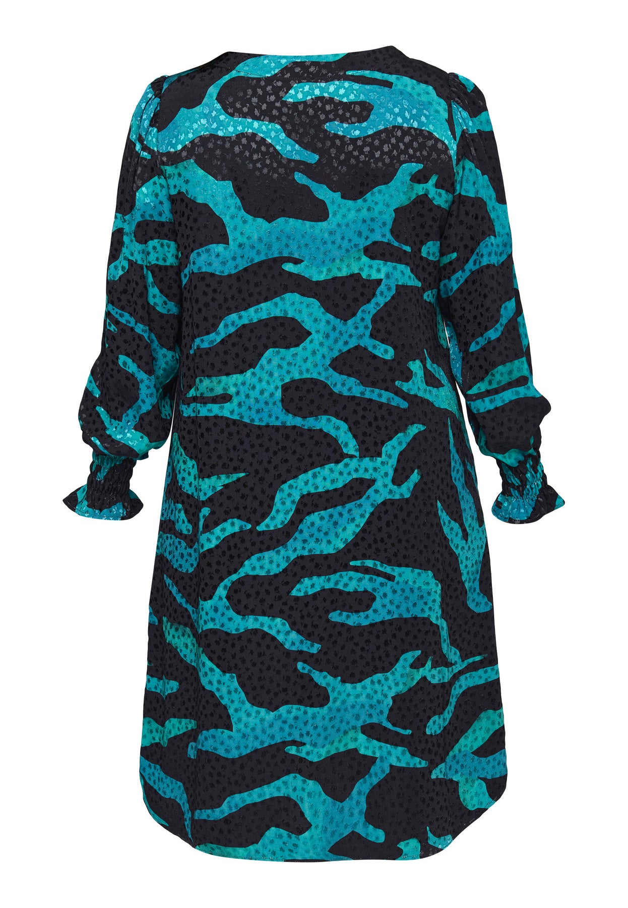 Med sit grafiske mønster og den klassiske A-form får denne kjole et både moderne og feminint udtryk. Den runde hals og de lange ærmer skaber en tidløs ramme, mens stoffets lette struktur i rayon og viskose falder smidigt omkring kroppen. En kjole, der hurtigt bliver et naturligt valg i garderoben.