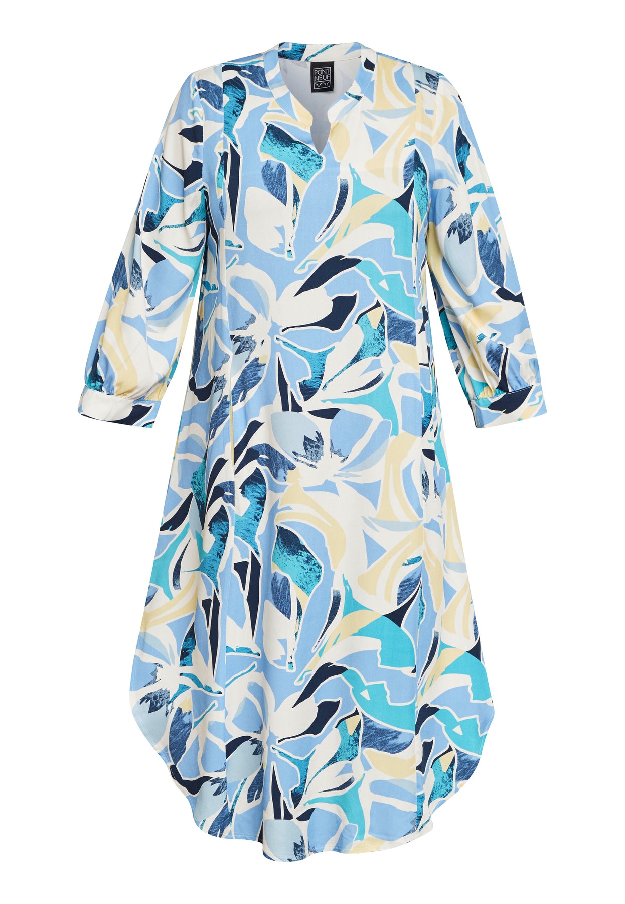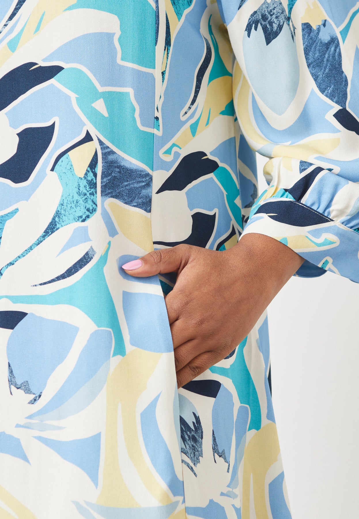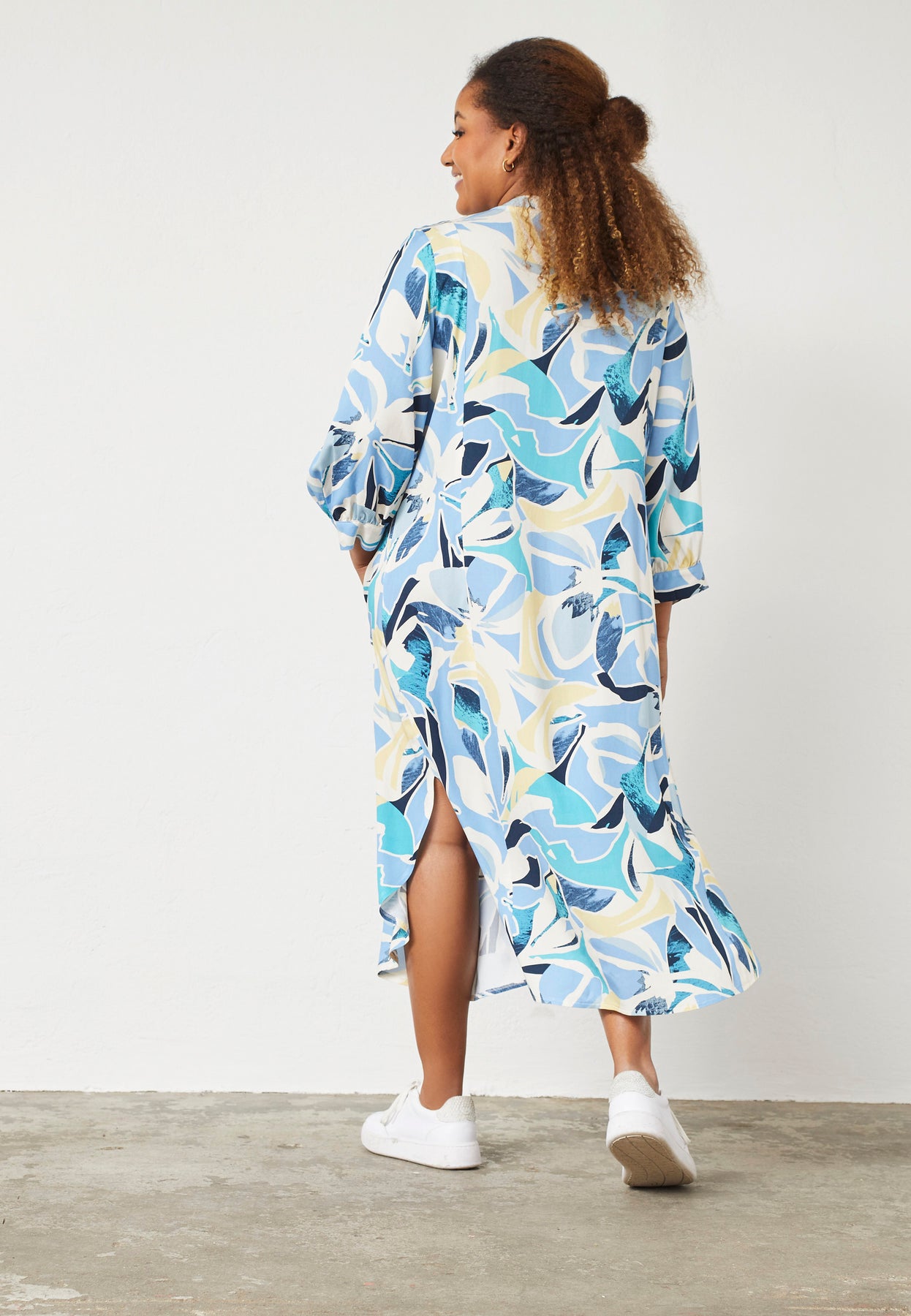 En smuk og luftig kjole med et iøjnefaldende mønster og en elegant, løs pasform. Kjolen er fremstillet i ren viskose, hvilket giver en let og åndbar fornemmelse, perfekt til varmere dage. Det lange A-formede snit sikrer et flot fald, mens skjortekraven og de diskrete knapper tilfører et klassisk udtryk. De lange ærmer med en løs silhuet understreger det afslappede, men stilfulde look.