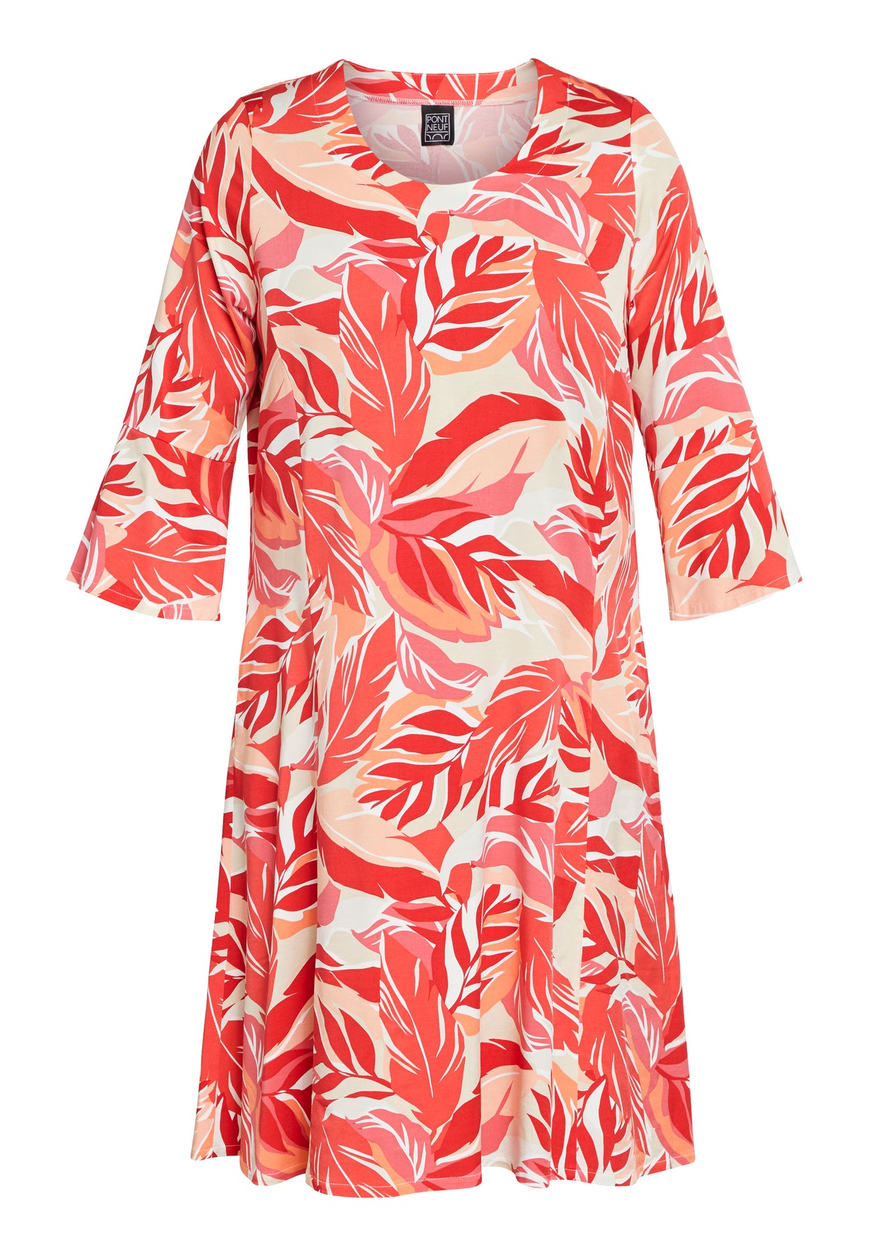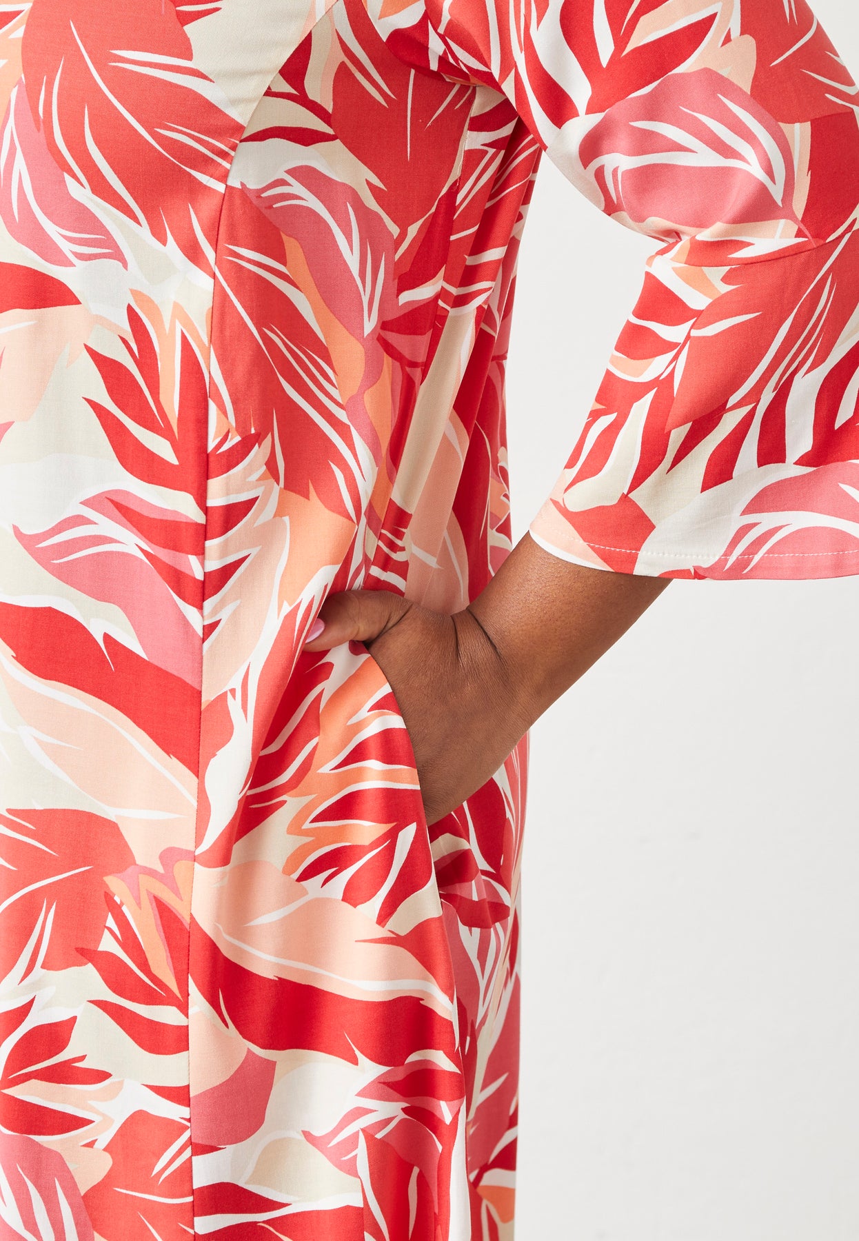 En smuk kjole med et livligt mønster og en behagelig pasform. Stoffet har en let strækbar kvalitet, der giver god bevægelsesfrihed, mens det A-formede snit sikrer en flatterende silhuet. De lange, let vide ærmer og den afslappede pasform skaber et moderne og stilfuldt udtryk. Det iøjnefaldende print tilfører et feminint og legende touch, perfekt til både hverdag og festlige lejligheder.