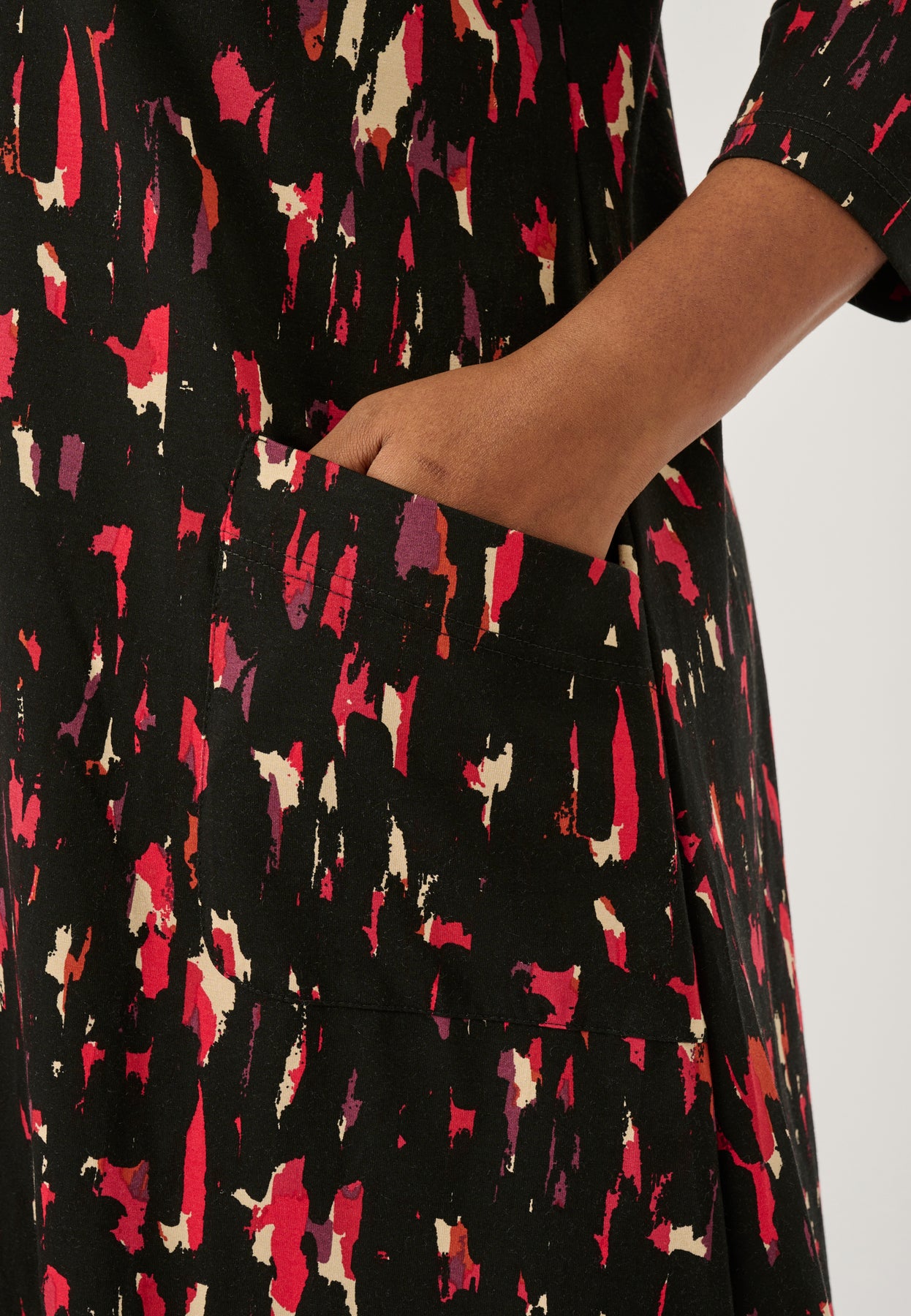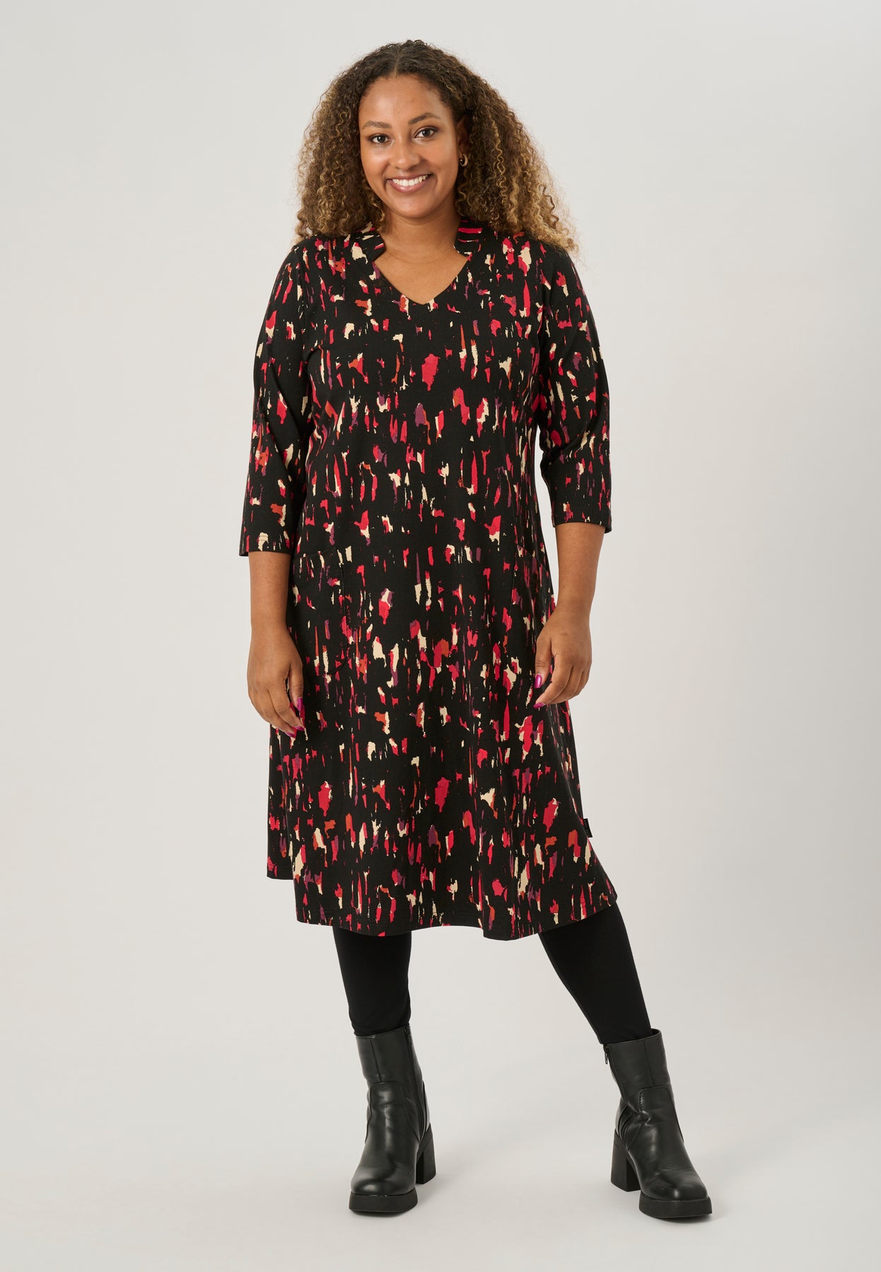 Smuk kjole med en feminin og unik halsudskæring og ¾-lange ærmer. Den har et abstrakt design i de fineste, mørke farver, der passer perfekt til vintersæsonen. Kjolen er udført i en lækker viskosekvalitet med stræk, og den har en A-formet pasform.