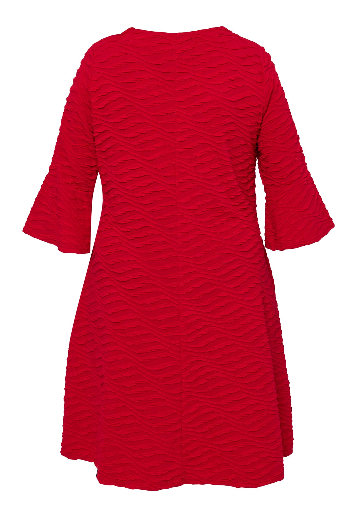 En enkel og stilfuld kjole med et moderne, afslappet snit. Den har rund hals, korte ærmer og en løs A-form, der giver god bevægelsesfrihed og et flot fald. Stoffet har en fast, elastisk kvalitet, som holder formen flot og samtidig føles blødt og komfortabelt mod kroppen.