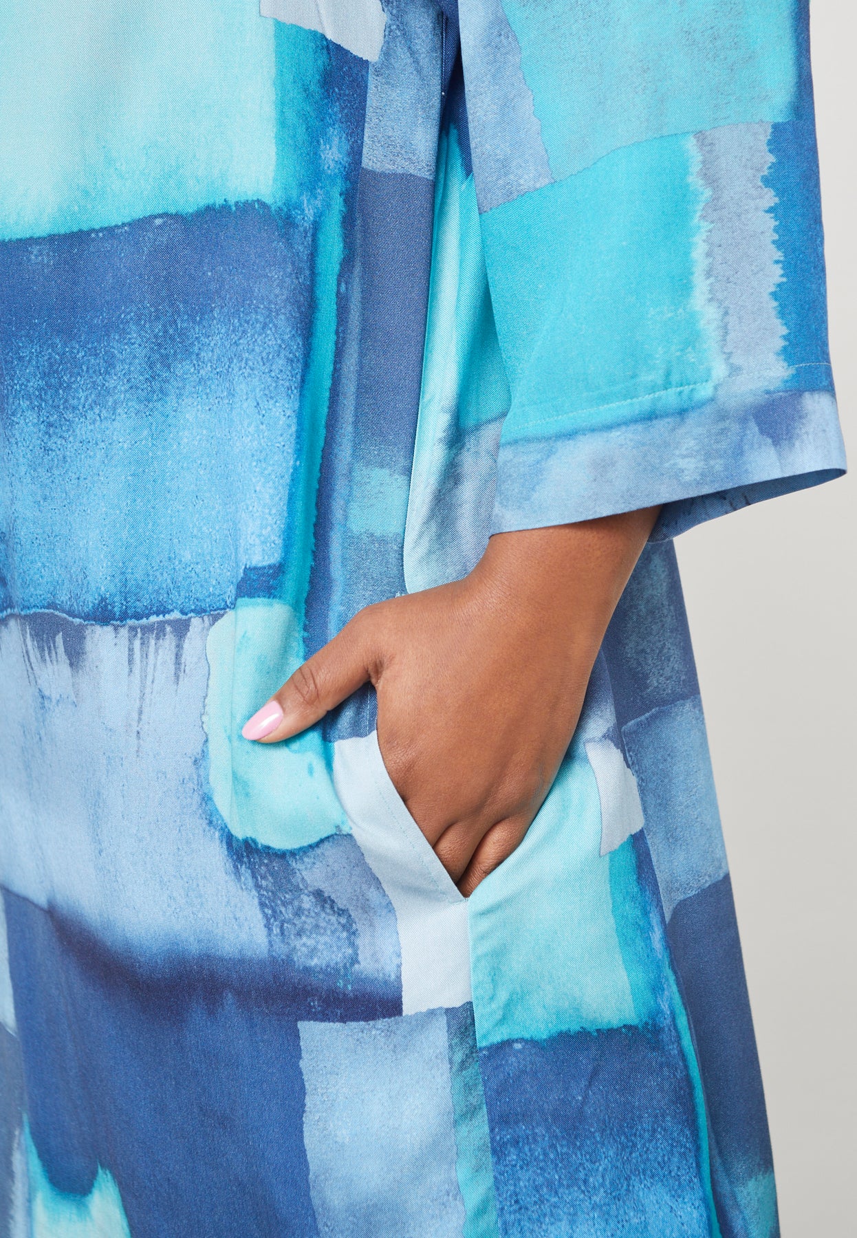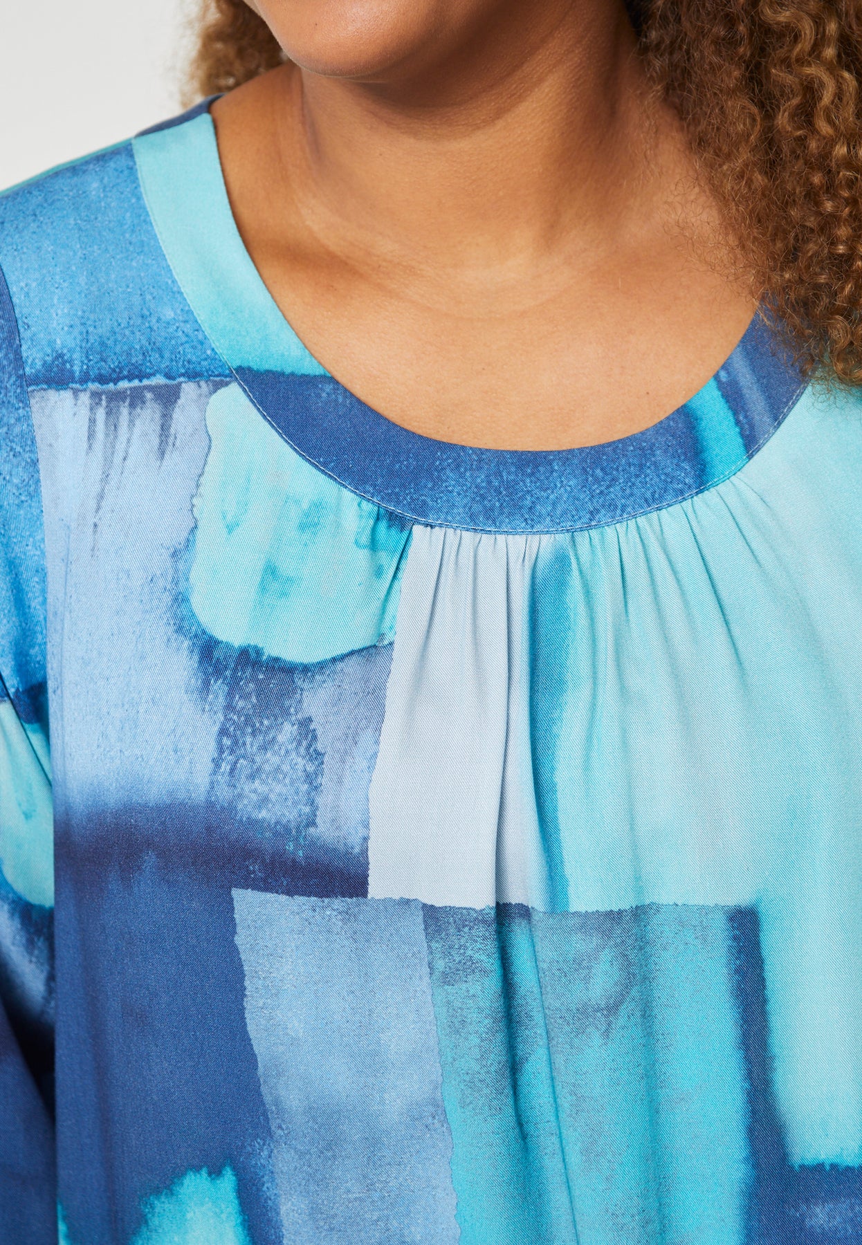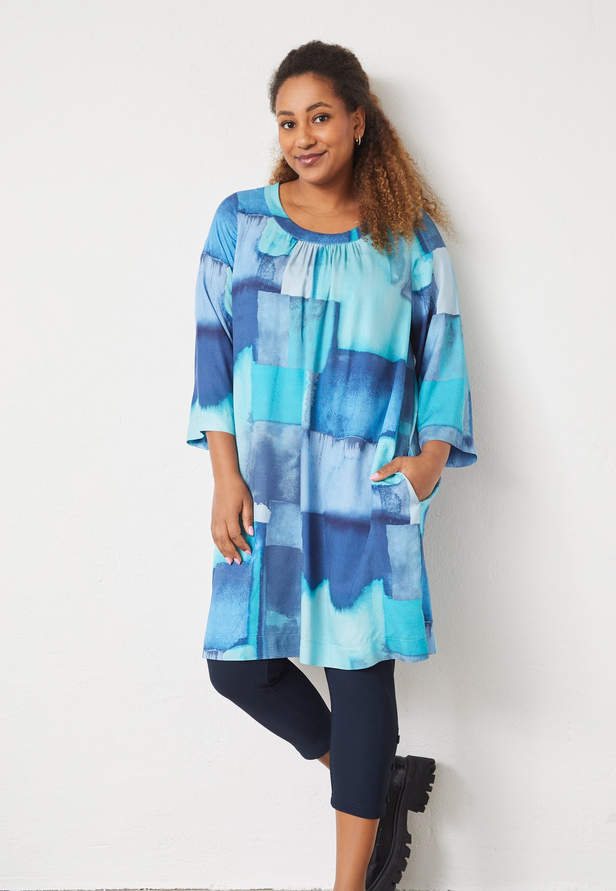 En farverig og kunstnerisk tunika i en flatterende A-form, perfekt til dig, der ønsker komfort uden at gå på kompromis med stilen. Det bløde viskosemateriale falder let og føles behageligt mod huden. Tunikaen har rund hals, trekvartlange ærmer og et længere snit, der gør den ideel til både leggings og smalle bukser.