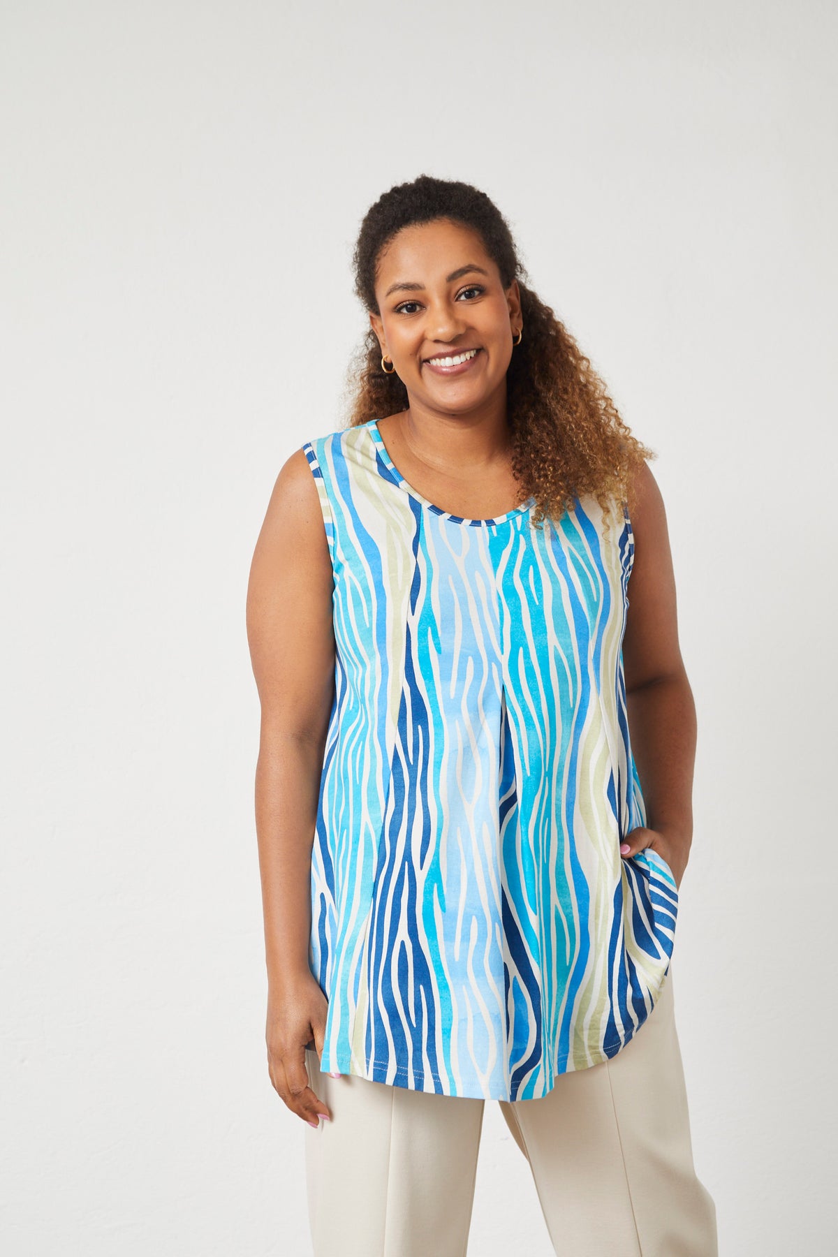 En frisk top med et levende blåt print, der bringer tankerne hen på sommer, hav og frihed. Den har en løs og flatterende A-form, rund halsudskæring og brede stropper, som giver et luftigt og feminint udtryk. Kvaliteten er blød og let strækbar, hvilket gør den utrolig behagelig at have på.