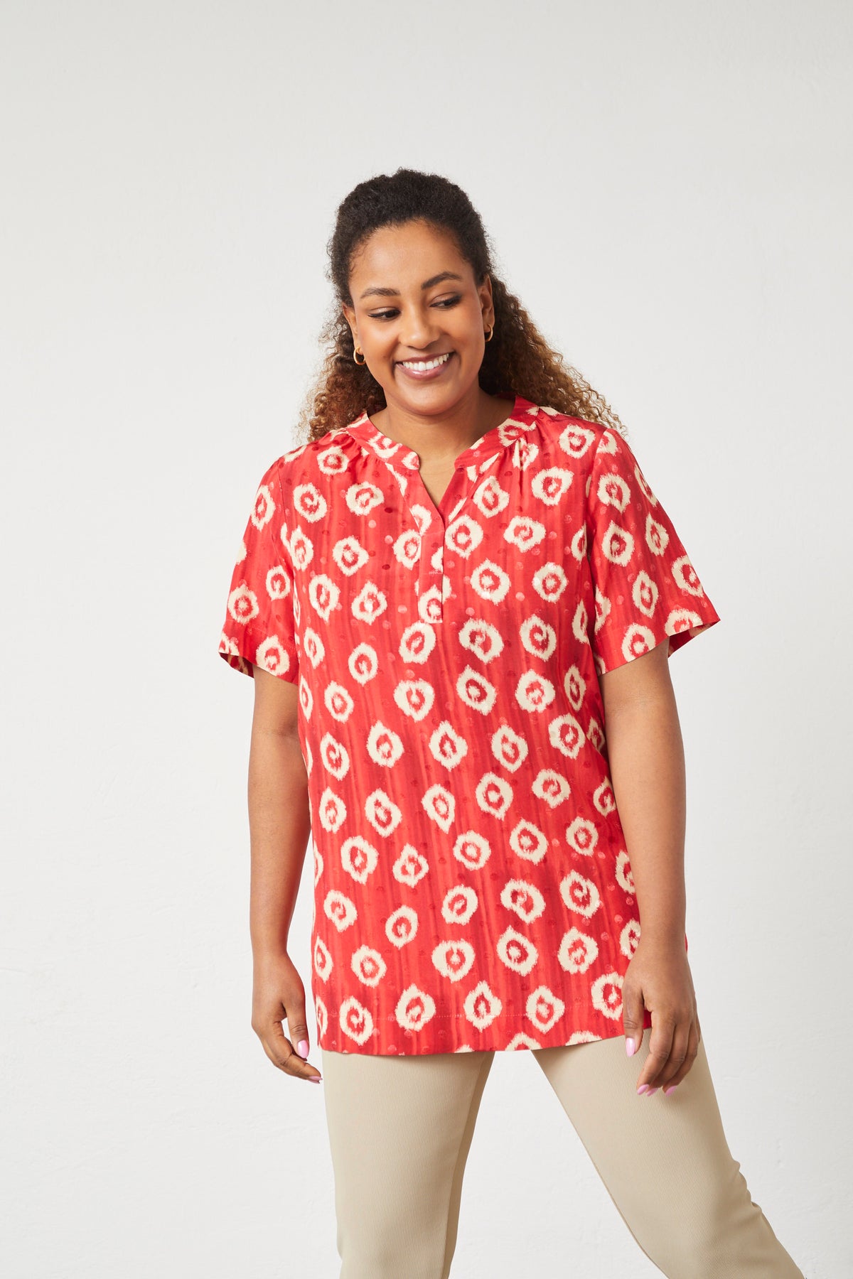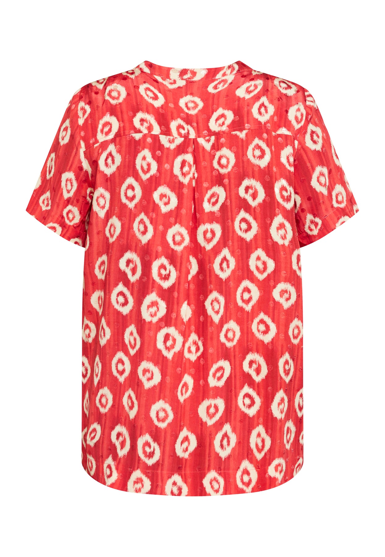 Feminin og afslappet top med et legende blomsterprint og en behagelig silhuet. Den har korte ærmer og en åben V-hals, som skaber et let og luftigt udtryk – perfekt til både hverdag og feriedage. Det farverige design giver et frisk pust til garderoben.