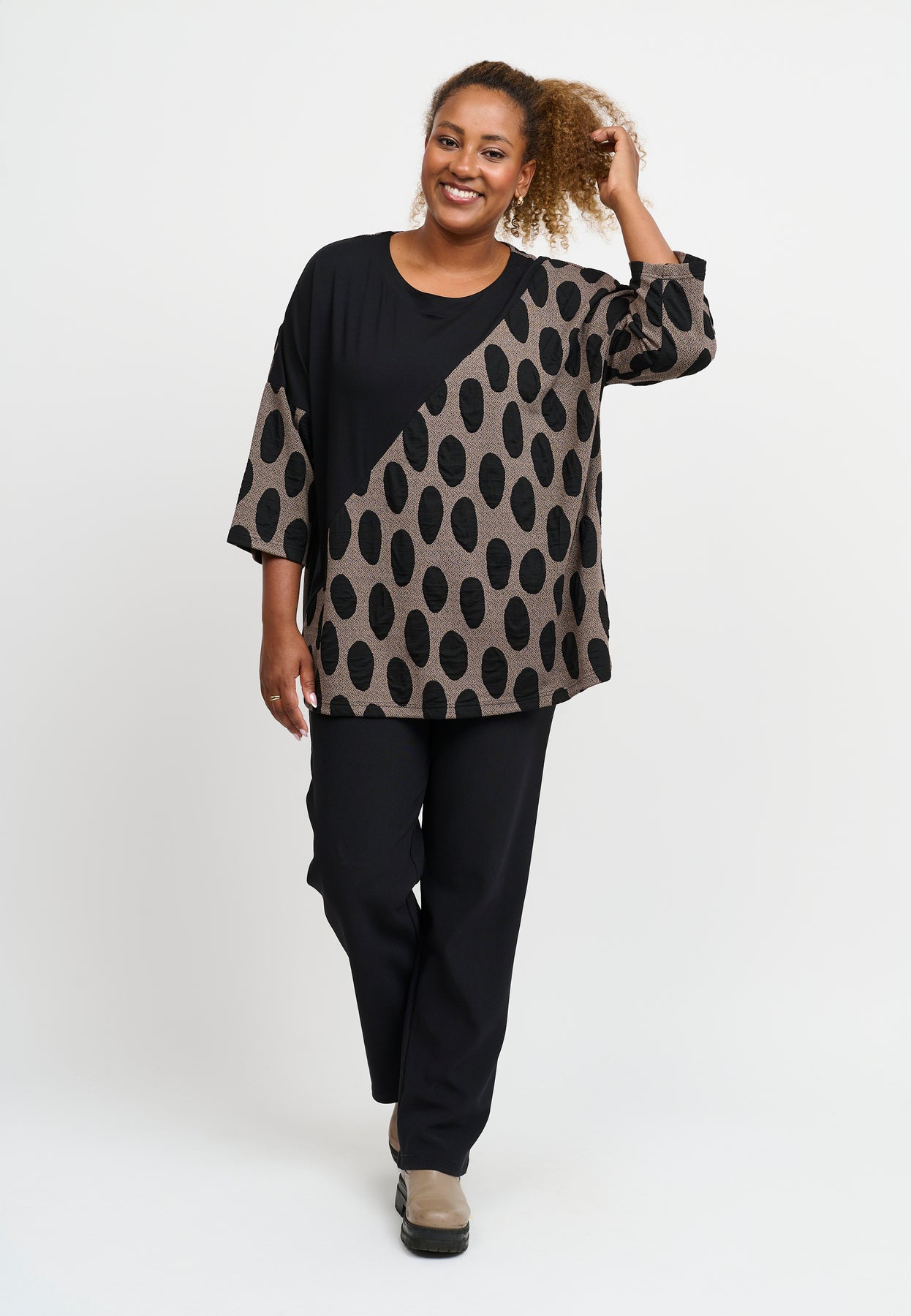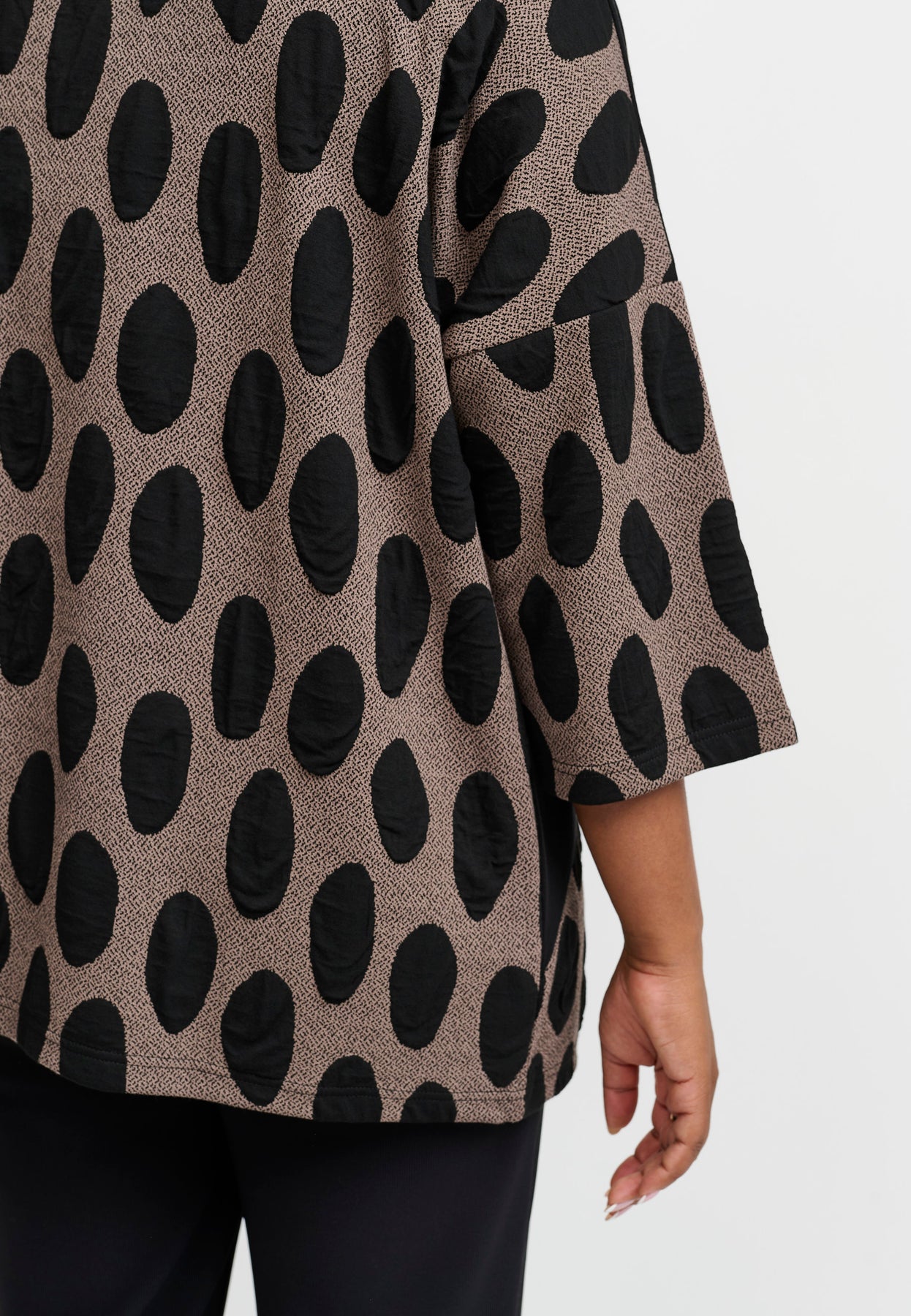 En cool og afslappet bluse med et markant, grafisk prikket print og en rummelig oversize-pasform. Det enkle snit med rund hals og lange ærmer giver plads til bevægelse og gør den nem at style til både hverdagsbrug og hyggelige lejligheder. Den bløde jerseykvalitet i viskose og elastan sikrer en strækbar og behagelig oplevelse hele dagen.